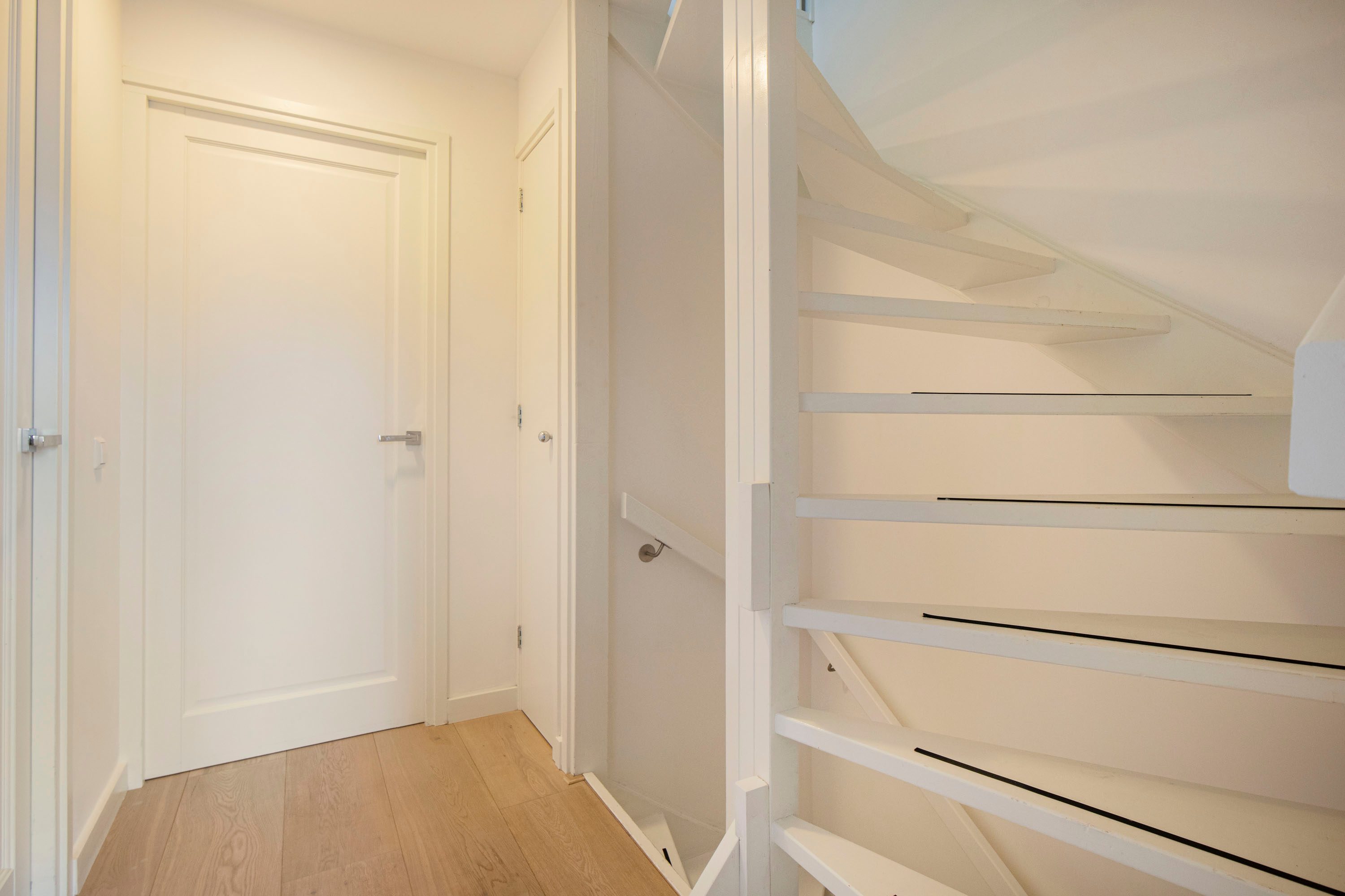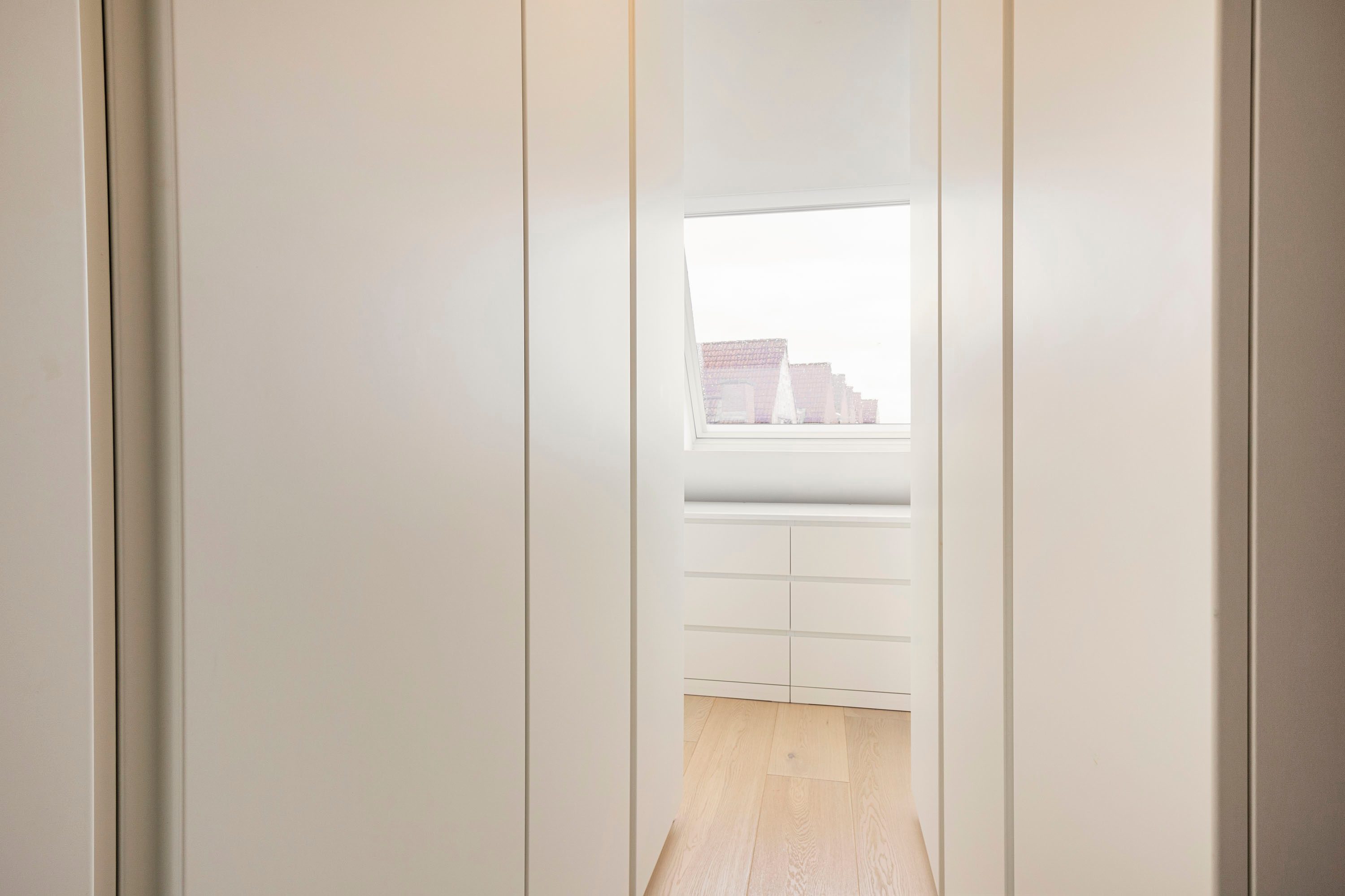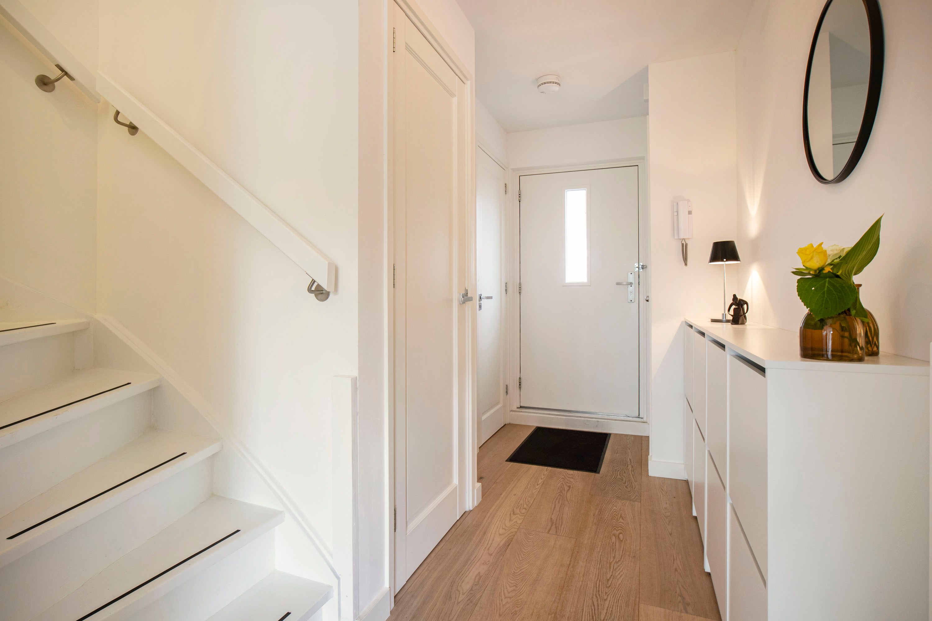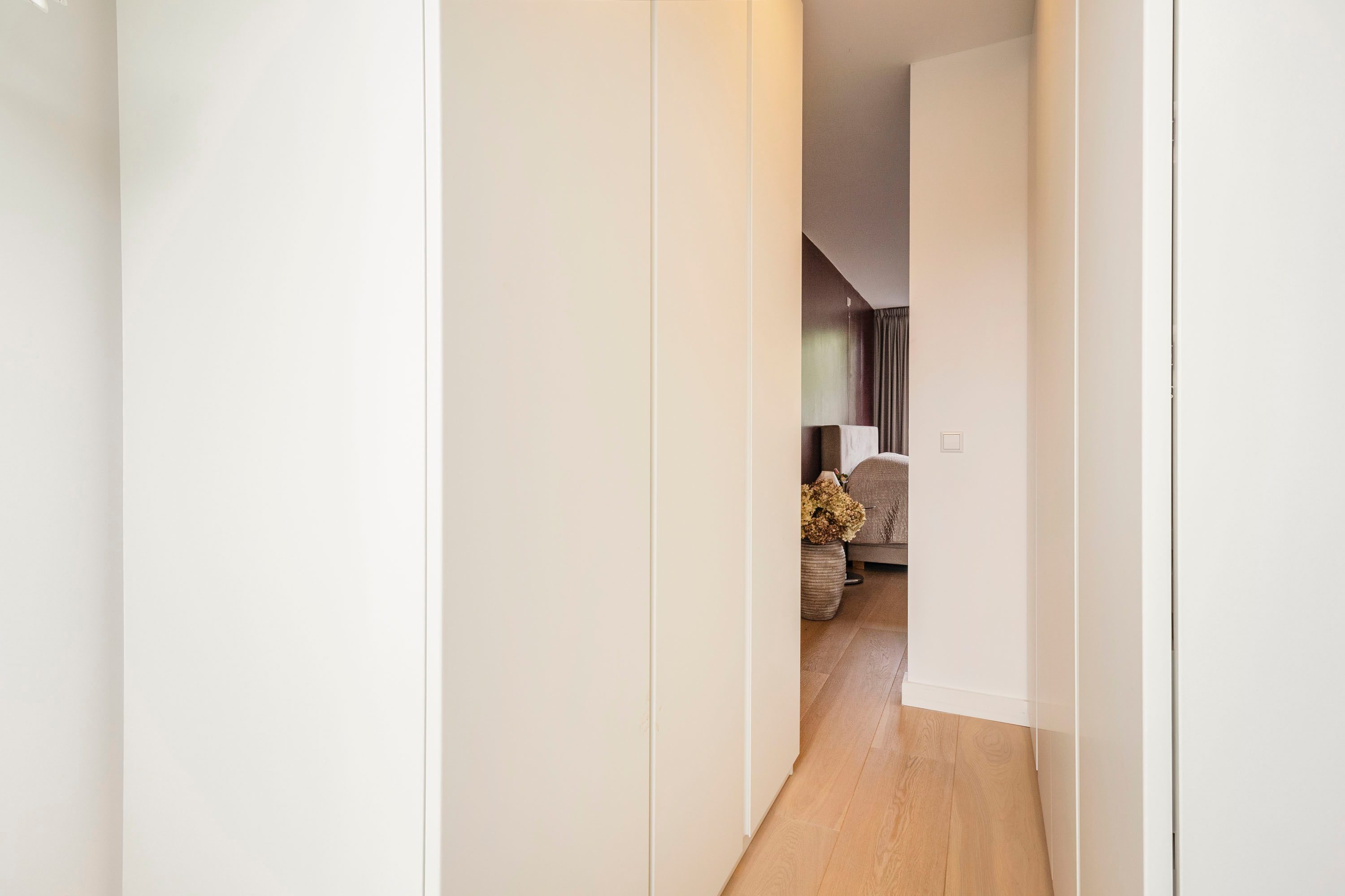 Ruime entree met op maat gemaakte garderobekast. De entree geeft toegang tot een ruime, lichte woonkamer met houten vloer en strak gestucte wanden. Via de openslaande deur stap je zo het balkon op, gelegen op het zonnige zuidoosten — een heerlijke plek om de dag te beginnen met een kop koffie.