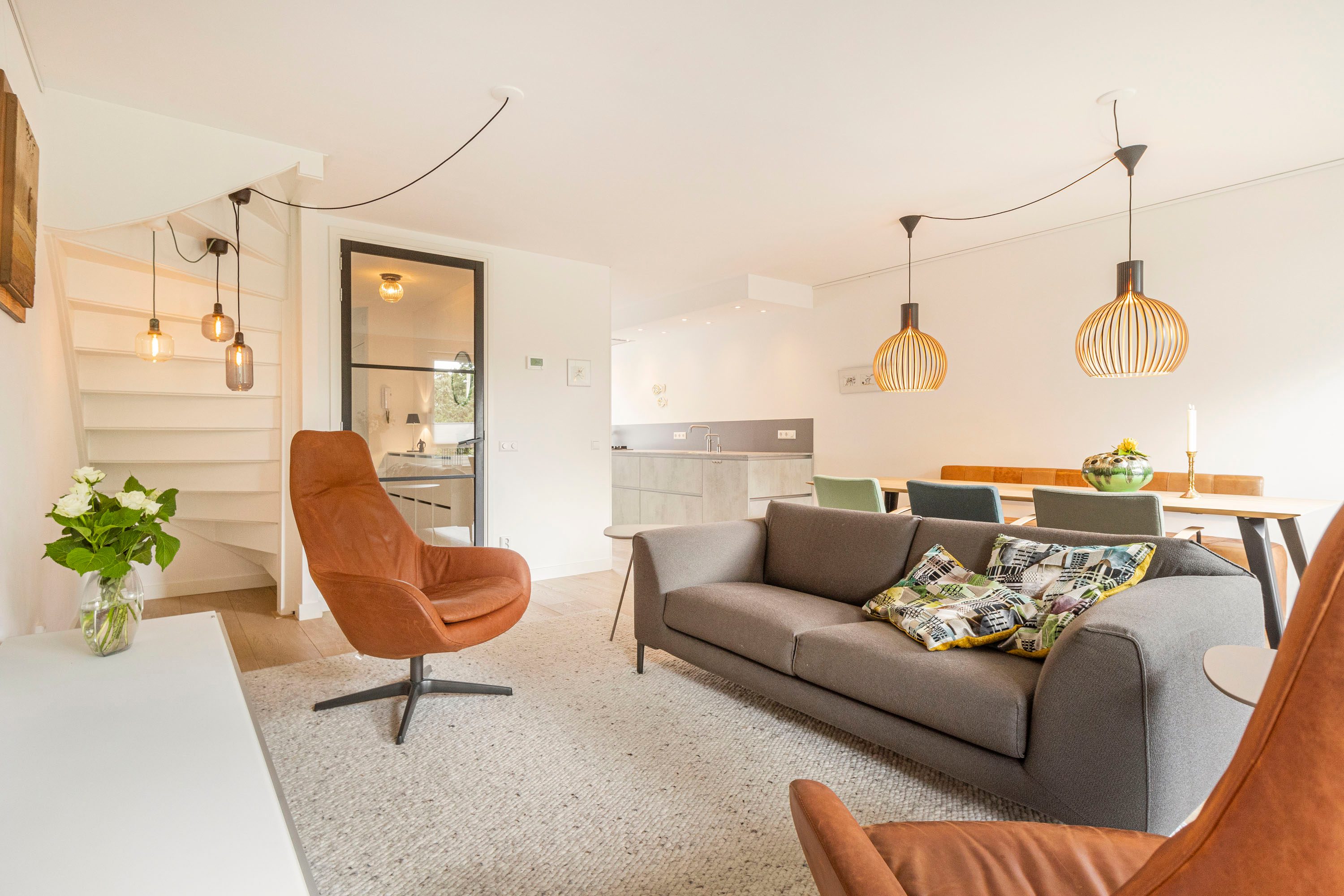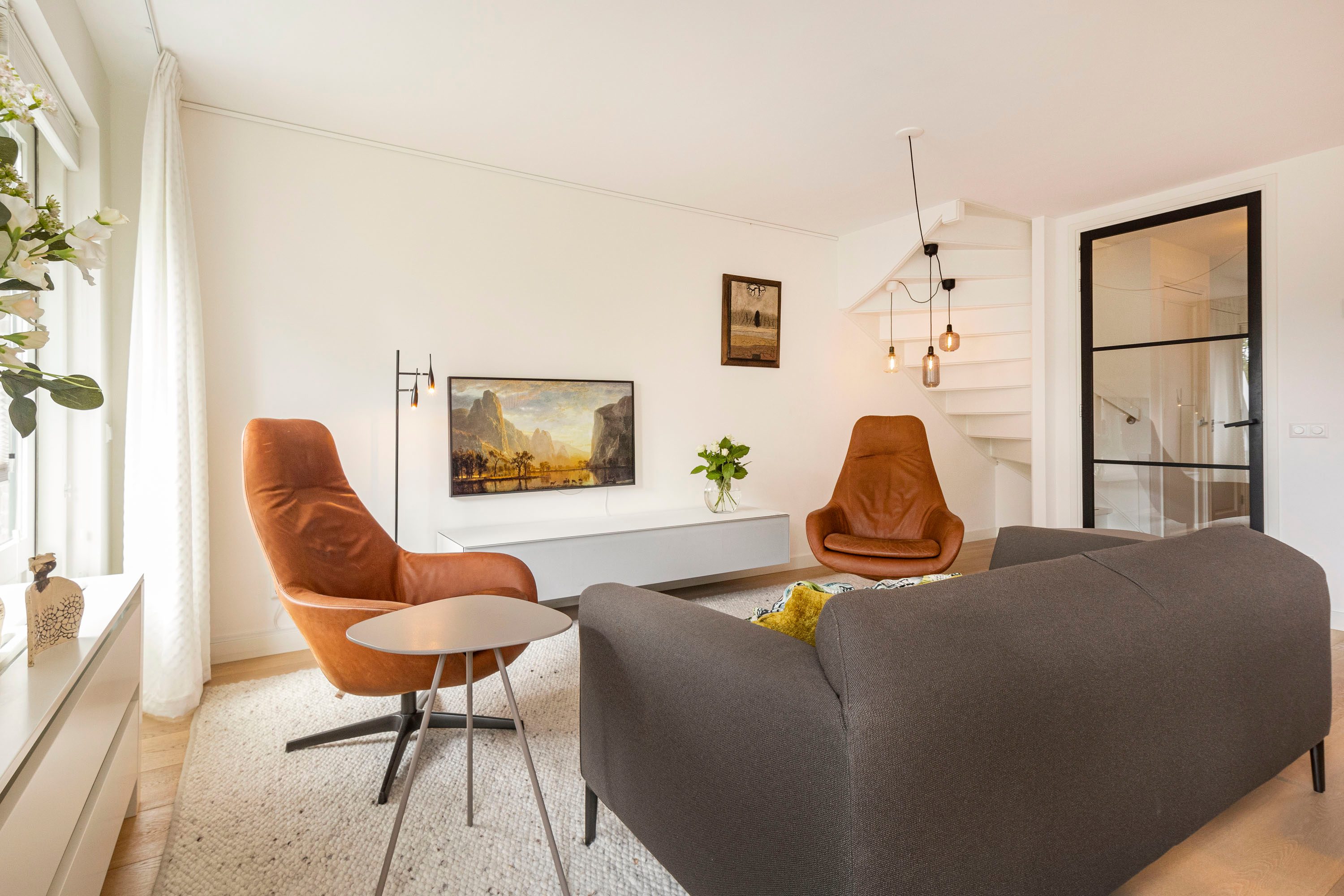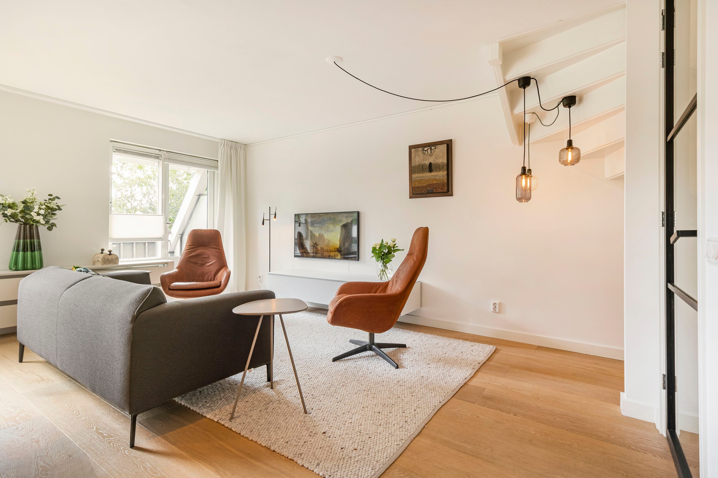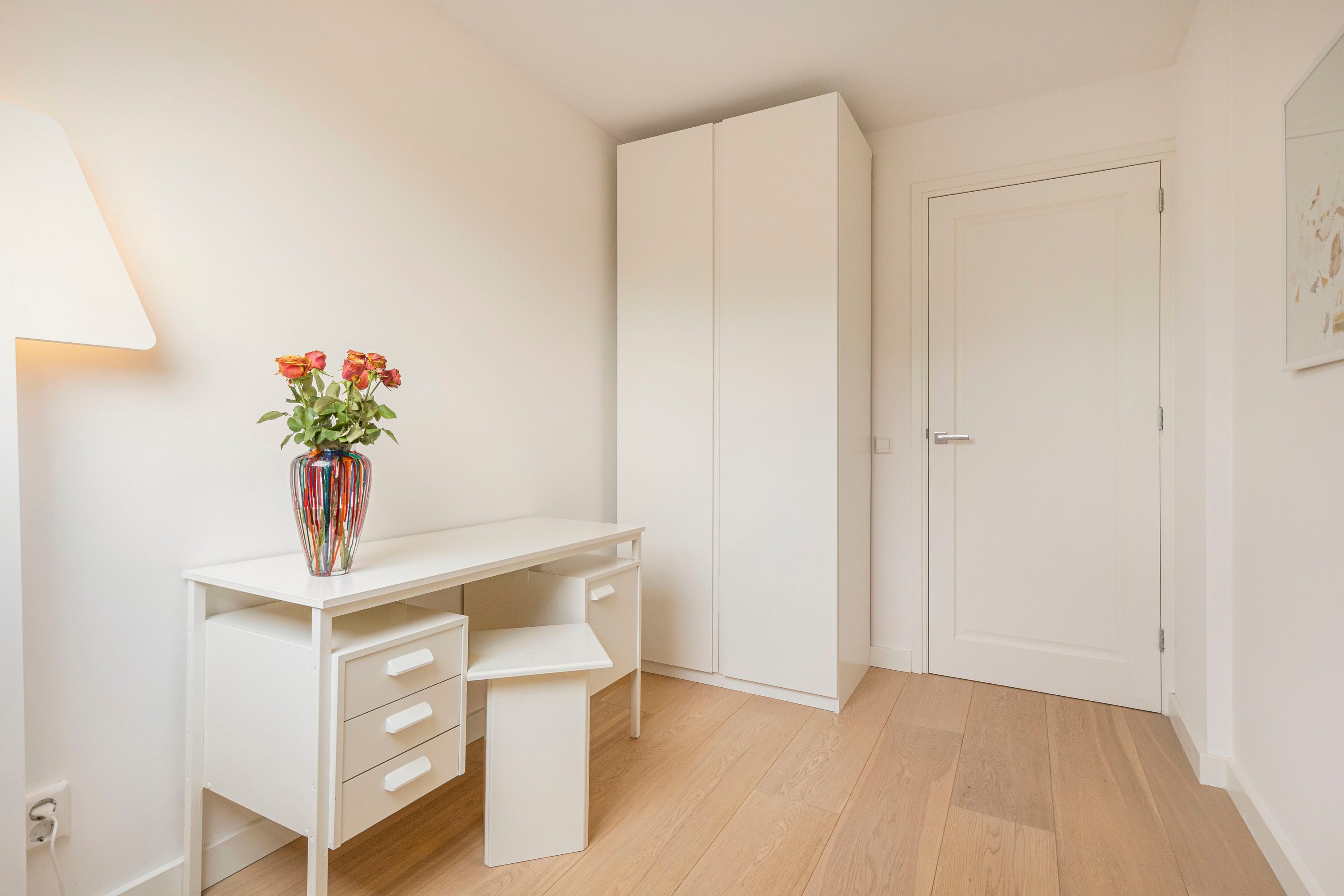 Ruime entree met op maat gemaakte garderobekast. De entree geeft toegang tot een ruime, lichte woonkamer met houten vloer en strak gestucte wanden. Via de openslaande deur stap je zo het balkon op, gelegen op het zonnige zuidoosten — een heerlijke plek om de dag te beginnen met een kop koffie.