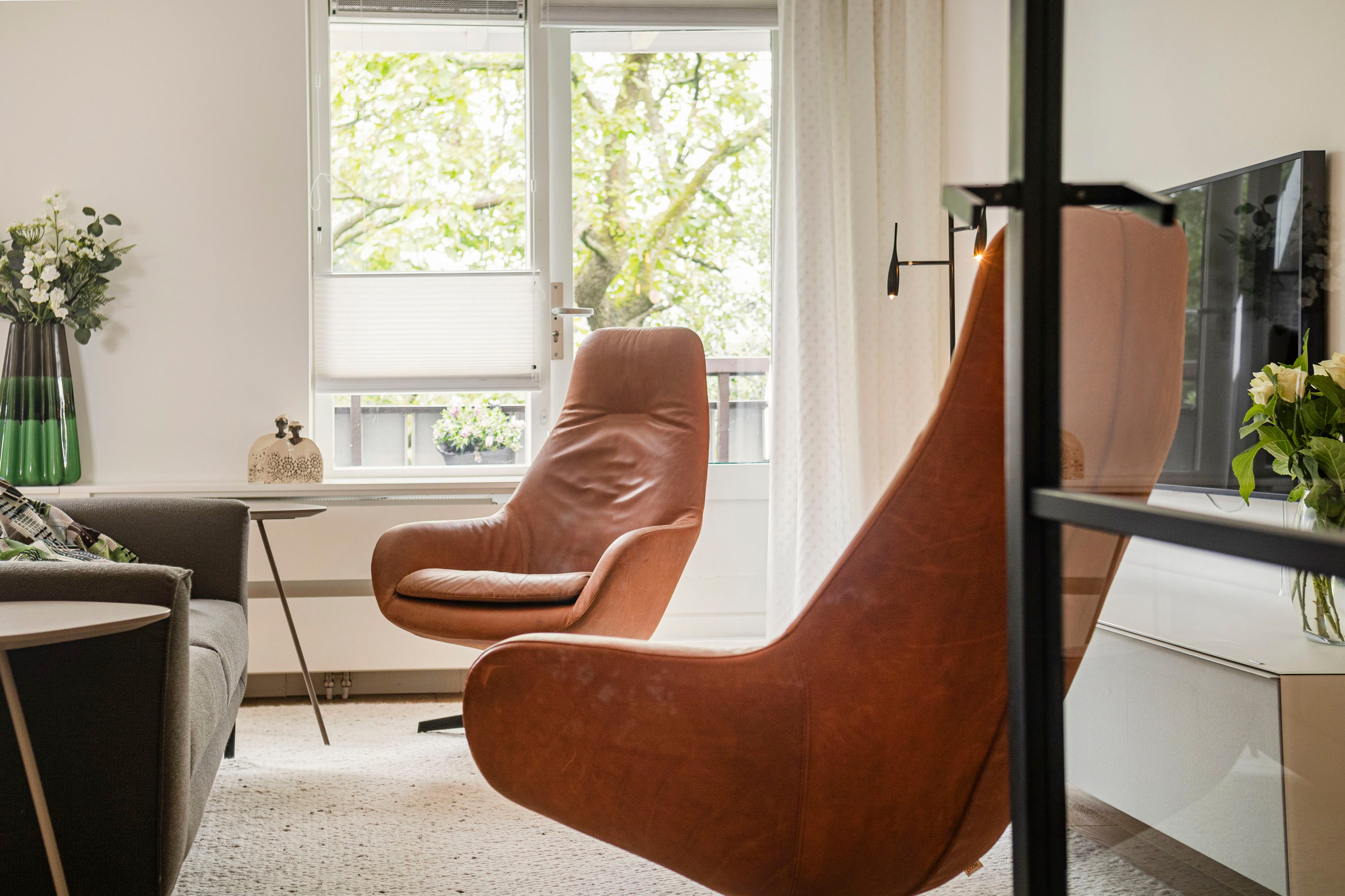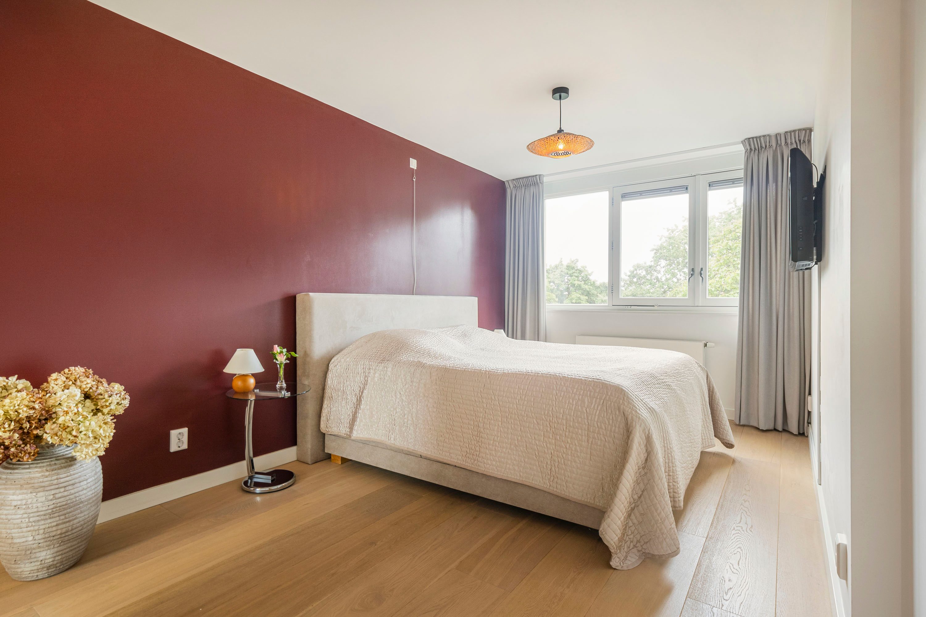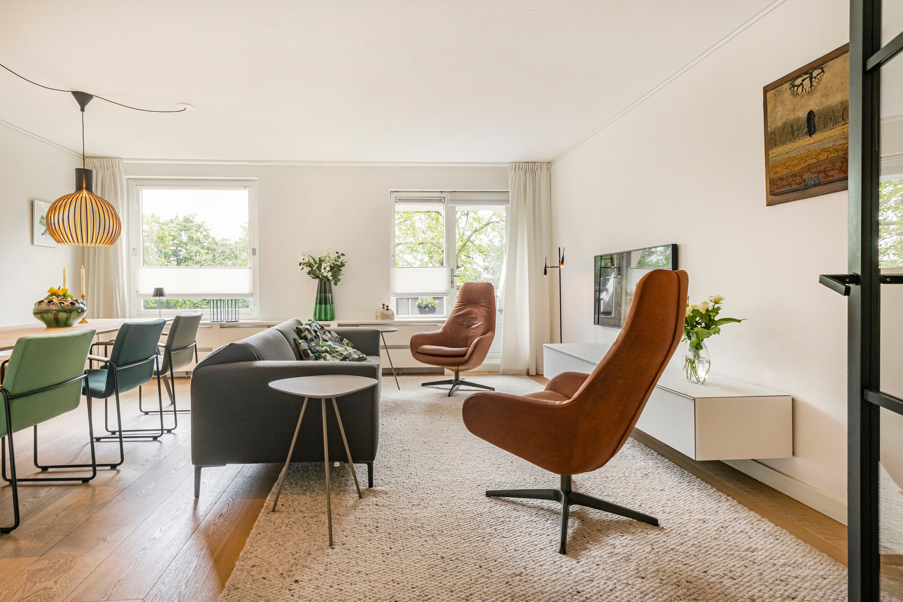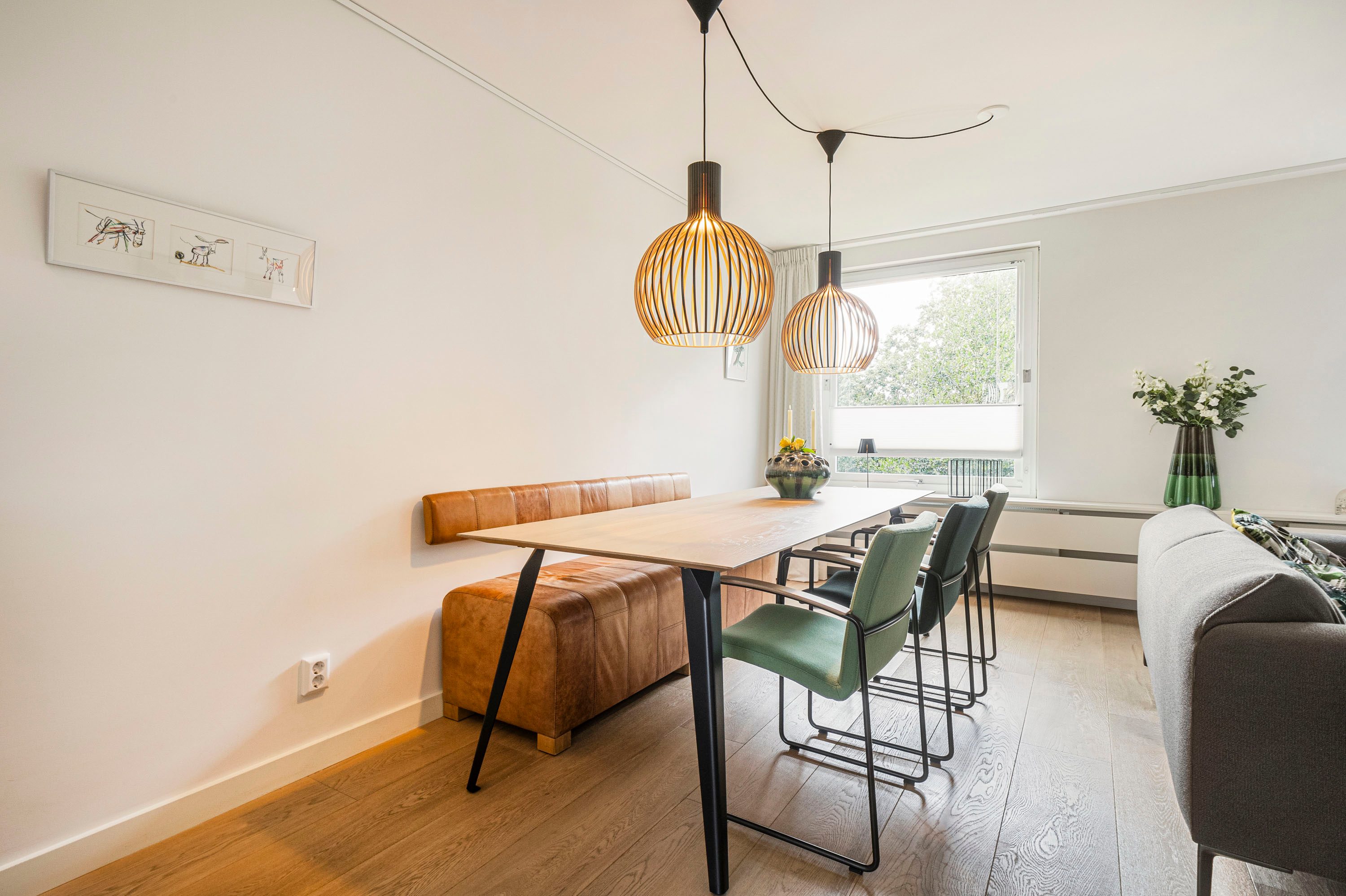 Ruime entree met op maat gemaakte garderobekast. De entree geeft toegang tot een ruime, lichte woonkamer met houten vloer en strak gestucte wanden. Via de openslaande deur stap je zo het balkon op, gelegen op het zonnige zuidoosten — een heerlijke plek om de dag te beginnen met een kop koffie.