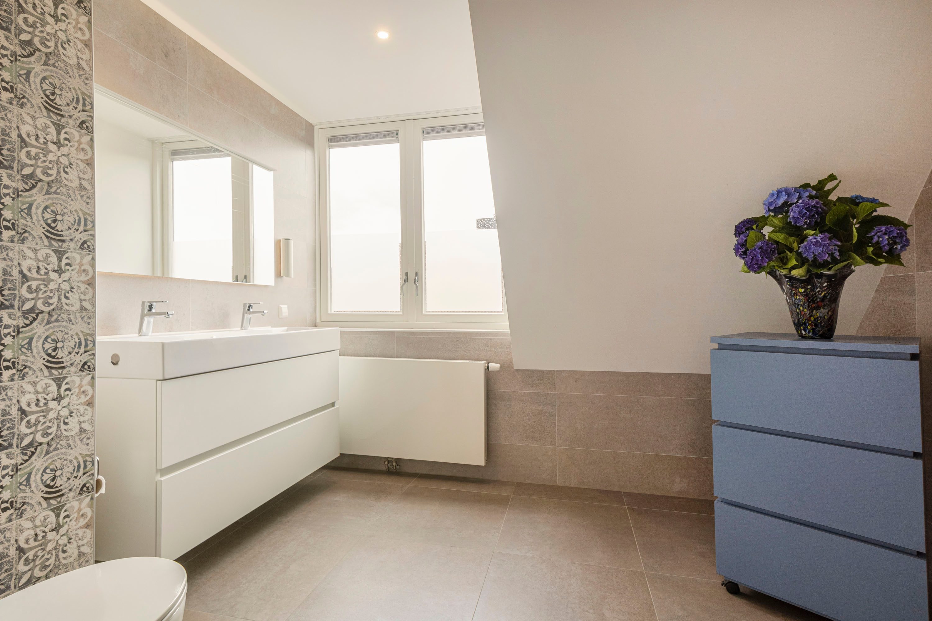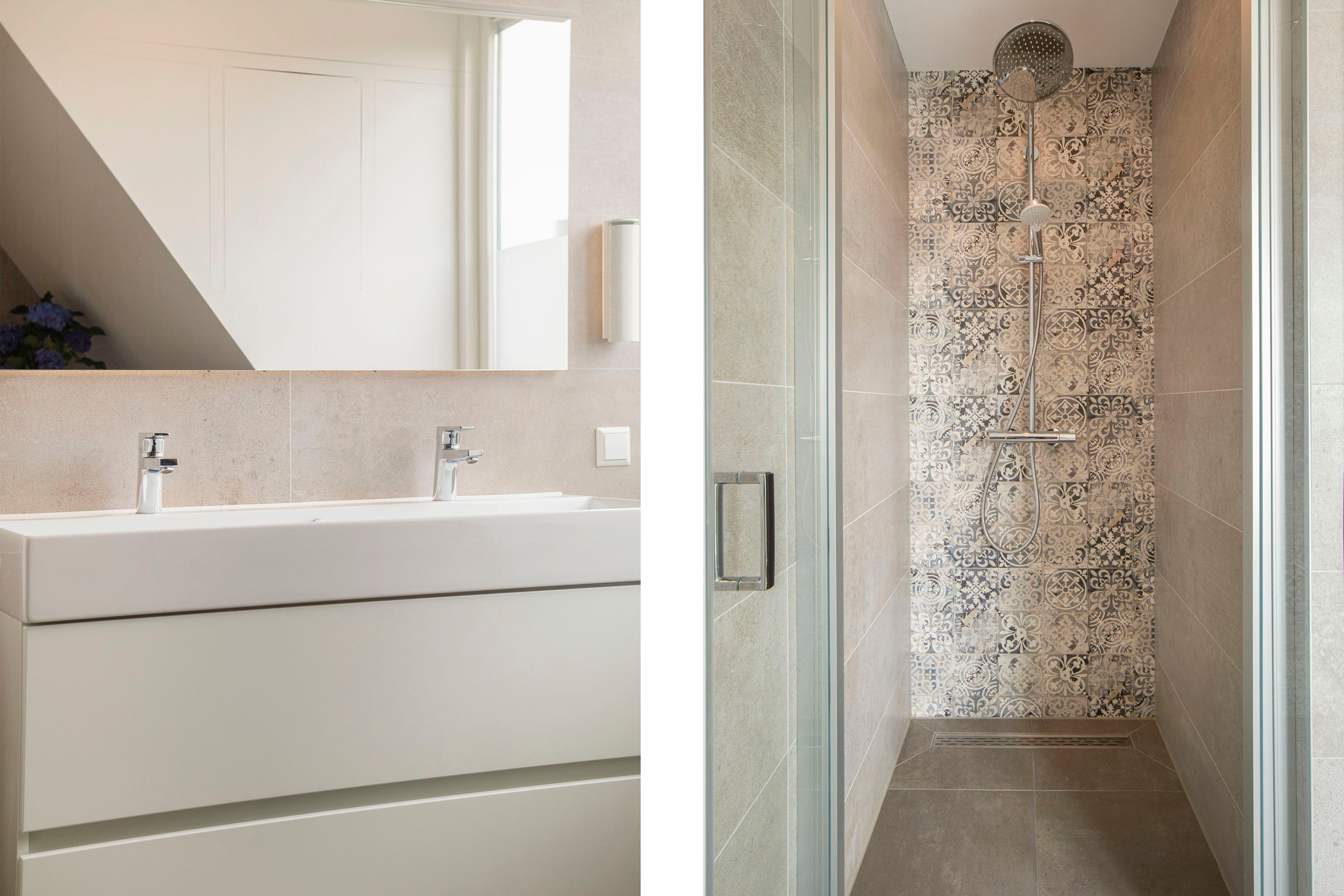 De moderne badkamer is voorzien van een inloopdouche, dubbele wastafel, moderne verlichte spiegel en een tweede toilet. Alles is stijlvol en strak afgewerkt, waardoor de ruimte een luxe uitstraling heeft en voorzien is van alle gemakken.