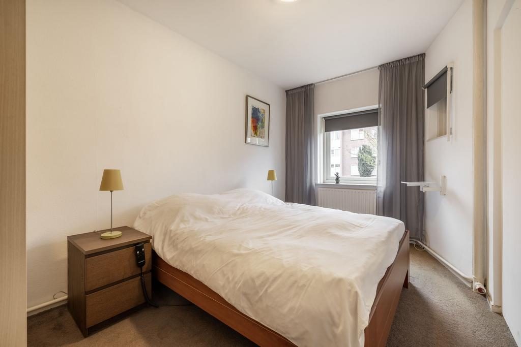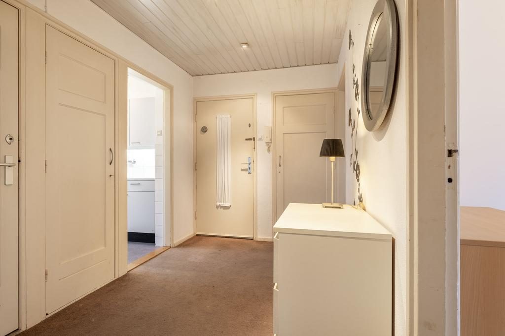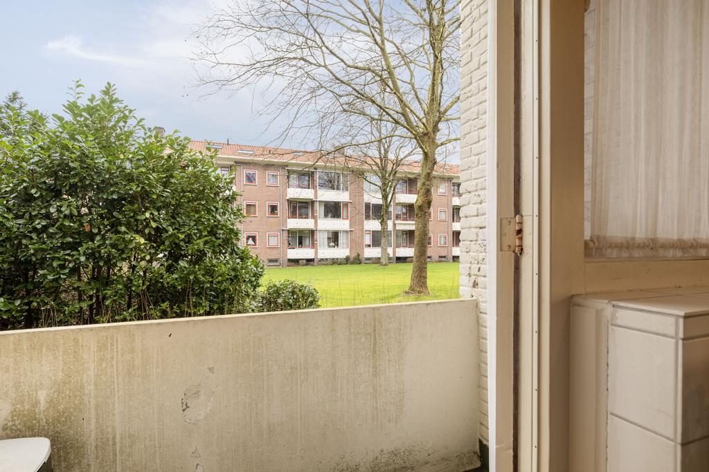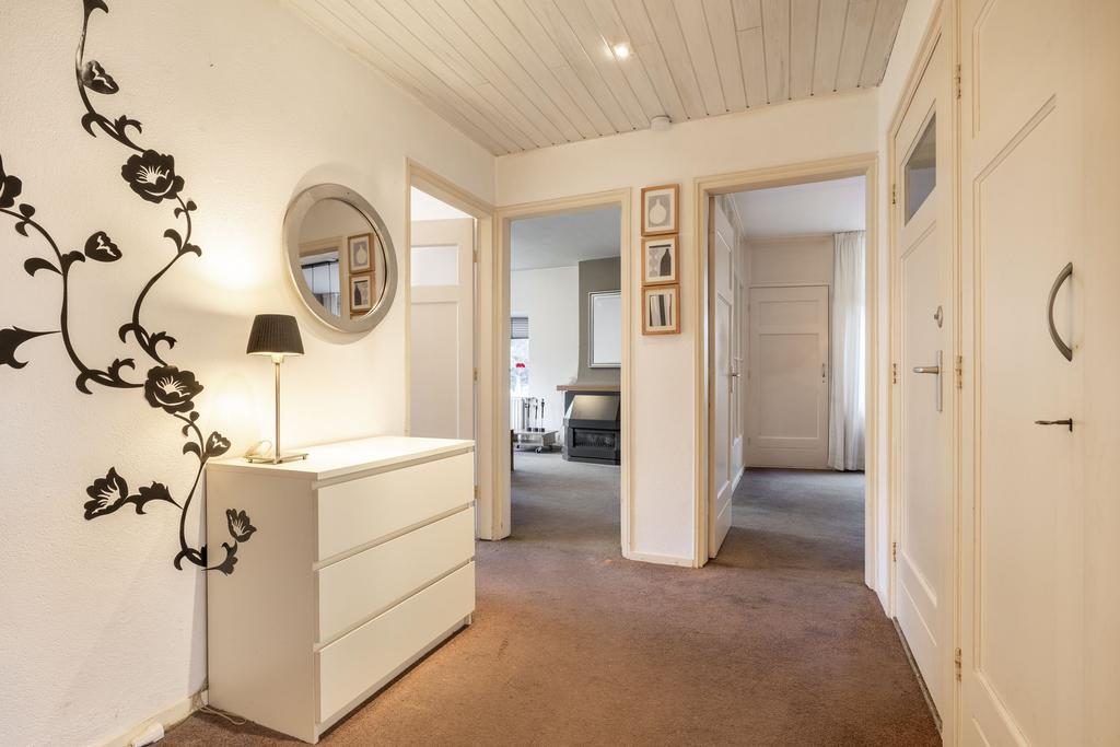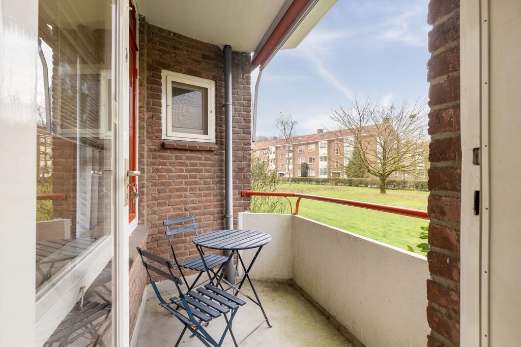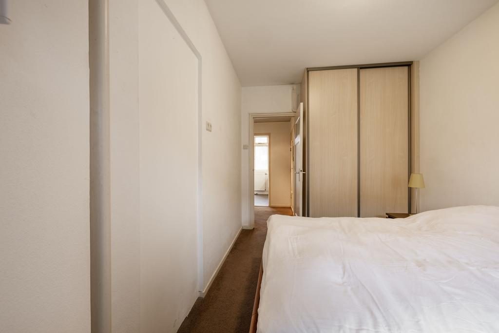 Je komt binnen in een fijne, ruime hal met een vaste garderobekast, de meterkast, toilet met fonteintje en toegang tot bijna alle vertrekken in de woning. Vanuit de hal kom je in de woonkamer die lekker licht is door de grote ramen die op het zuiden uitkijken. In de woonkamer is een moederhaard die zorgt voor de warmte in de woning. Ook vind je hier de originele ensuite glazen wand en toegang tot het balkon die op het zuiden is gelegen. Via de woonkamer kom je in het eetgedeelte waar genoeg plek is voor een grote eettafel met stoelen. Vanuit de hal kun je ook naar de keuken waar de aansluiting voor de wasmachine is. Vanuit de keuken is toegang tot het noordelijk gelegen balkon en de badkamer. In het appartement zijn twee slaapkamer aanwezig die naast elkaar zijn gelegen en in de grootste slaapkamer is een kast ingebouwd.