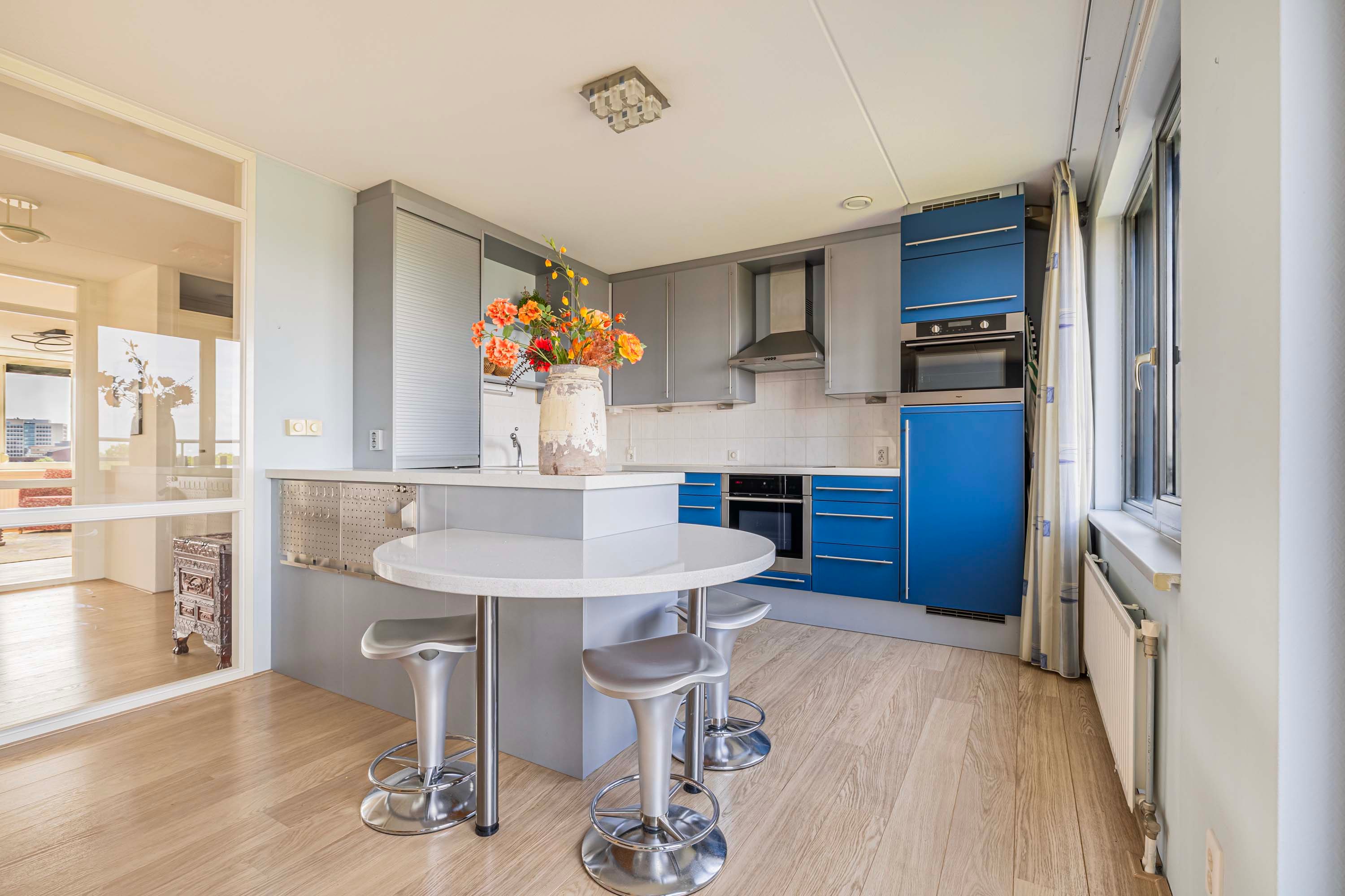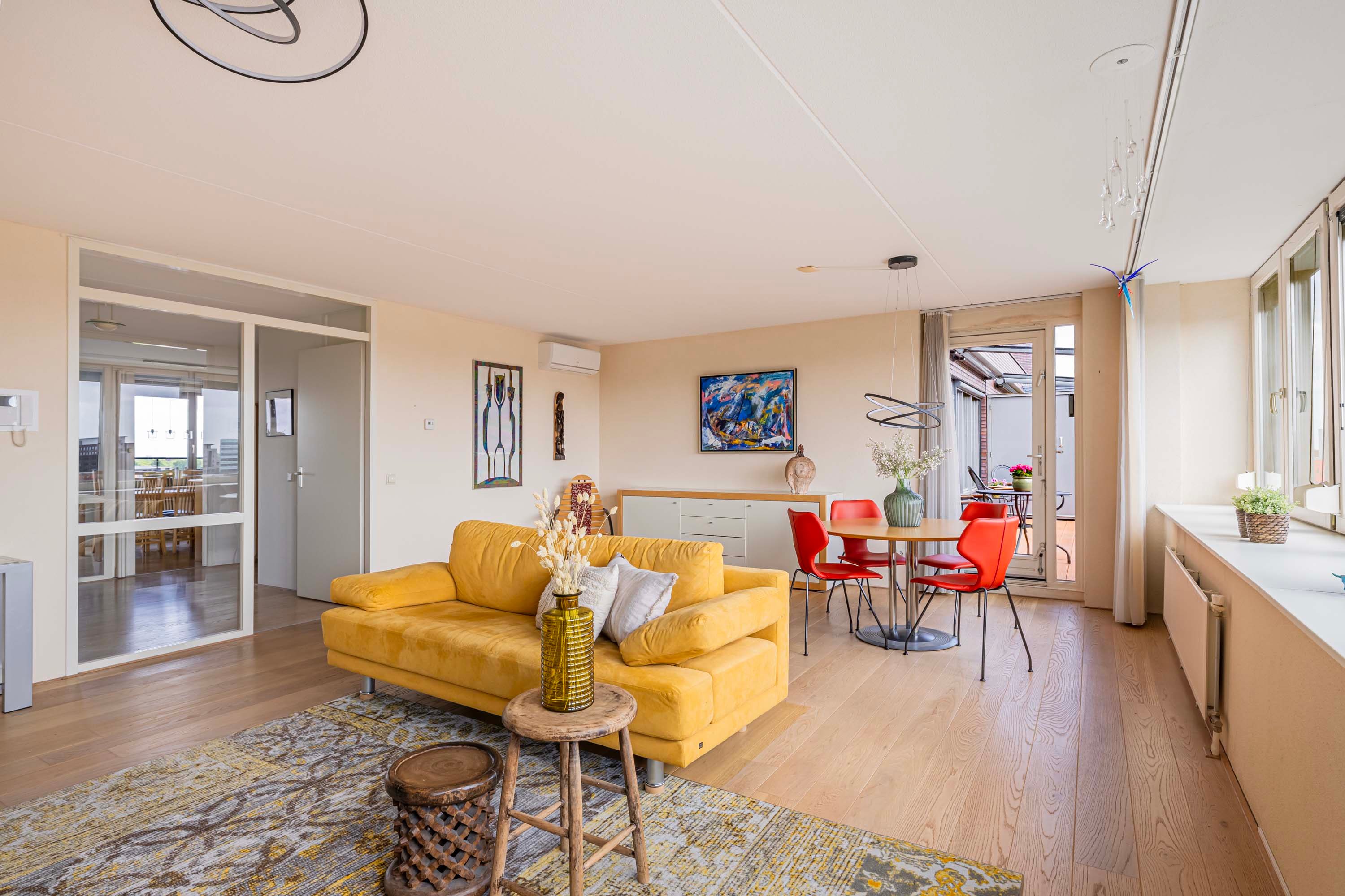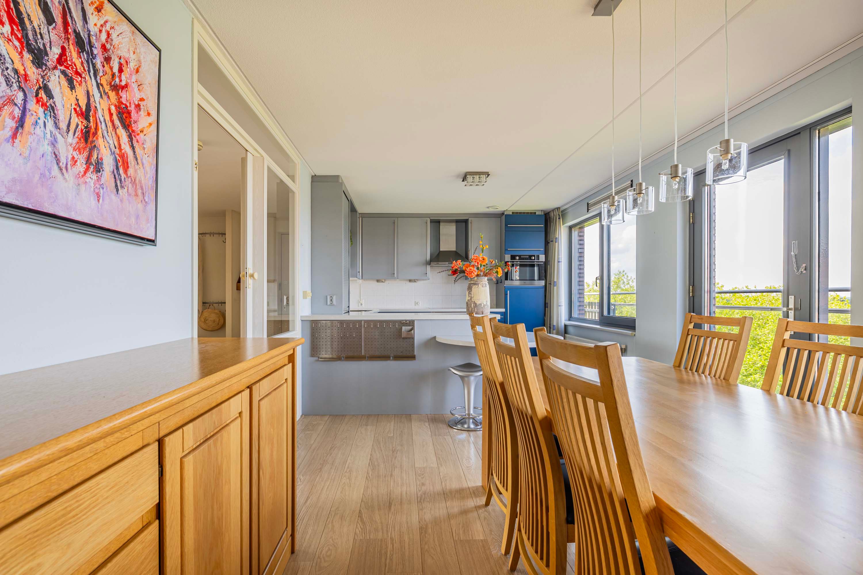 De lichte woonkamer, gesitueerd op het zonnige zuiden, vormt de centrale plek van het penthouse. Dankzij de grote raampartijen geniet je hier de hele dag van prachtig natuurlijk licht en een ruimtelijke sfeer. De massief eikenhouten vloer geeft de ruimte een warme en stijlvolle uitstraling, en de aanwezige airco zorgt voor een prettig binnenklimaat.