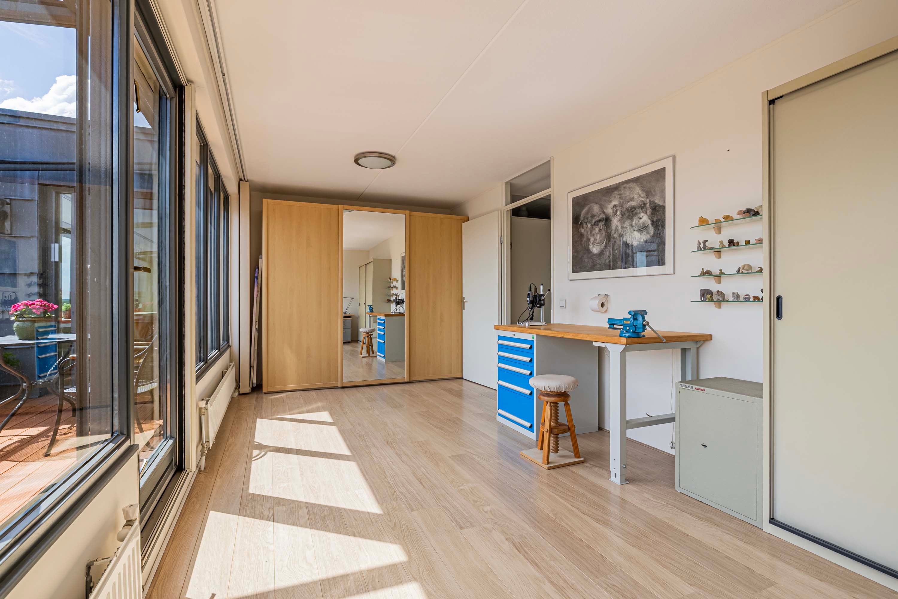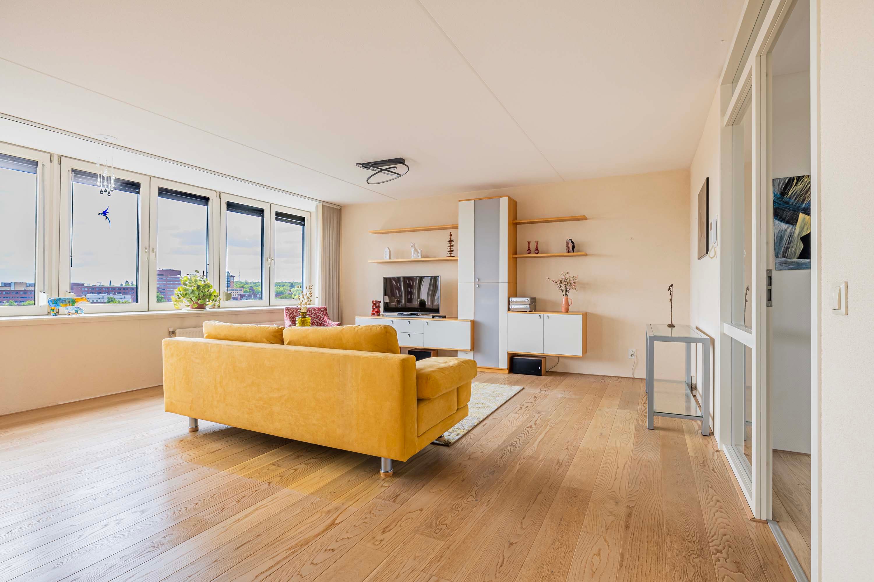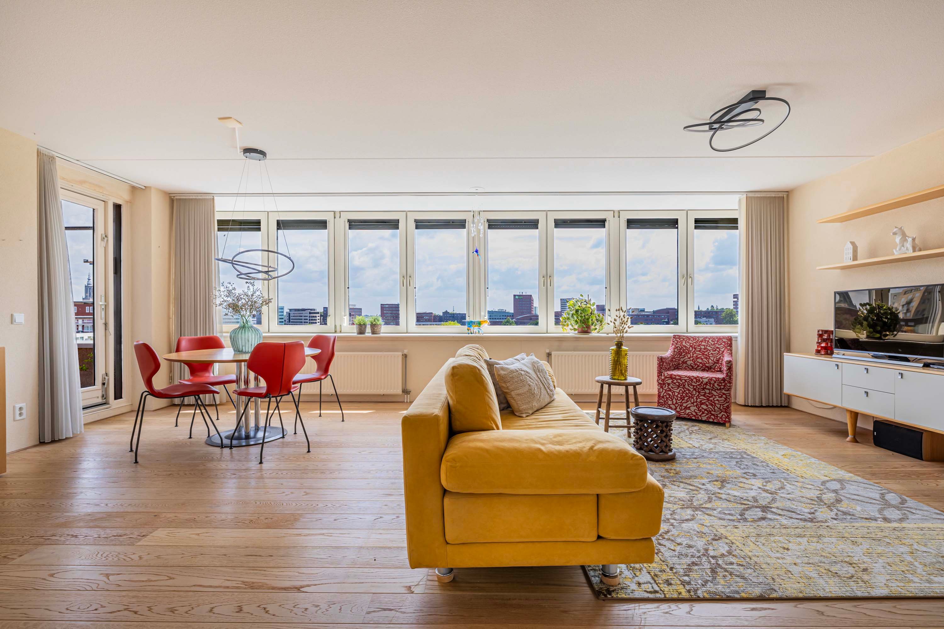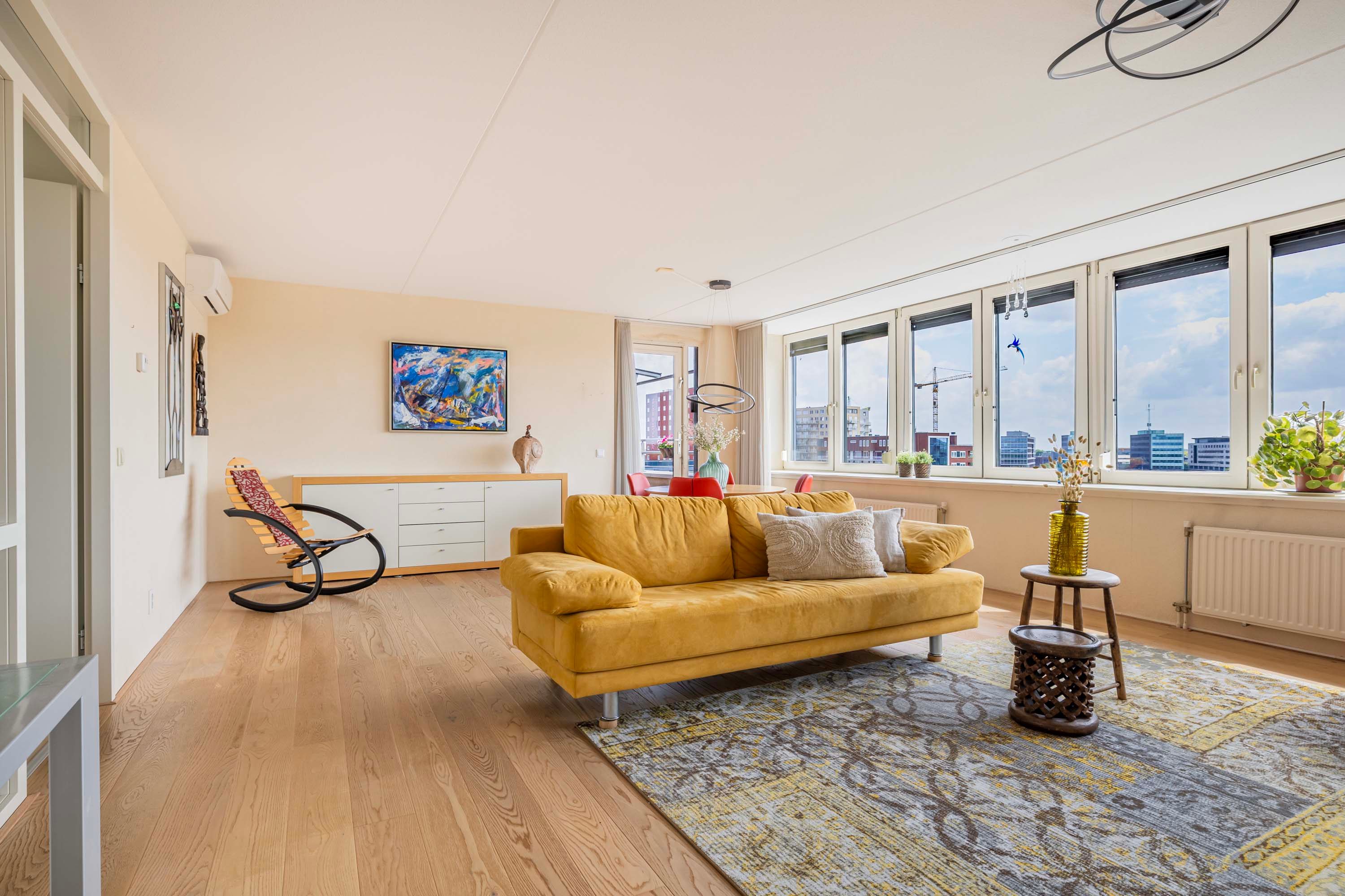 De lichte woonkamer, gesitueerd op het zonnige zuiden, vormt de centrale plek van het penthouse. Dankzij de grote raampartijen geniet je hier de hele dag van prachtig natuurlijk licht en een ruimtelijke sfeer. De massief eikenhouten vloer geeft de ruimte een warme en stijlvolle uitstraling, en de aanwezige airco zorgt voor een prettig binnenklimaat.