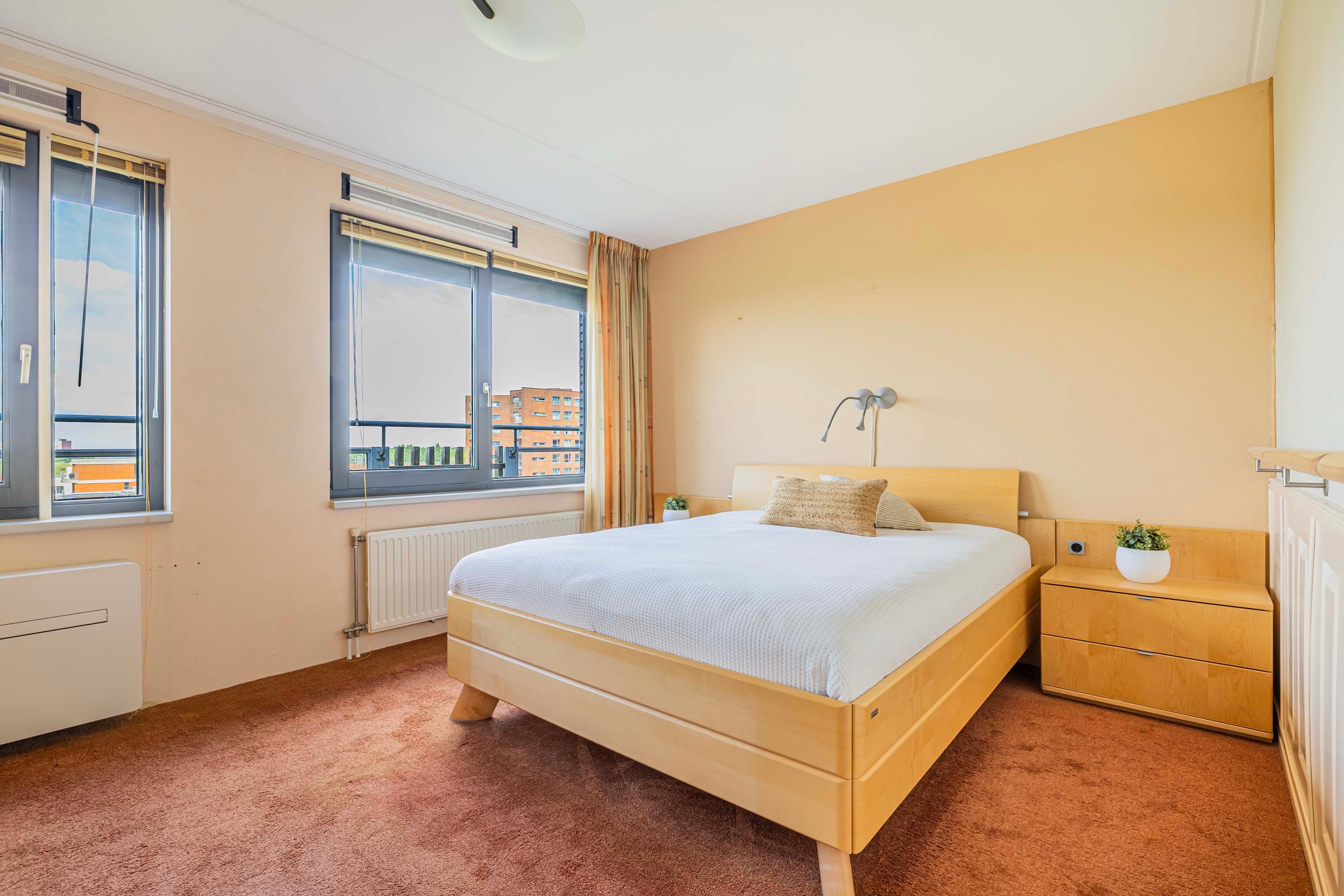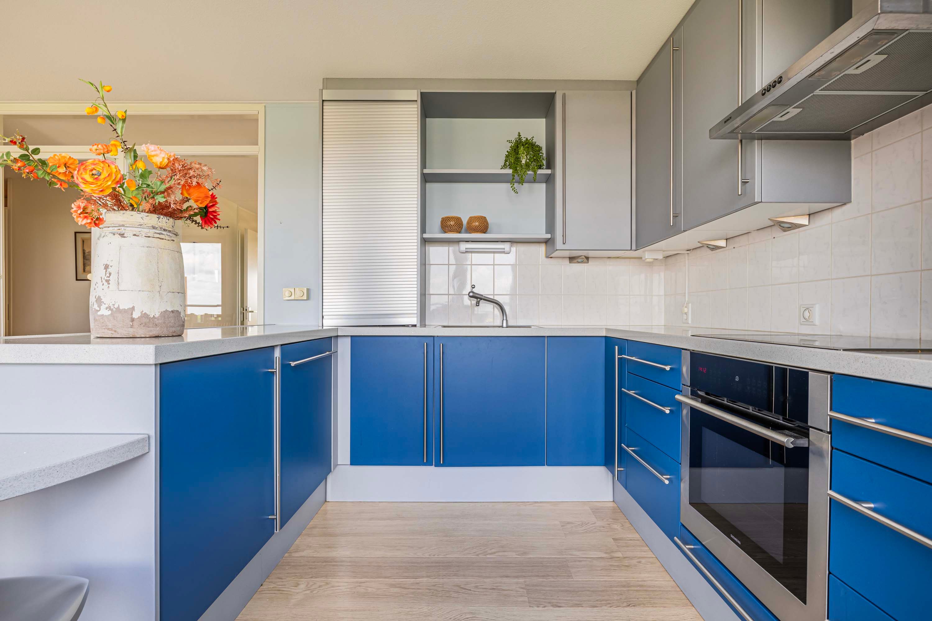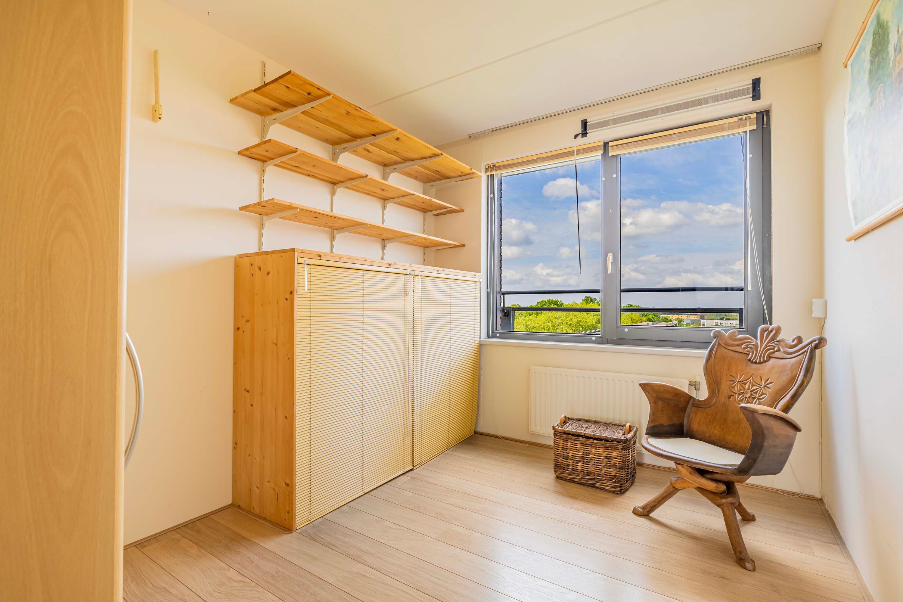 Aan de andere kant van de hal bevindt zich de ruime keuken, voorzien van inbouwapparatuur uit 2007. Vanuit de keuken heb je toegang tot een intieme buitenruimte aan de noordzijde, waar je geniet van een mooi uitzicht door de hoogte van het appartement. De drie slaapkamers bieden flexibiliteit; één slaapkamer beschikt over airconditioning, een tweede over screens en de derde over een rolluik, zodat aan elk comfort is gedacht. Verder zijn er een complete badkamer, een separaat toilet en een praktische bergruimte aanwezig, waar ook de aansluiting voor de wasmachine, cv-installatie en mechanische ventilatie te vinden zijn.