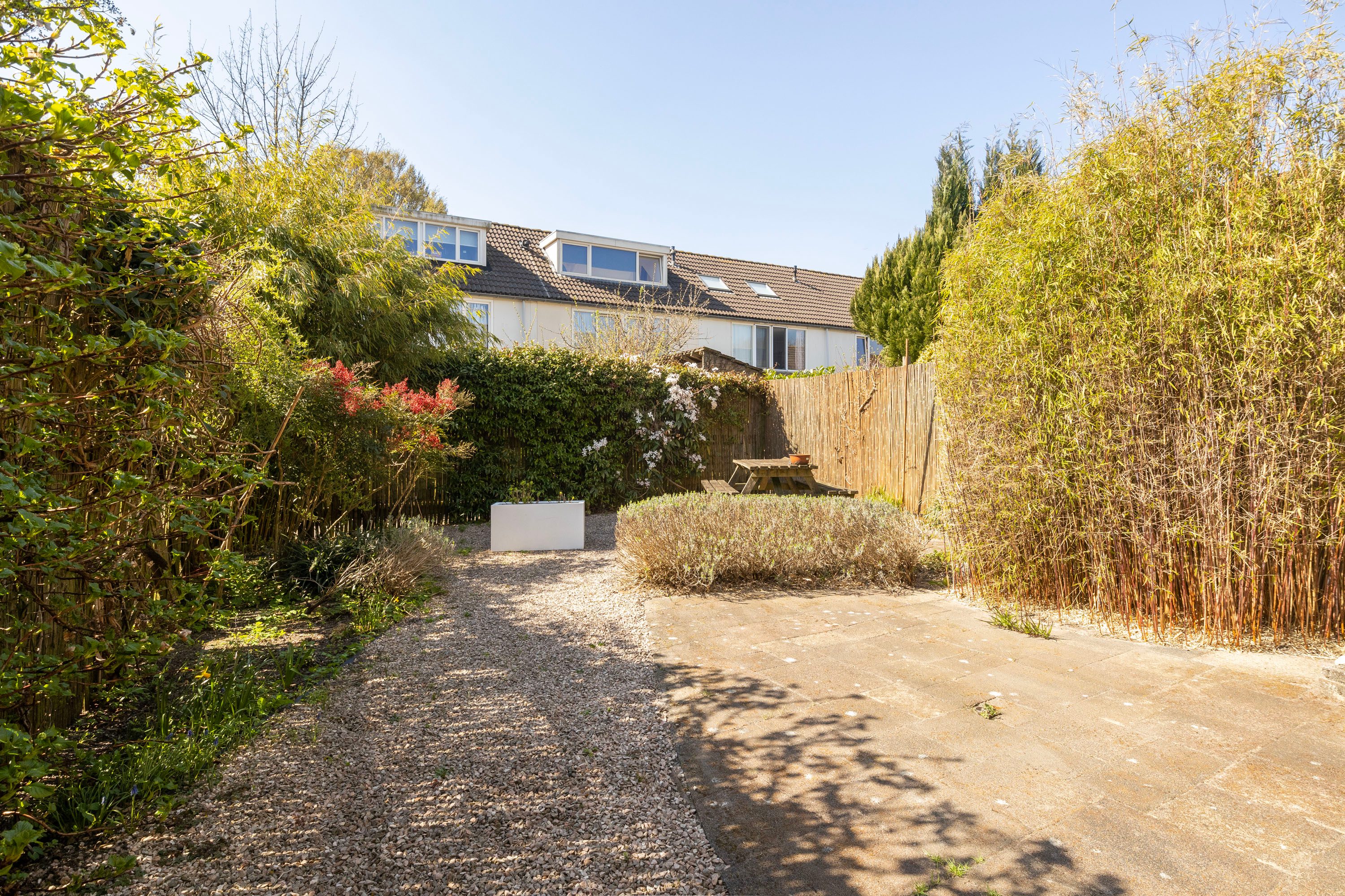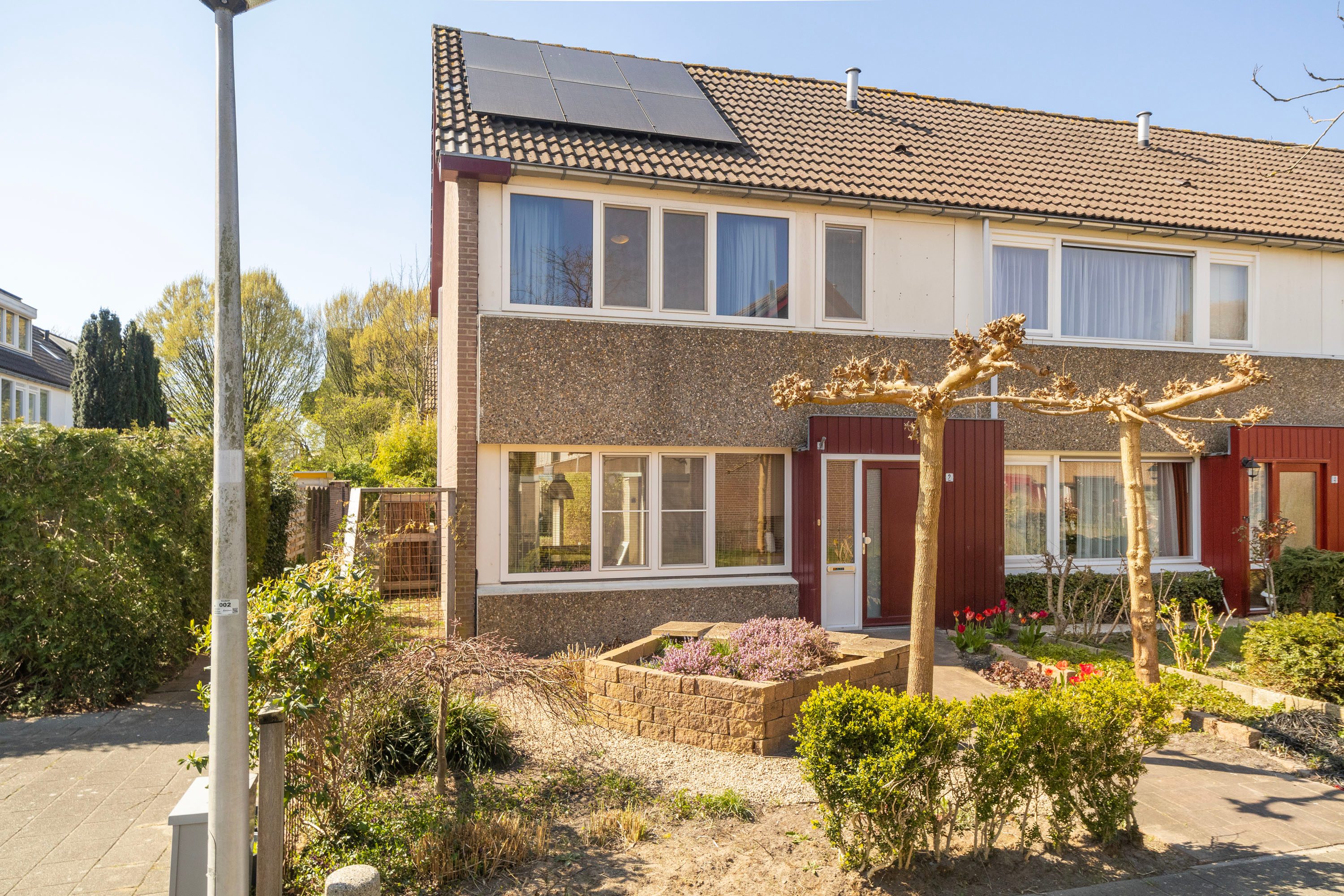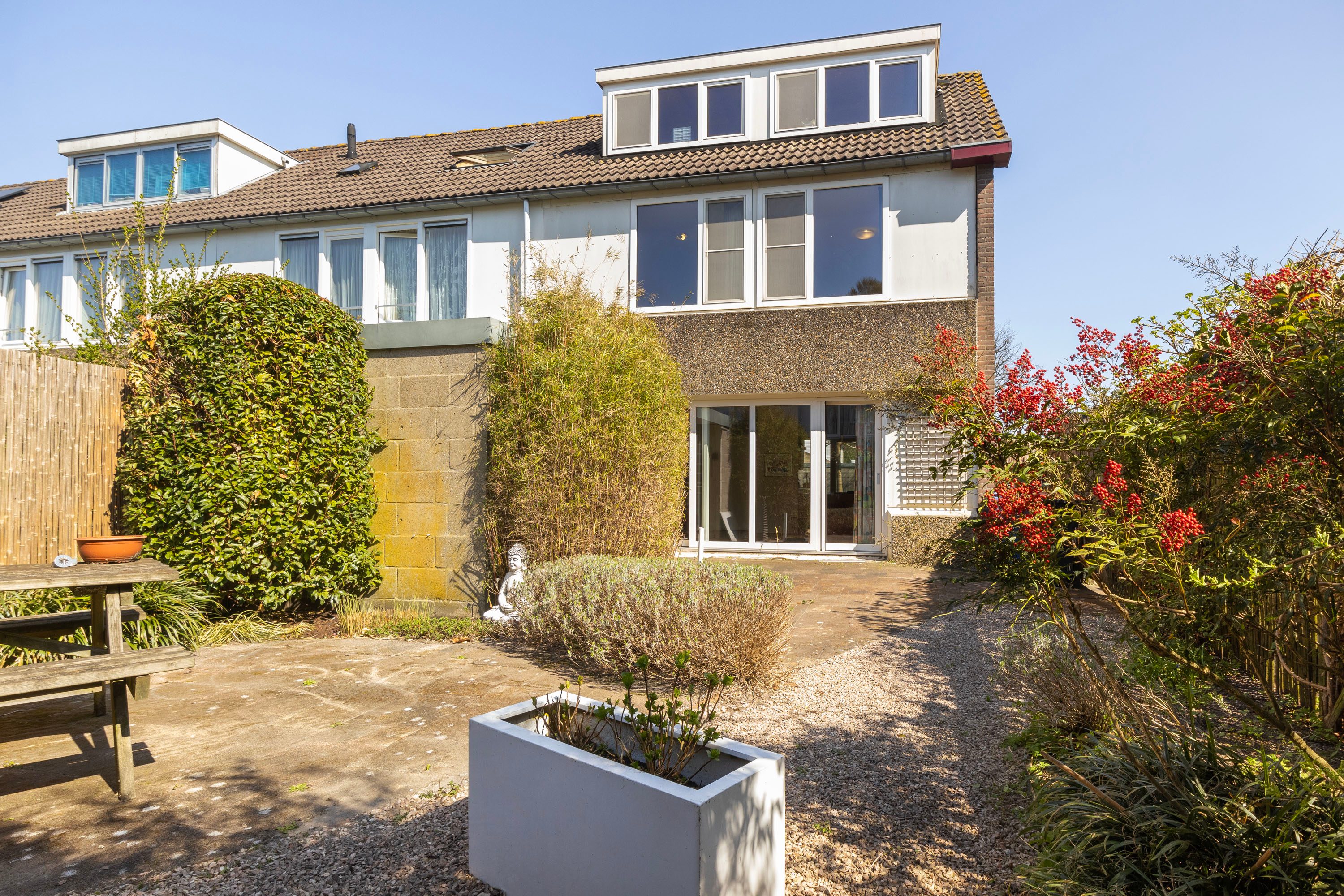 Aan de achterzijde van de woning bevindt zich een royale, zonnige tuin op het zuidwesten, waar volop ruimte is voor een comfortabele loungeset om heerlijk van de zon te genieten. De tuin is gemakkelijk toegankelijk via de schuifpui aan de achterzijde én via de zijtuin. Daarnaast is er een praktische berging aanwezig. Ook aan de voorzijde van de woning is een fraai aangelegde, ruime voortuin te vinden.