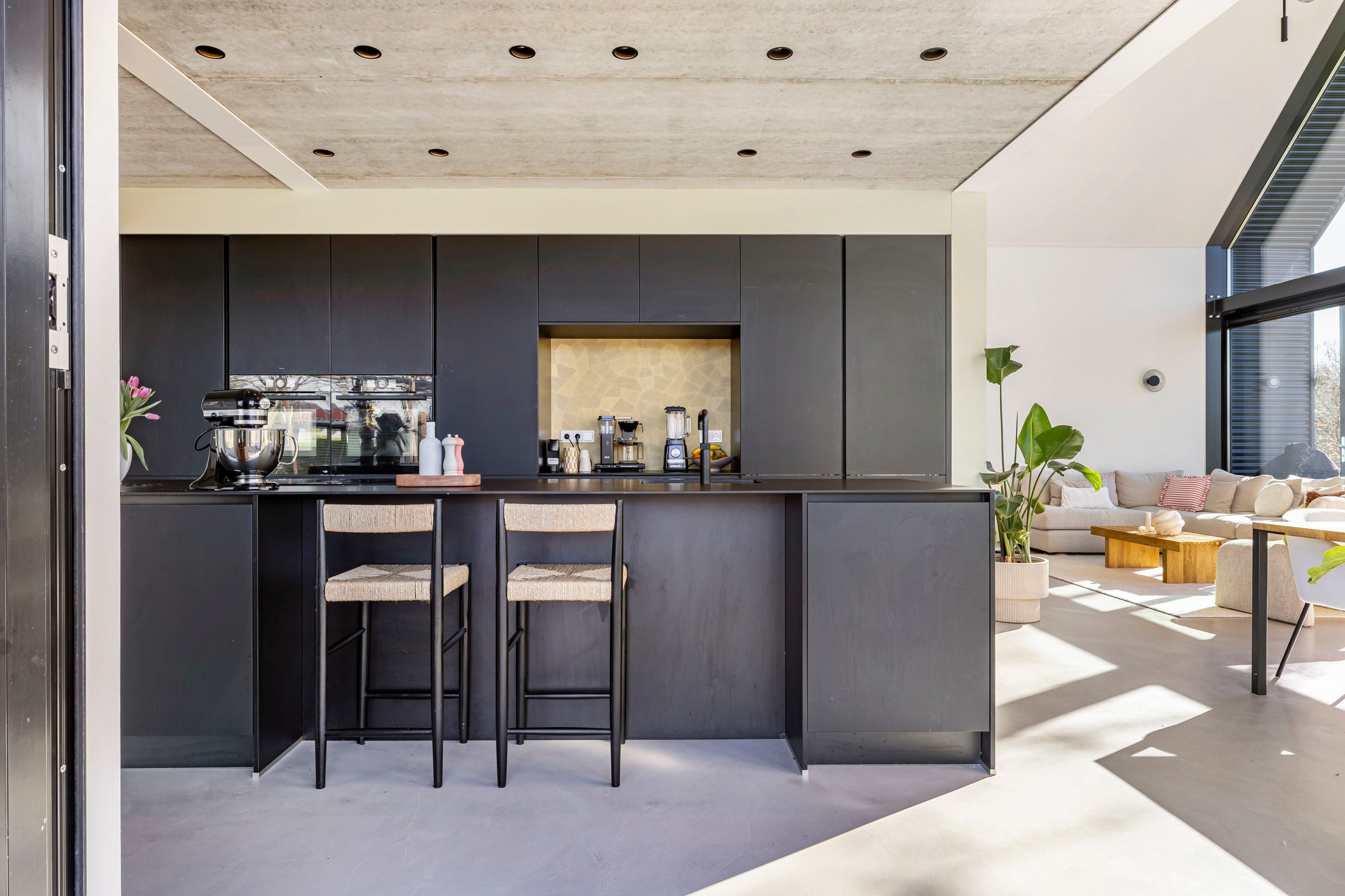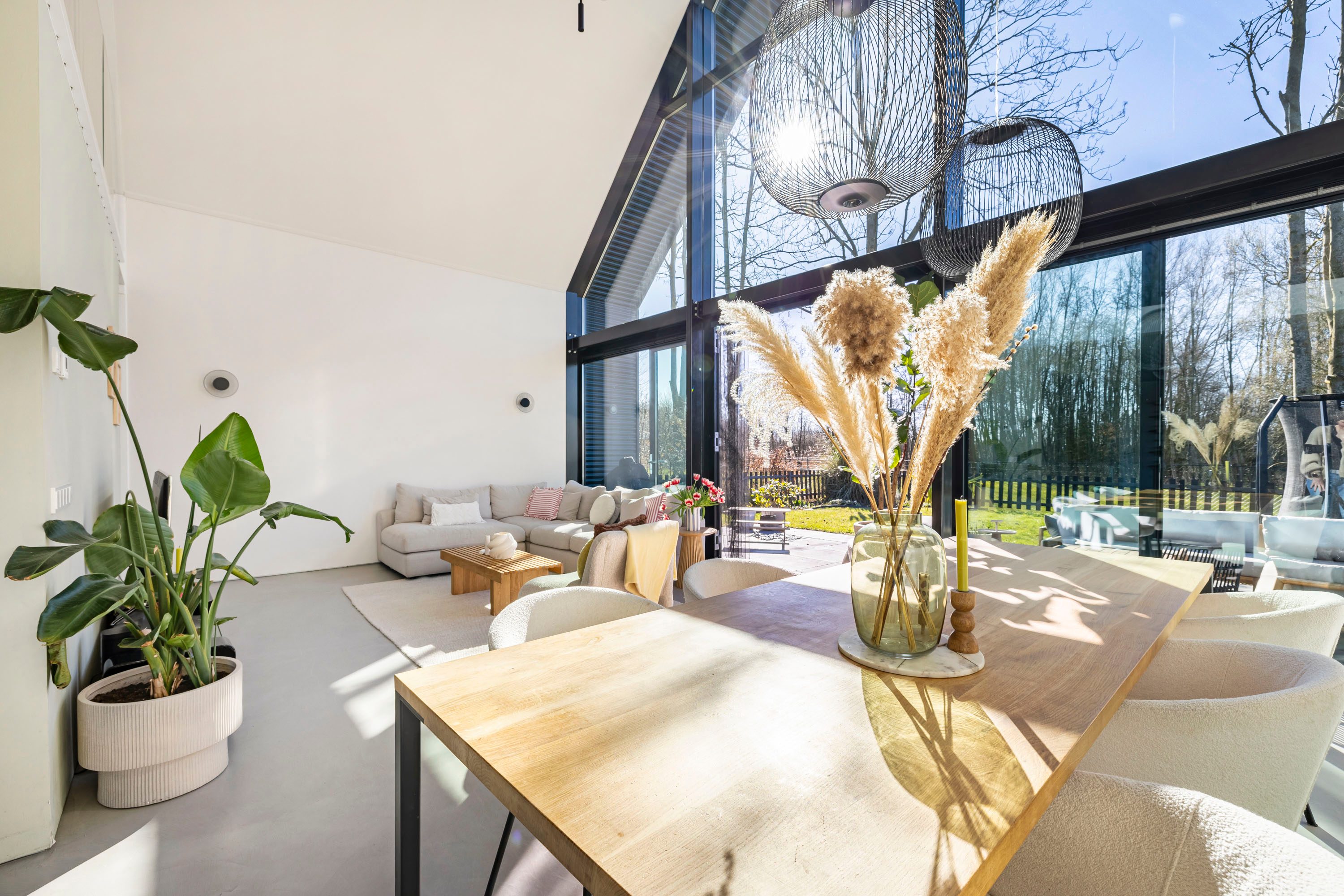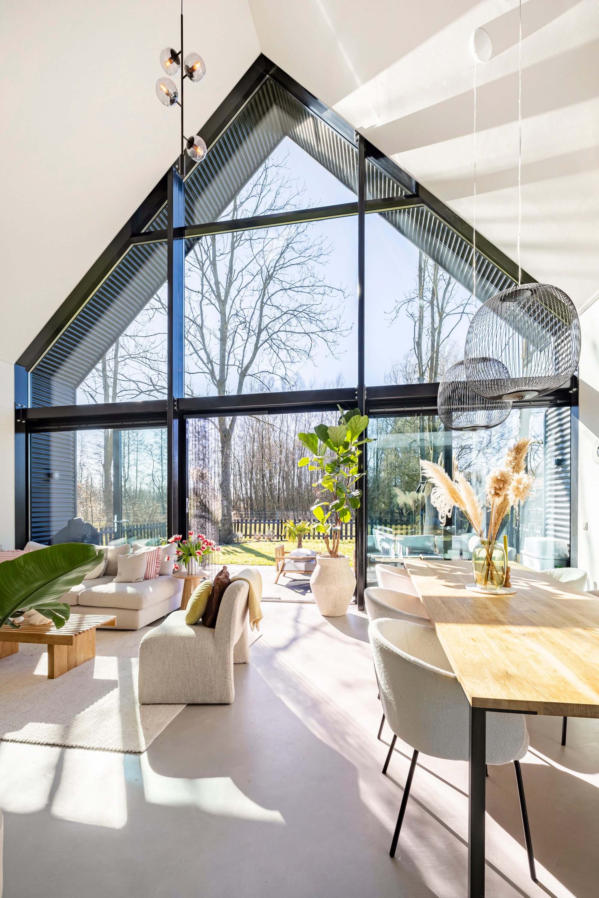 De woonkamer is aan de zuidzijde van de woning gelegen. De achtergevel is uniek met haar hoogte van bijna 7 meter in de punt en de grote glasoppervlaktes. De pui is van aluminium, heeft triple beglazing en is ook nog eens zonwerend. De dubbele openslaande deuren zorgen ervoor dat binnen en buiten samengevoegd kan worden. De achtertuin is op het zuiden gelegen, heeft vrij zicht en is omringd door groen.