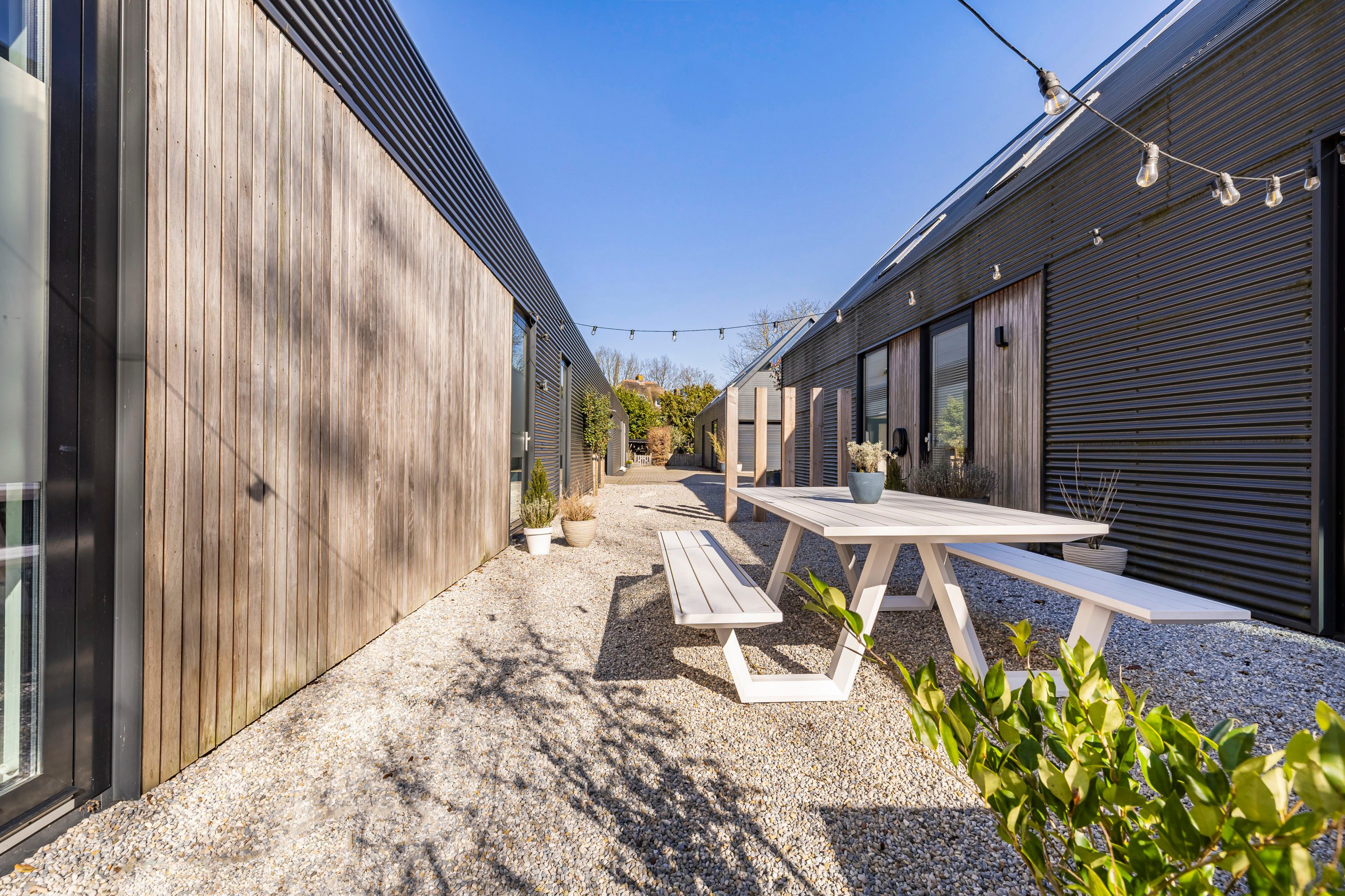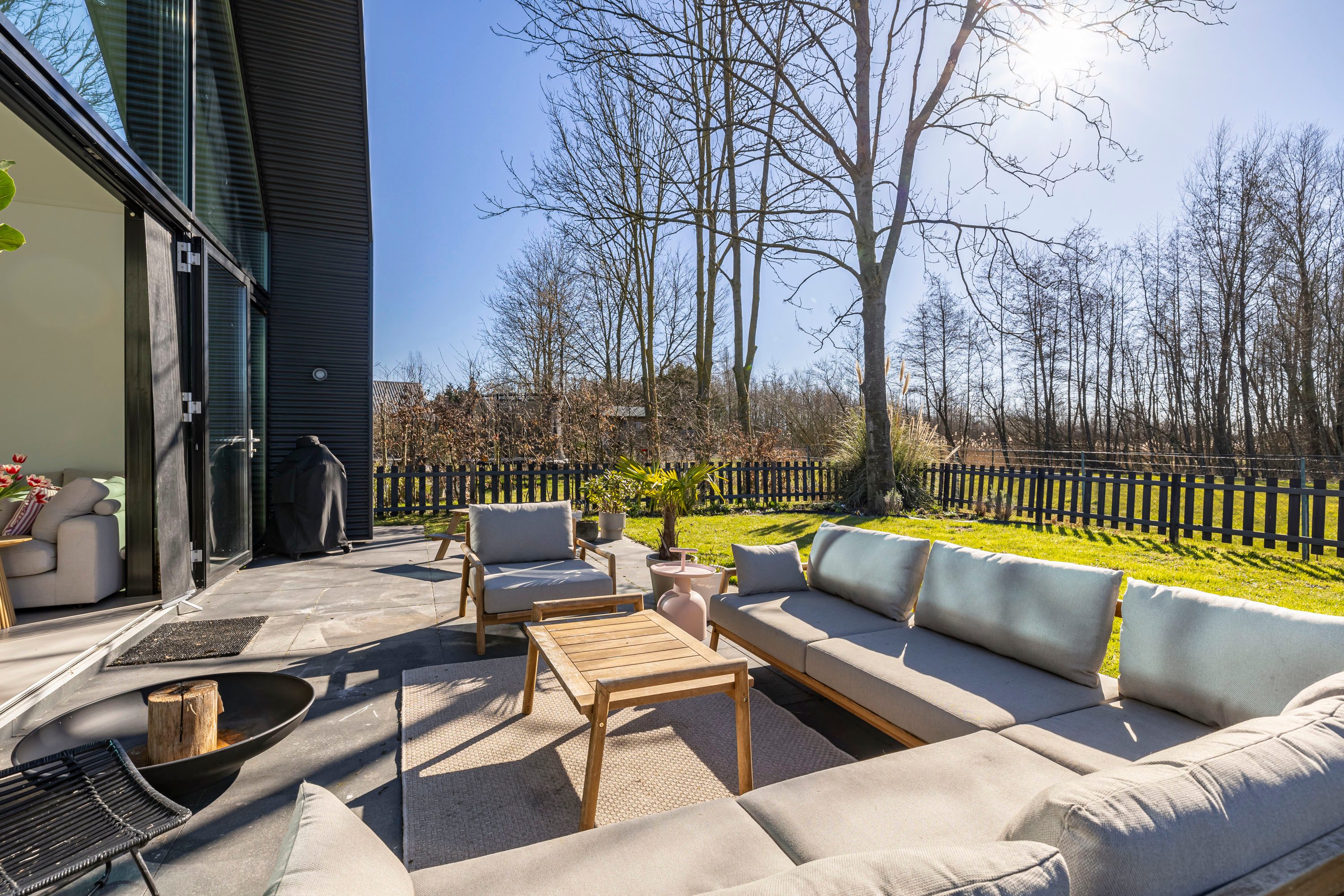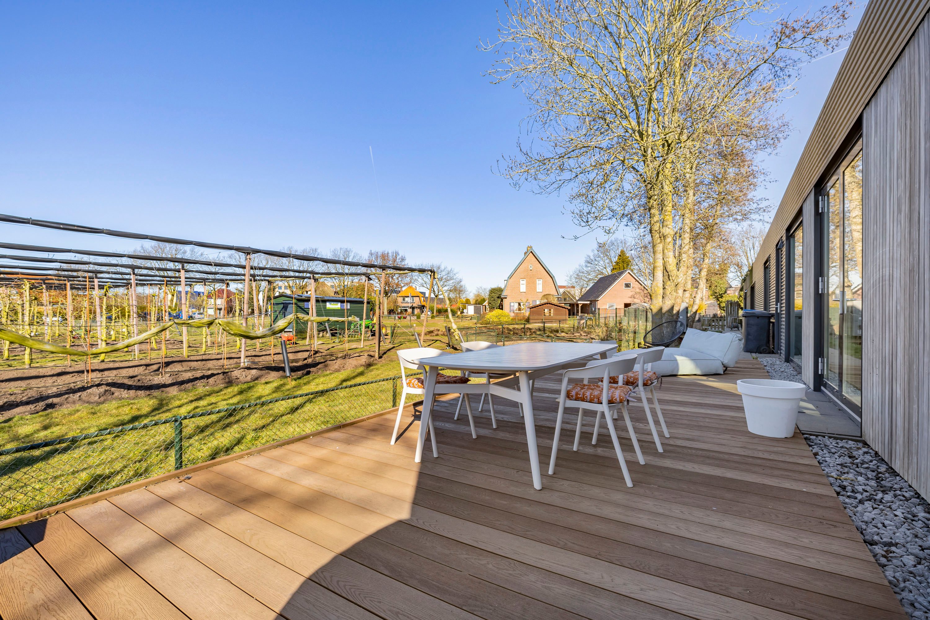 Met openslaande deuren vanuit de keuken bereik je de vlonder die is aangelegd aan de zijkant van de woning. Een onderhoudsvrije vlonder gemaakt van composiet. Het skelet van de vlonder is gemaakt van hardhout.