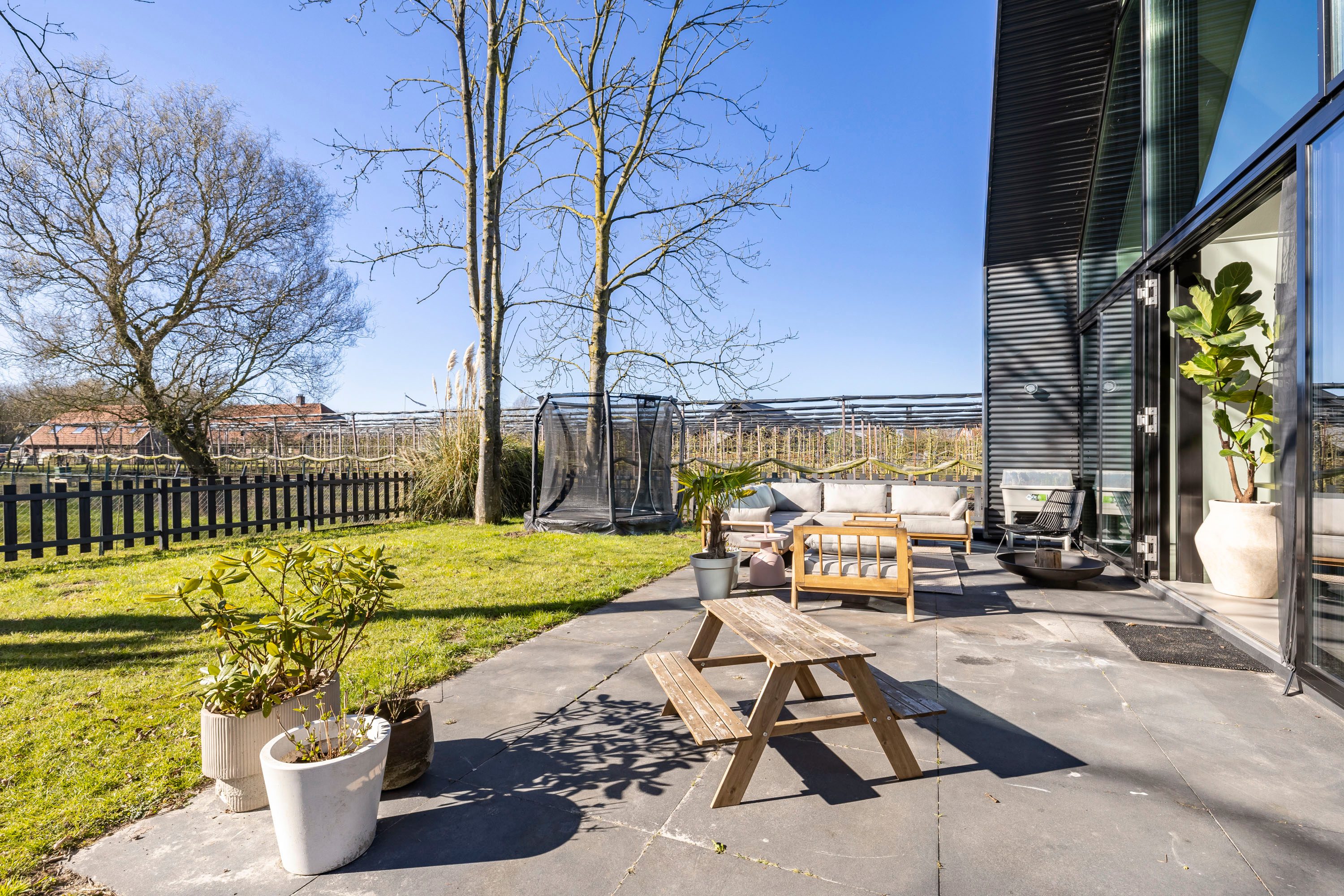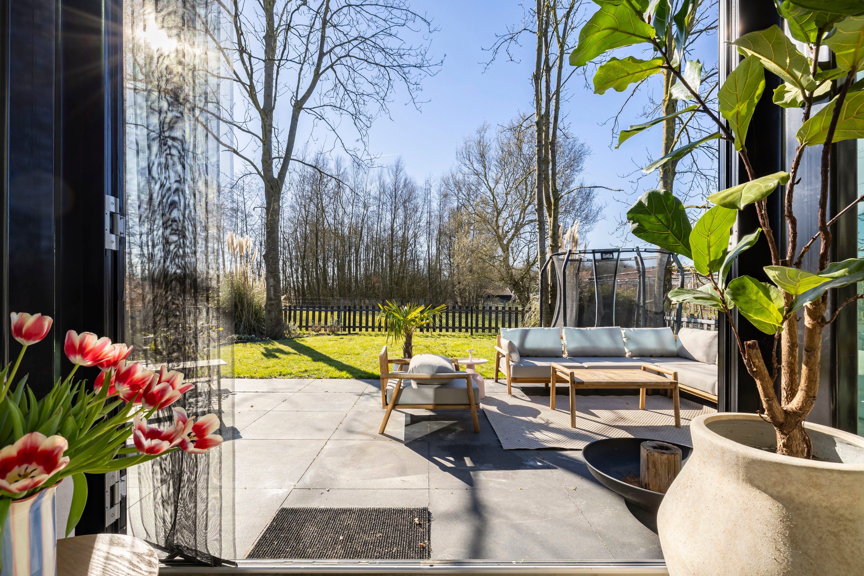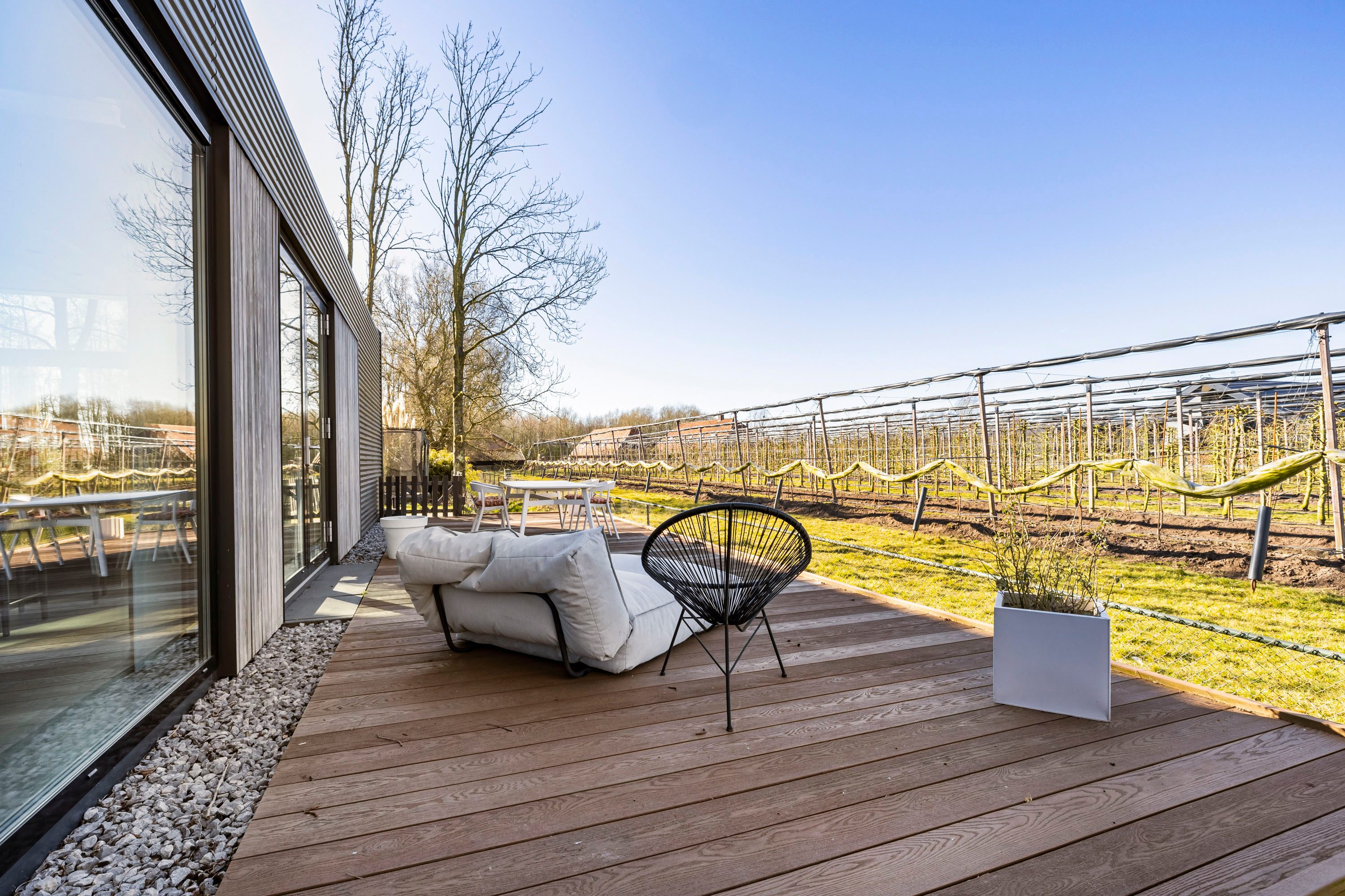 Met openslaande deuren vanuit de keuken bereik je de vlonder die is aangelegd aan de zijkant van de woning. Een onderhoudsvrije vlonder gemaakt van composiet. Het skelet van de vlonder is gemaakt van hardhout.