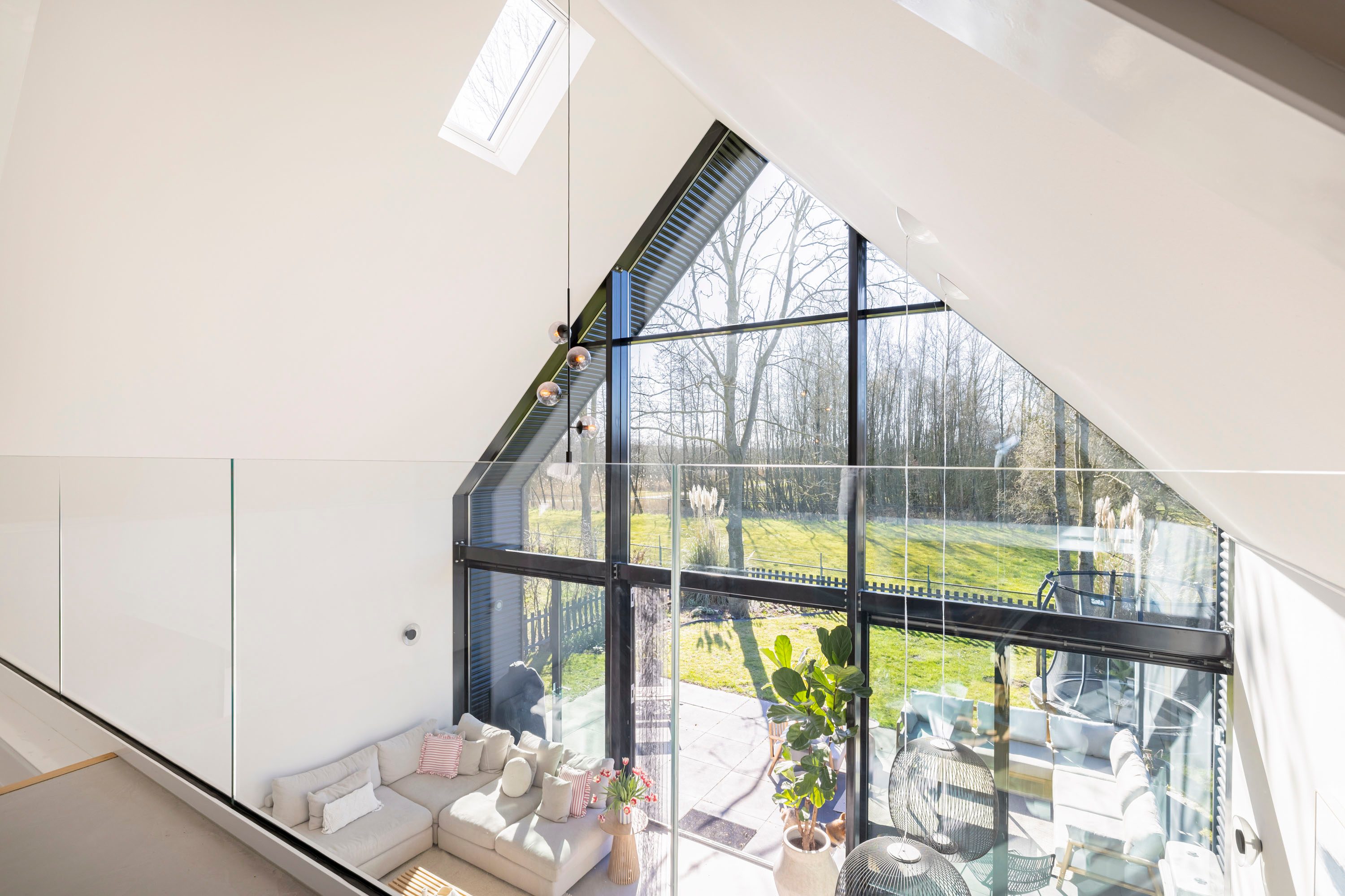 + Veel lichtinval door de grote raampartijen en op de verdieping grote kantelramen;