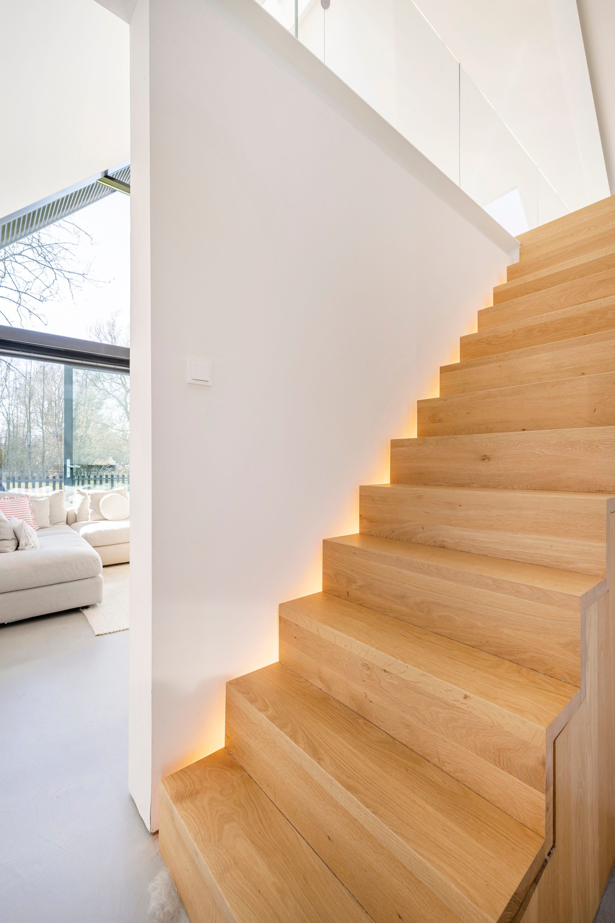 De vaste trap in de hal van de begane grond brengt je naar de eerste verdieping. De trap is handgemaakt van eikenhout. De ruime overloop staat door het glas in contact met de woonkamer en is afgeschermd met een glazen wand. Door de openheid ontstaat er veel lichtinval op deze verdieping. Daarnaast is er in de slaapkamers gebruik gemaakt van grote (1,20 meter lang) Velux dakramen.