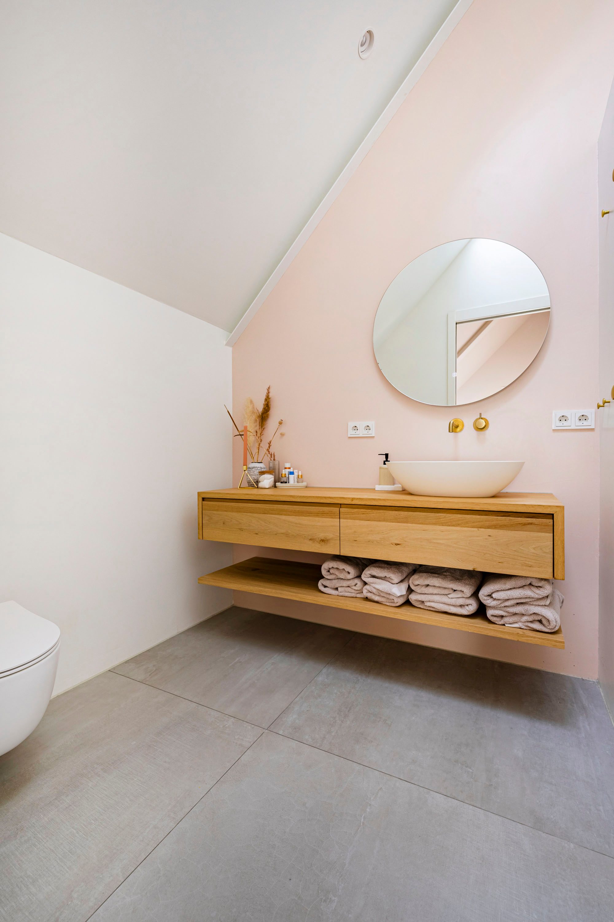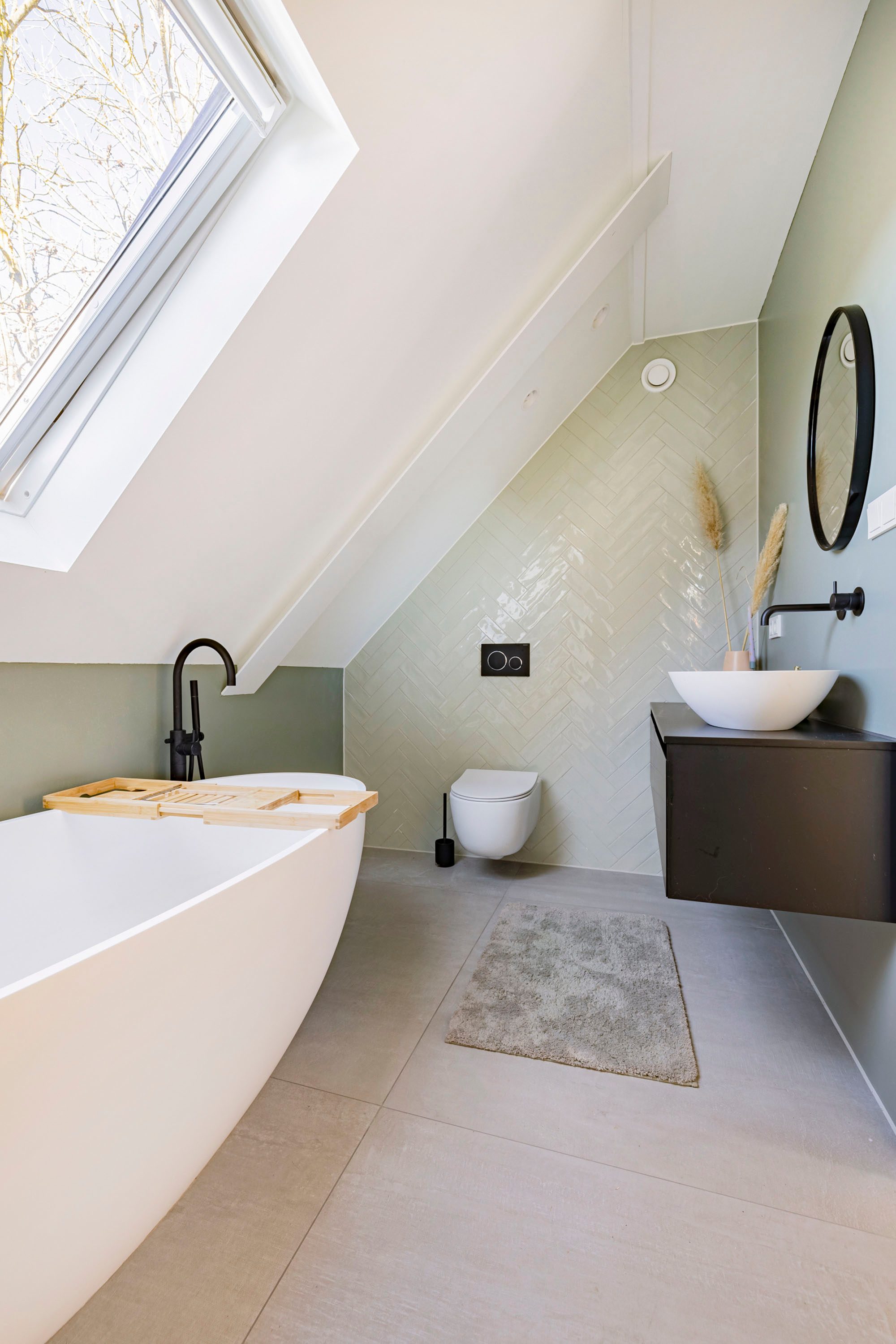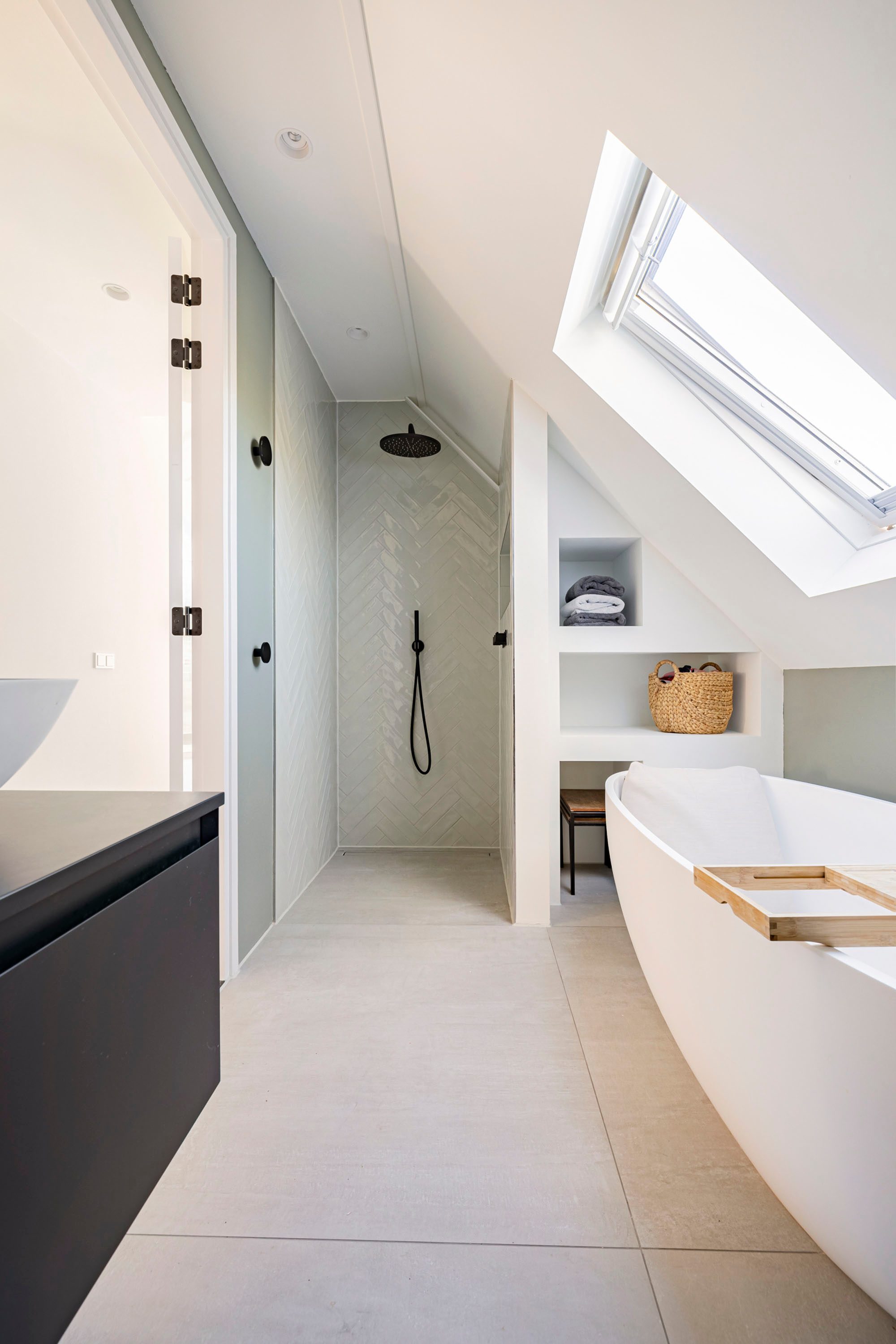 De eerste badkamer is bereikbaar vanaf de overloop en voorzien van een losstaand bad, inloopdouche, wastafel met wastafelmeubel en toilet. Afzuiging middels mechanische ventilatie en daglicht middels een dakraam. De tweede badkamer is en suite aan de hoofdslaapkamer. Deze is voorzien van een ruime inloopdouche, toilet en wastafel met wastafelmeubel. Ook hier is mechanische ventilatie aanwezig en een dakraam. Beide zijn voorzien van luxe afwerking en ze beschikken allebei over vloerverwarming.