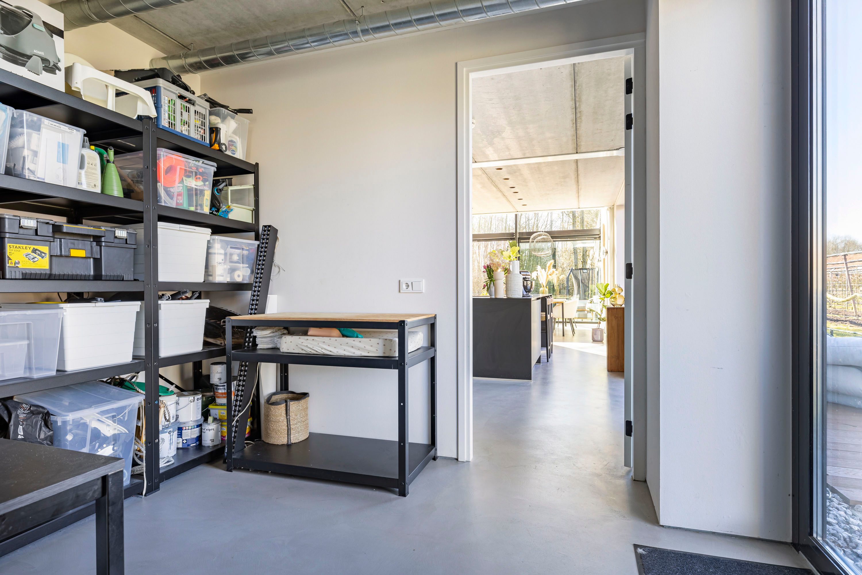 Vanuit de keuken is zowel de technische ruimte als de bijkeuken bereikbaar. In de technische ruimte zijn onder andere de warmtepomp en de verdeler van de vloerverwarming aanwezig. Ook is hier een tweede wasaansluiting aanwezig. De bijkeuken biedt ruimte voor veel opbergmogelijkheden. Aan de achterzijde is een ruime kamer aanwezig die bijvoorbeeld goed zou kunnen dienen als kantoorruimte. Momenteel is deze in gebruik als gedeelte kantoorruimte en een speelkamer voor de kinderen. Separaat is hier nog een extra toilet aanwezig.