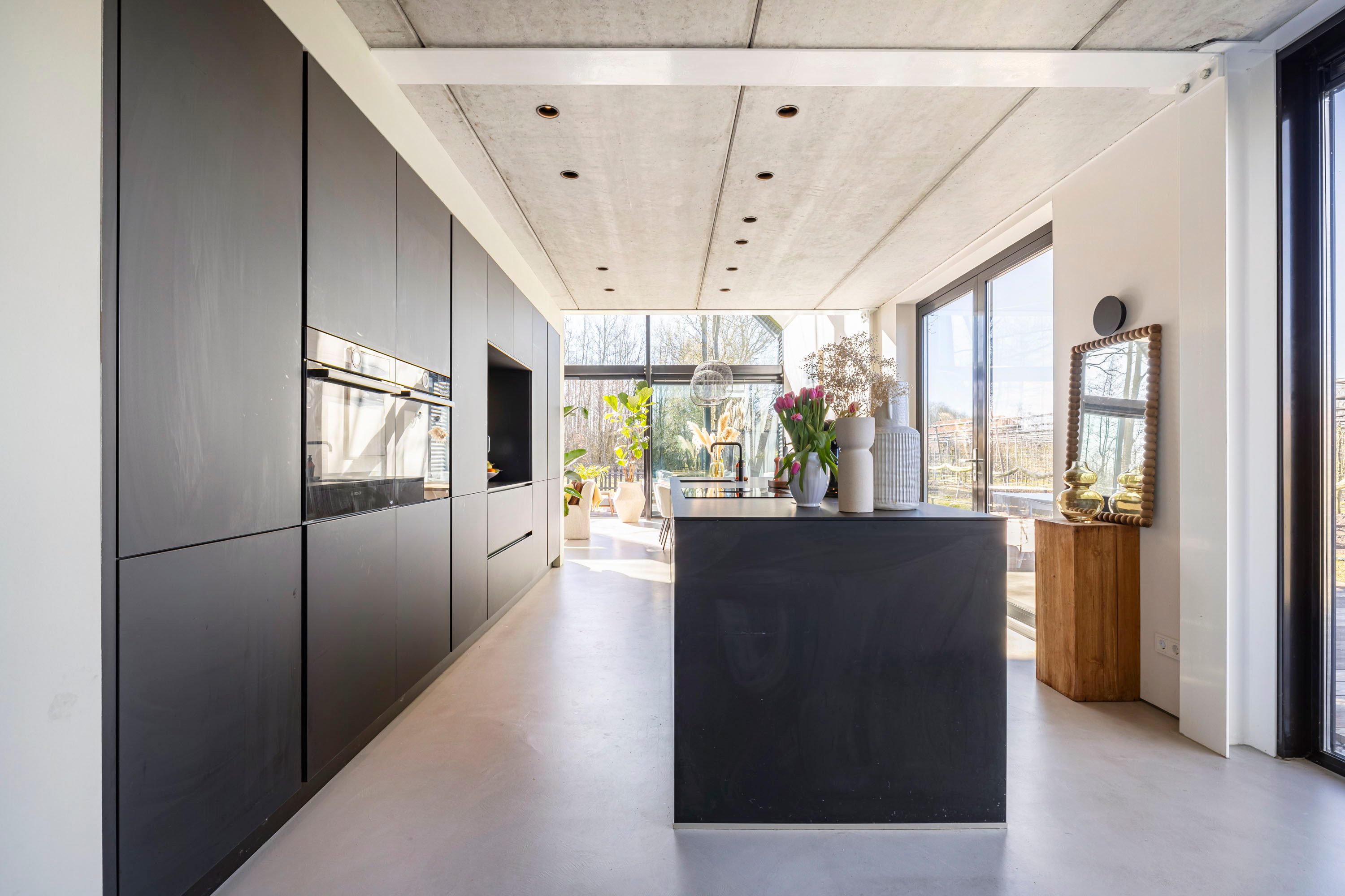 Door de vele ramen heeft het veel lichtinval en is het een heerlijke ruimte om te zijn. Aangrenzend bevindt zich de keuken. De liefhebber voor koken zal deze keuken omarmen. De keuken beschikt over zeer veel werkruimte en luxe inbouwapparatuur. Koken en tegelijkertijd genieten van de omgeving. Door de gevels omgeven door glas is het hier allemaal mogelijk. De keuken beschikt over de volgende apparatuur: