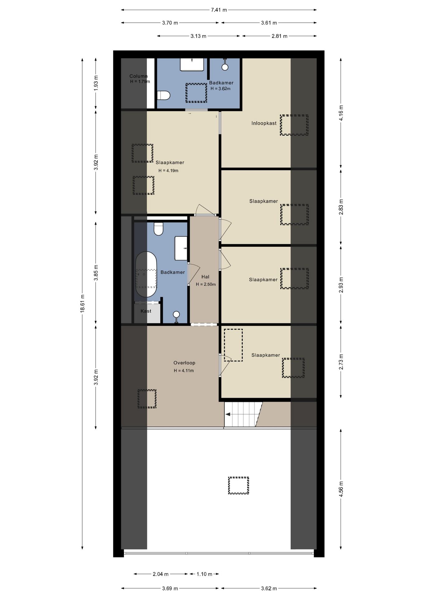 + Hoge plafonds met op het hoogste punt zelfs 6,9 meter hoogte;