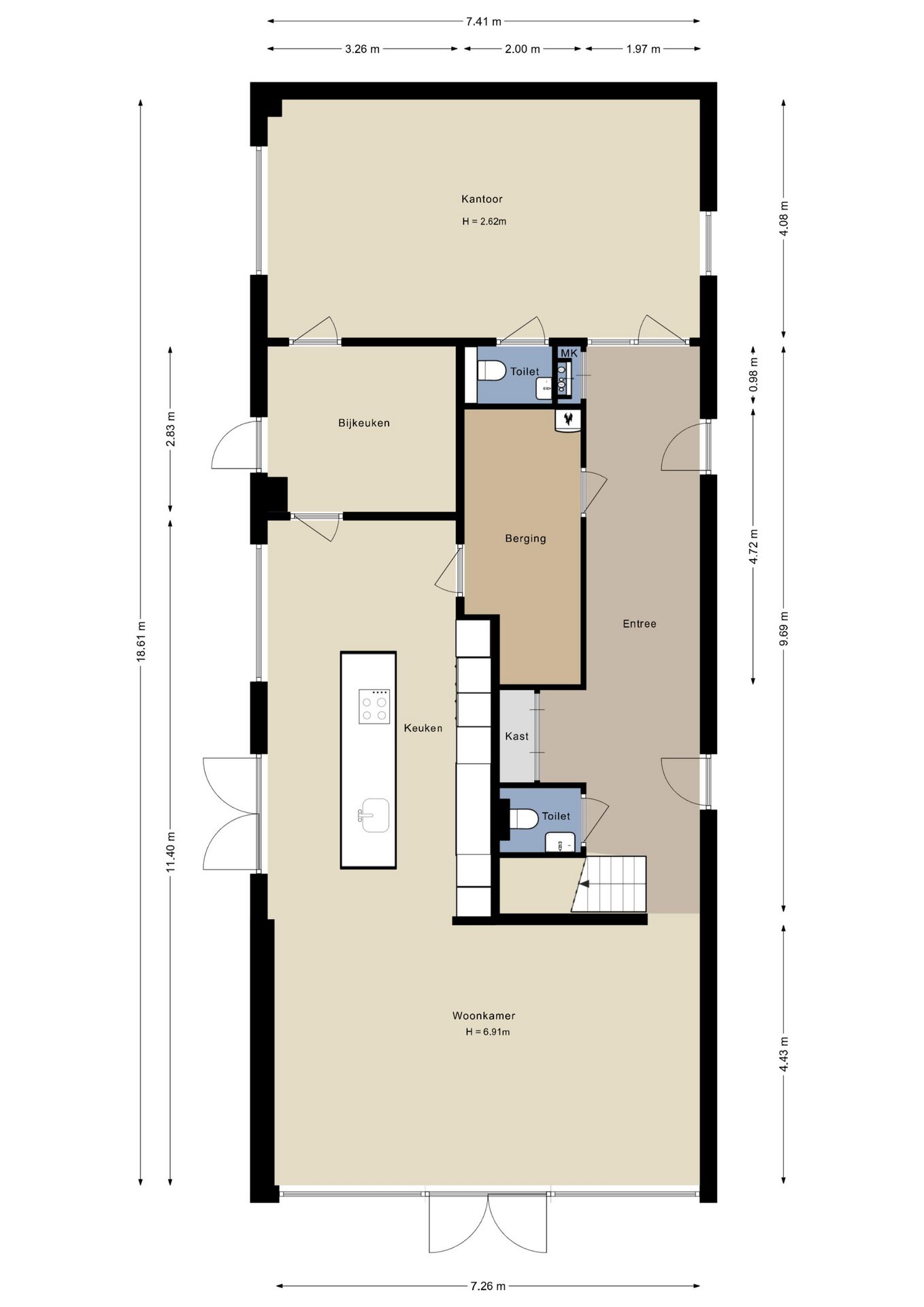 De woning is te betreden vanaf de zijkant van de loft. Een tweetal voordeuren geeft de mogelijkheid om het wonen en zakelijke deel van elkaar gescheiden te houden. Bij binnenkomst merk je gelijk de rust, de fijne lichtinval en de luxe van deze woning.
