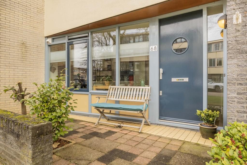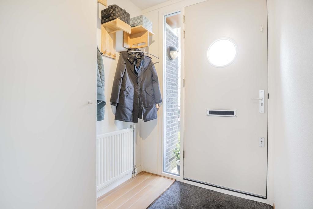 Via de voortuin loop je naar de overdekte entree van deze zeer goed onderhouden woning. Bij binnenkomst kom je in de hal die toegang geeft tot de meterkast en de woonkamer.