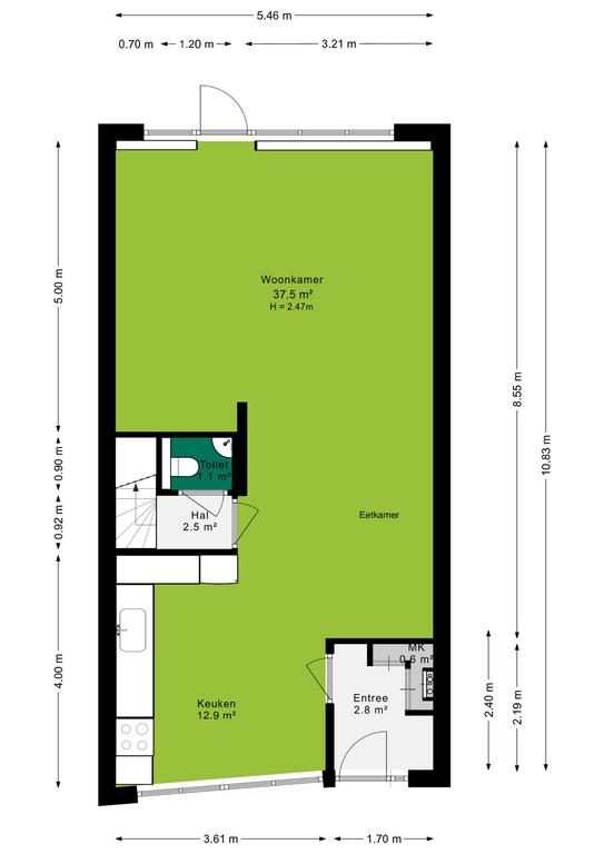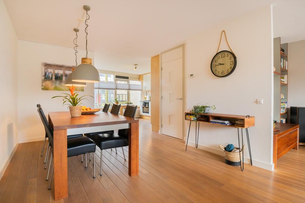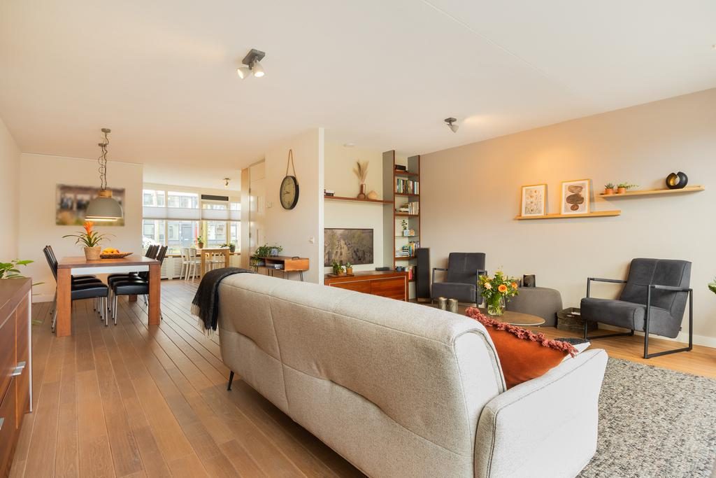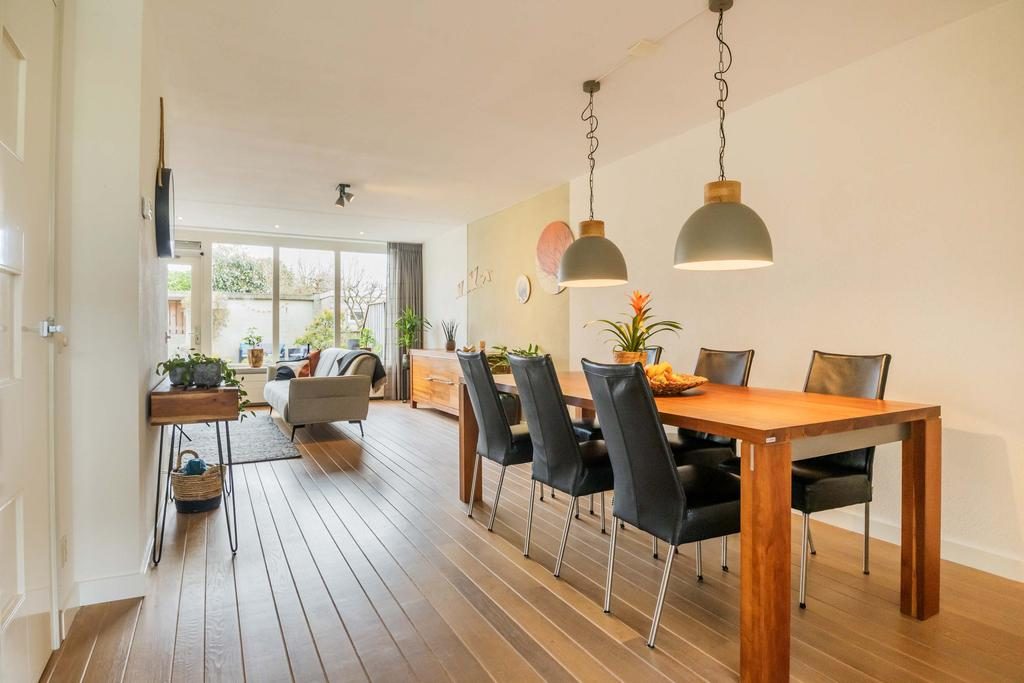 De woonkamer is een grote zitkamer gelegen aan de achterzijde van de woning met een prachtige eikenhouten vloer, veel daglicht dankzij de grote raampartijen en meer dan genoeg ruimte voor een zithoek en een tv-meubel. Vanuit de woonkamer is er toegang tot het trappenhuis naar de eerste verdieping. Hier bevindt zich ook het toilet. Deze is voorzien van een fonteintje en een zwevend toilet.