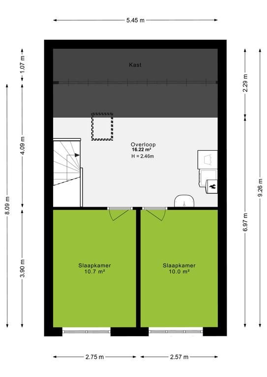 De tweede verdieping heeft een zeer ruime voorzolder, deze geeft toegang tot twee slaapkamers. Op de voorzolder zijn de C.V.-ketel, wasmachine en droger geïnstalleerd, ook is hier een extra wastafel aanwezig. Daarnaast is er meer dan voldoende bergruimte aanwezig en lichtinval middels een dakraam. De voorzijde is recht opgetrokken wat ervoor zorgt dat er twee ruime slaapkamers aanwezig zijn.