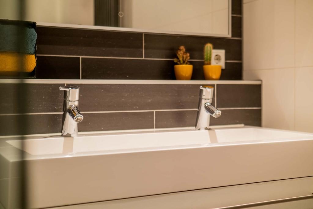 + Wastafel met dubbele kraan, spiegel en wastafelmeubel;