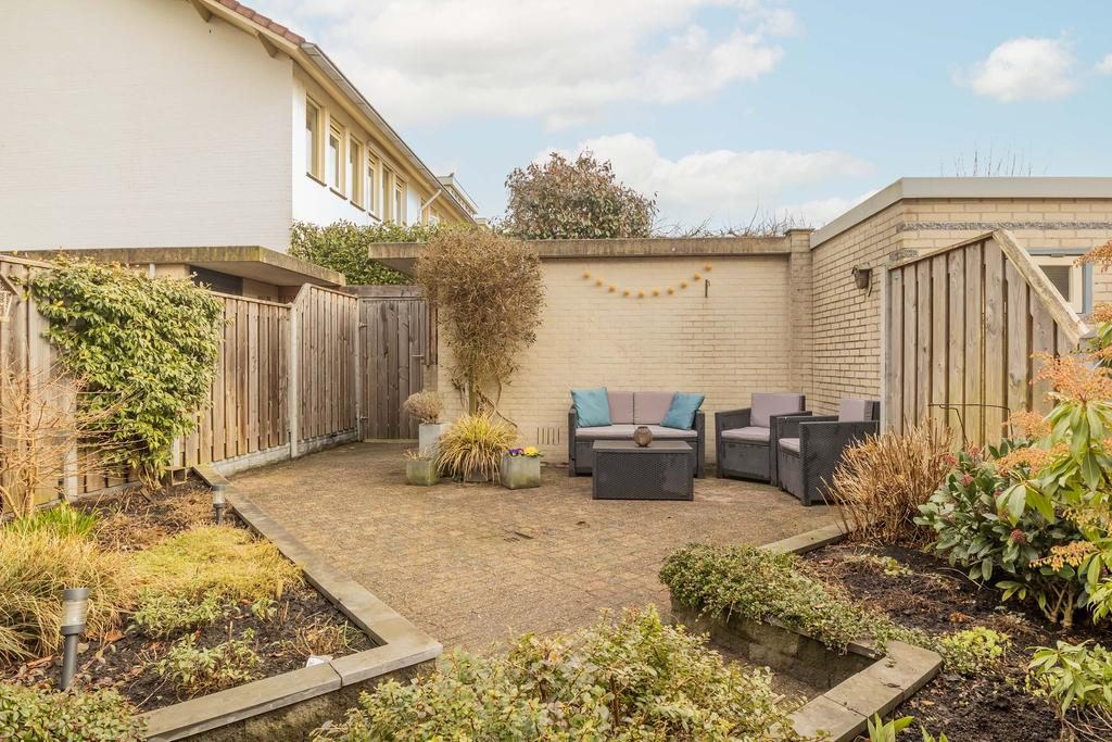 De tuin is fraai aangelegd en voorzien van een terras met borders en vaste beplanting. Door de vrije ligging is dit een prettige plek met veel privacy. Achterin de tuin bevindt zich de vrijstaande stenen berging. De tuin is via een achterom te bereiken.