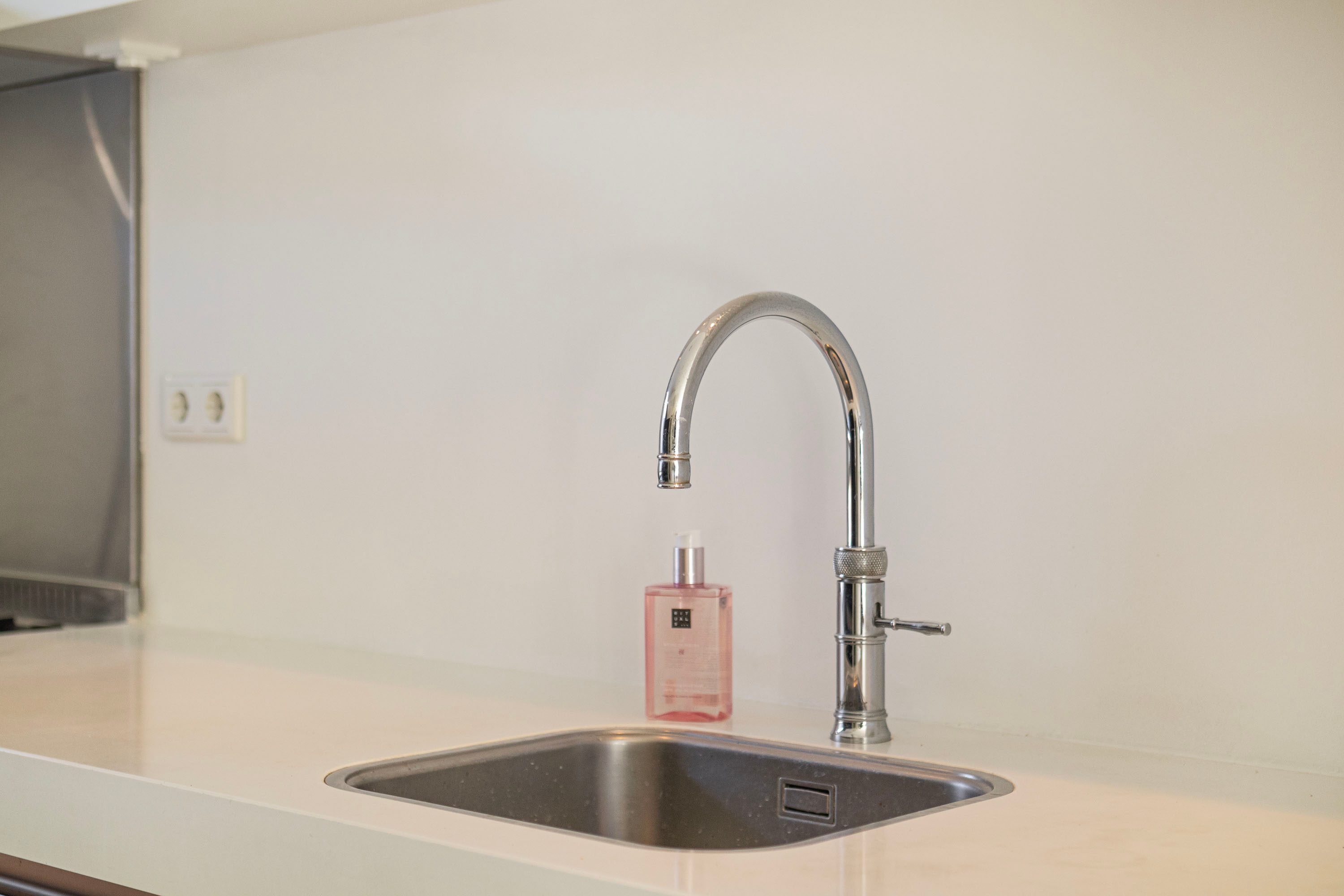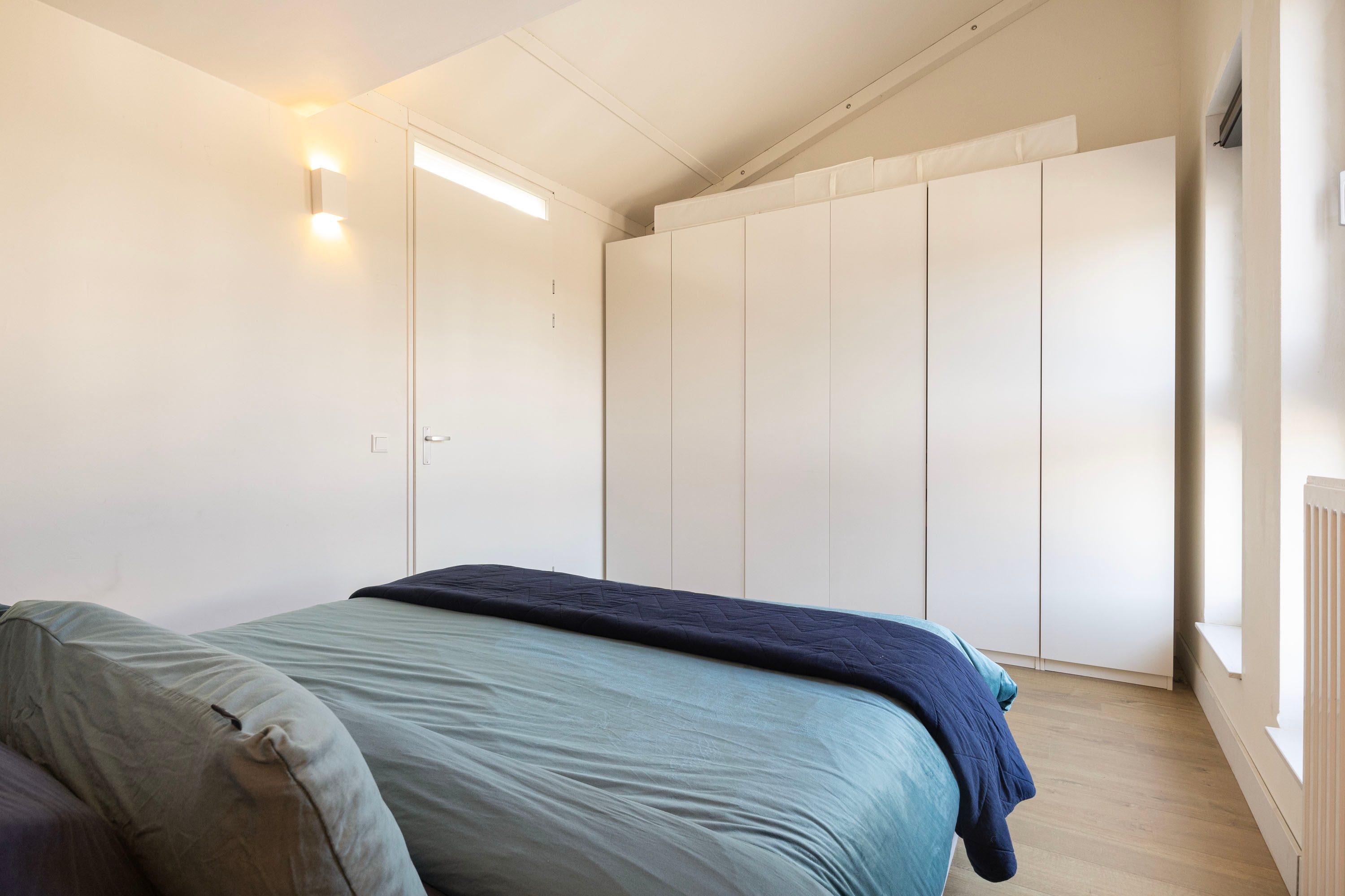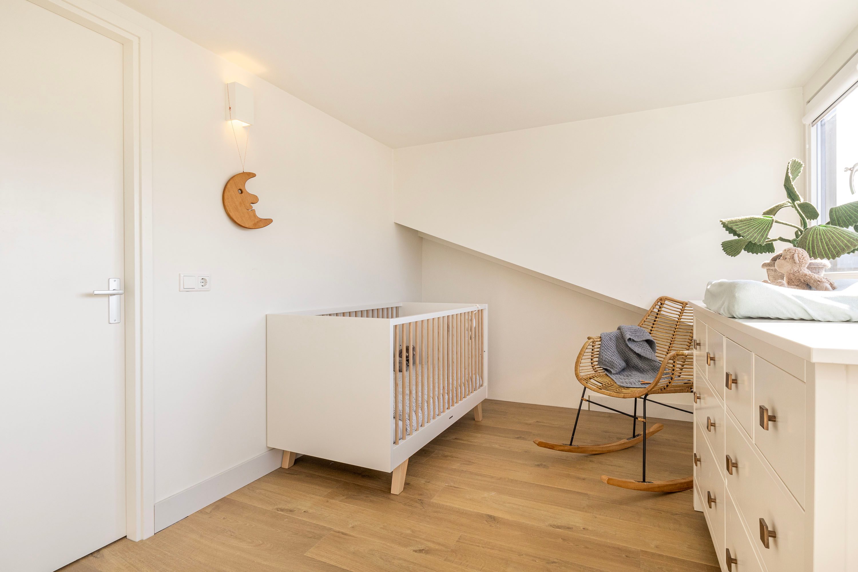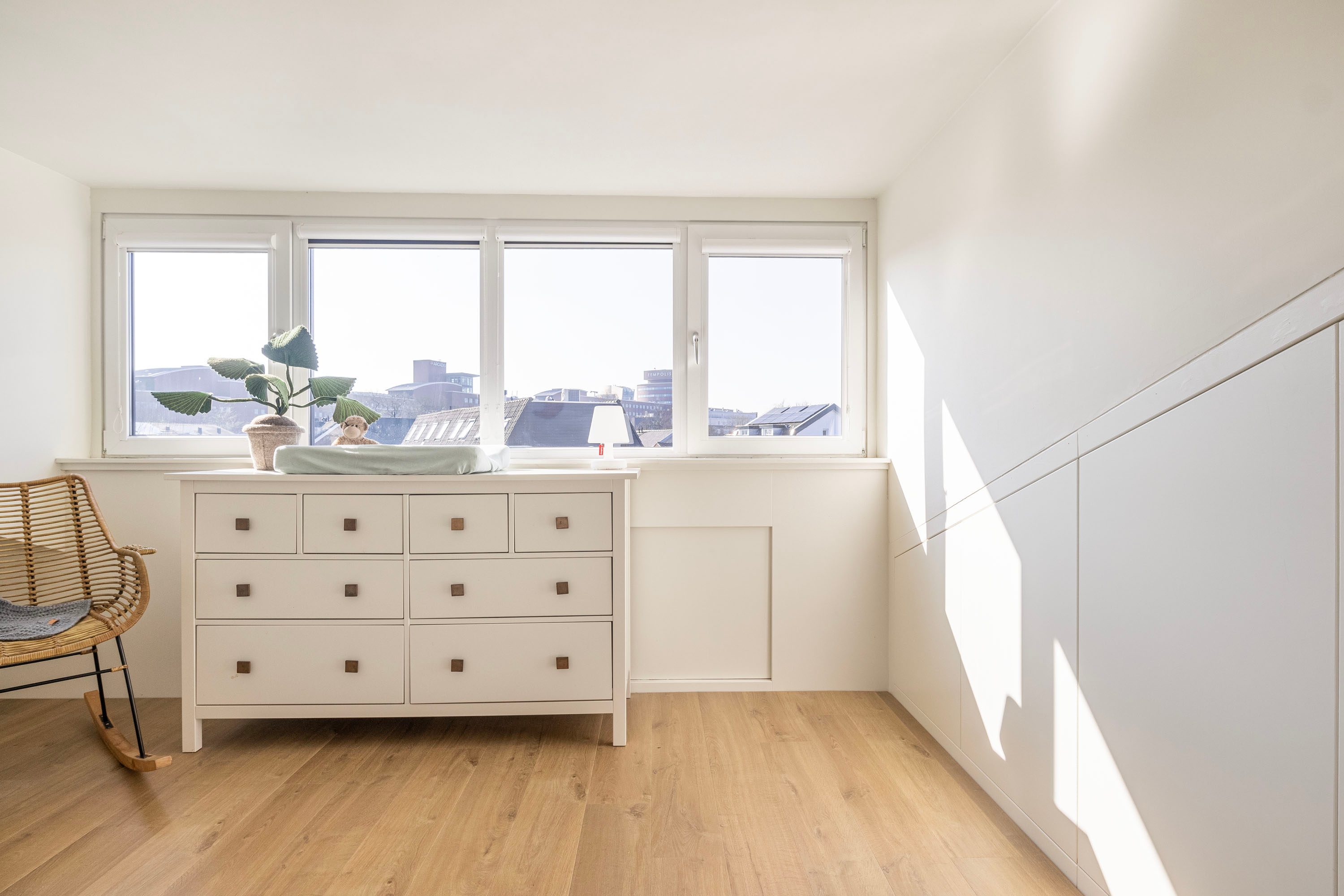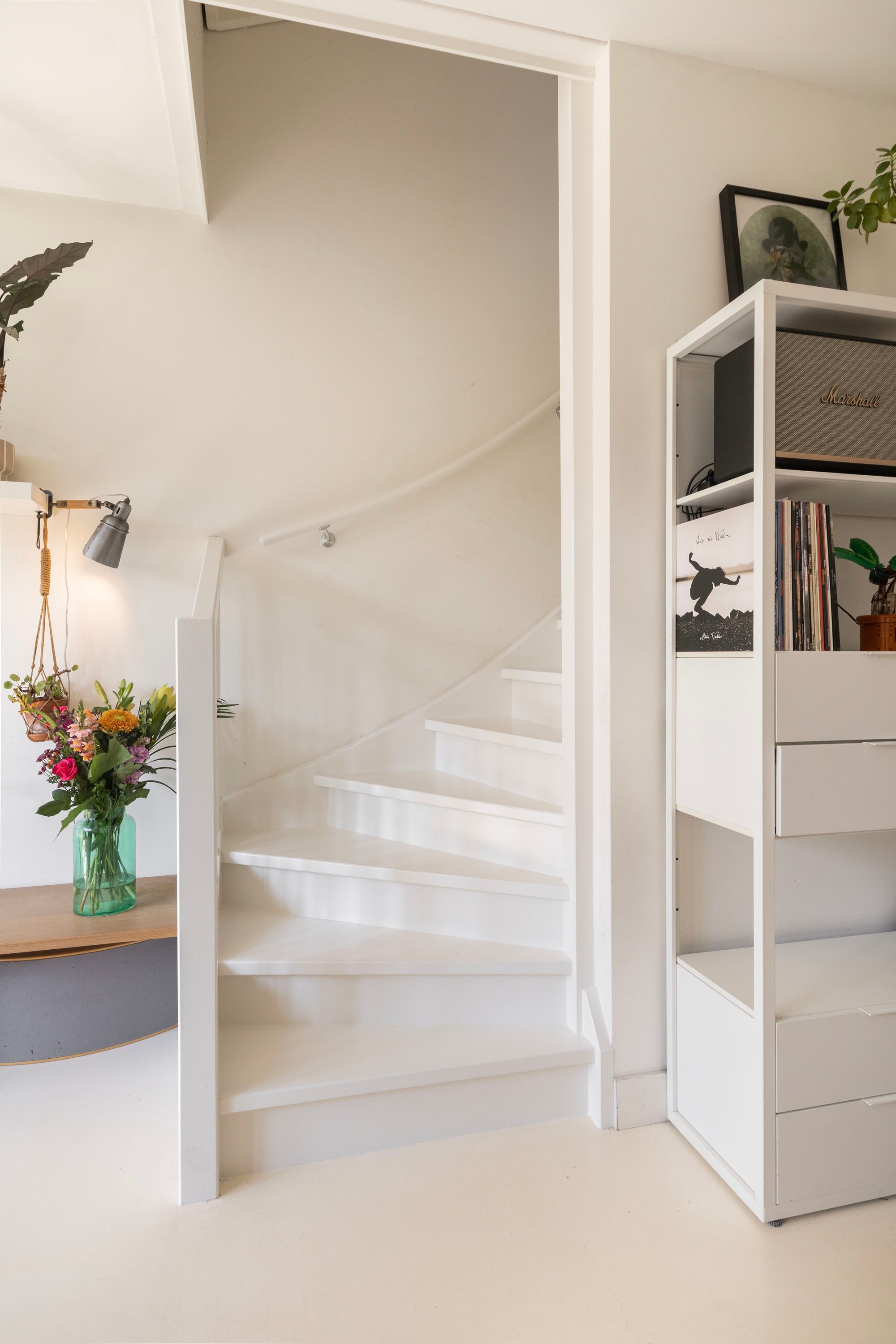 De vloer is afgewerkt met een gietvloer en voorzien van comfortabele vloerverwarming. De witte wandafwerking maakt dat de ruimte licht en ruimtelijk aanvoelt.