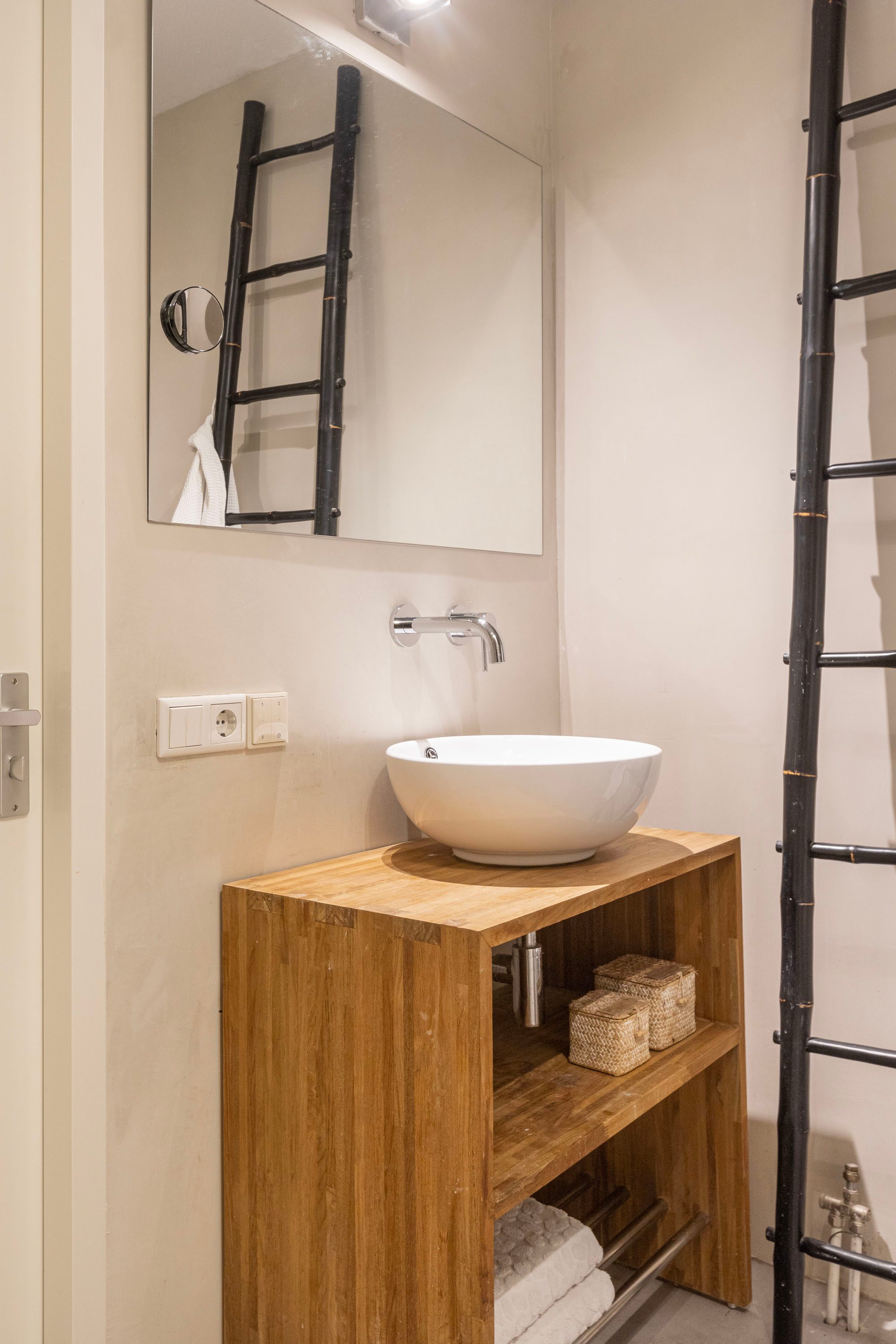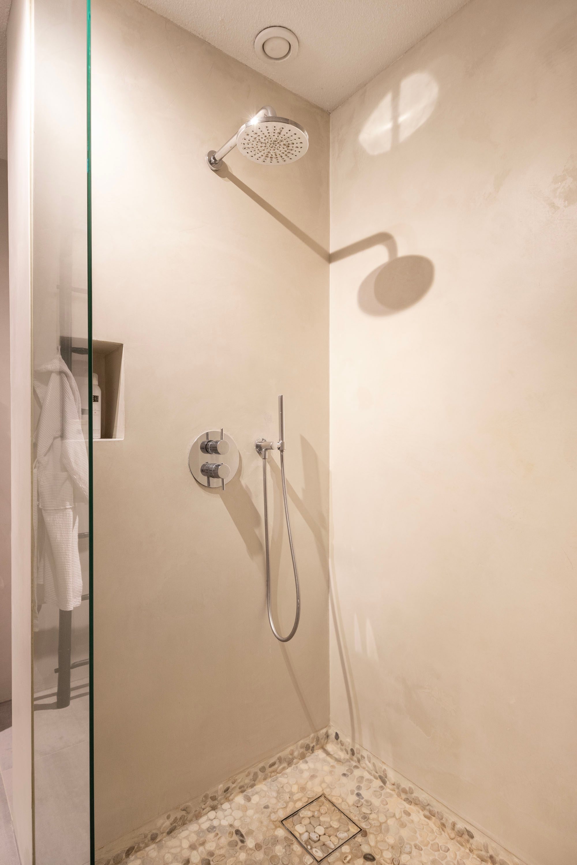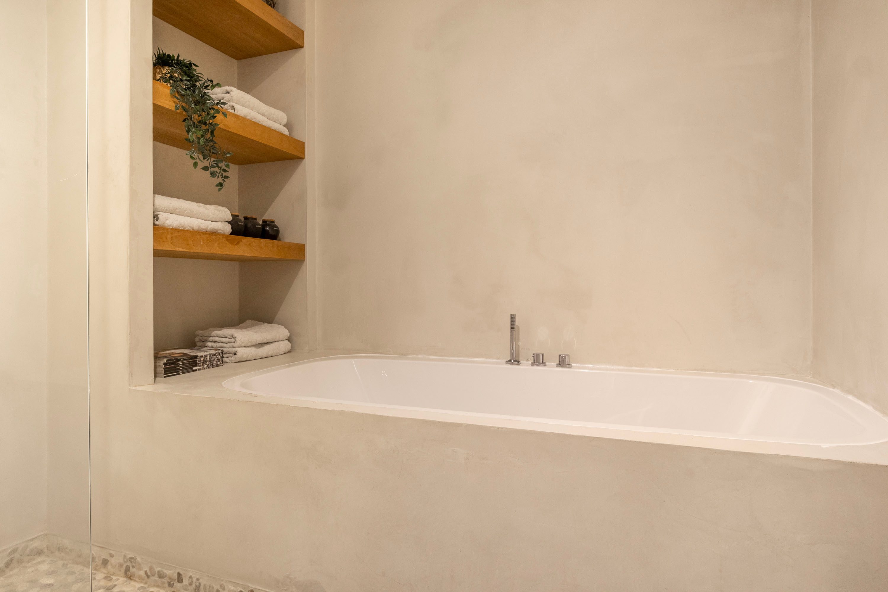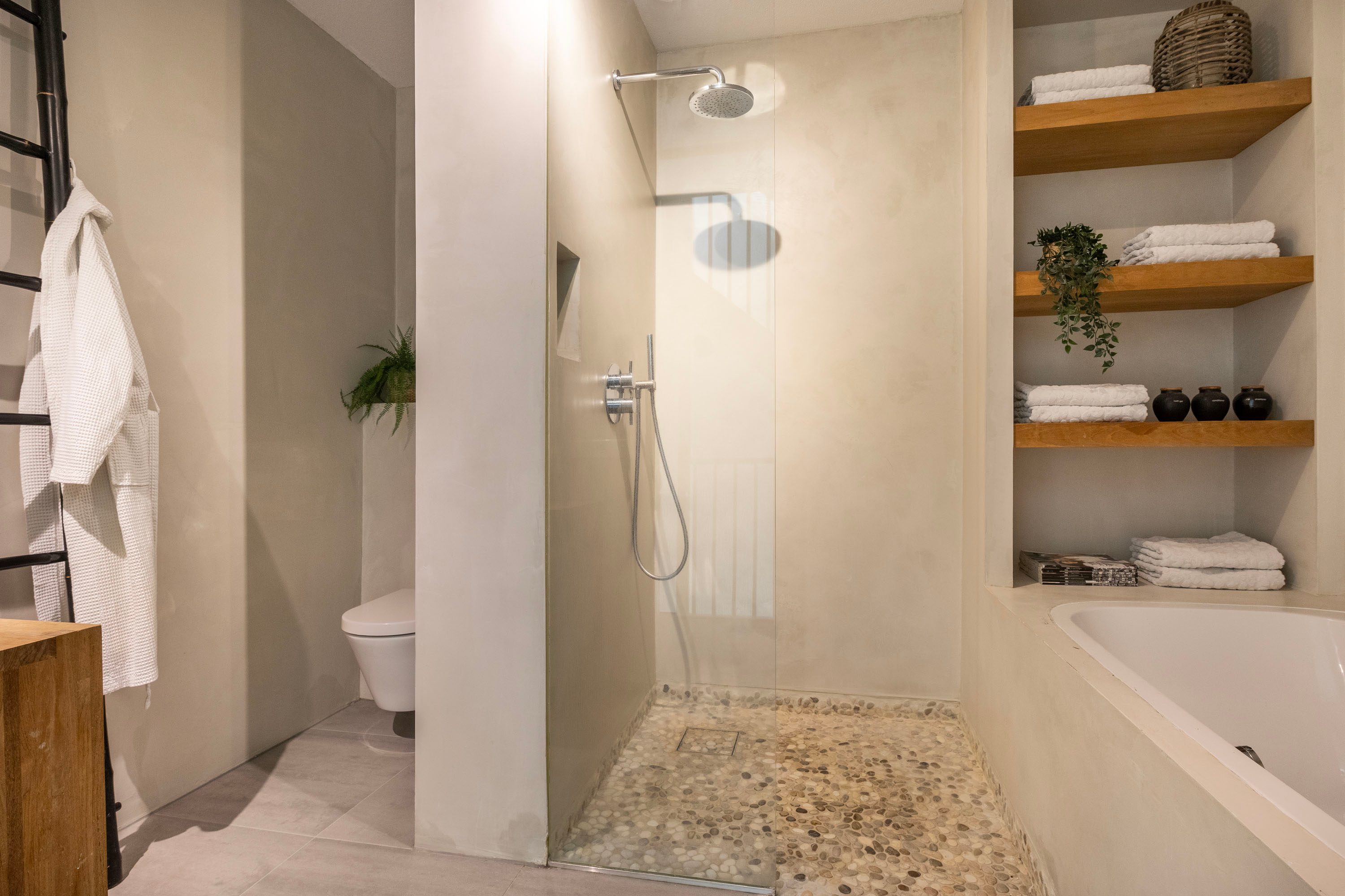 De vloer van de badkamer is betegeld met een grijstint. De wanden zijn voorzien van beton ciré. De douche en kraan zijn weggewerkt in de wanden. De sfeervolle houten schappen bij het bad en nisjes maken het geheel af.