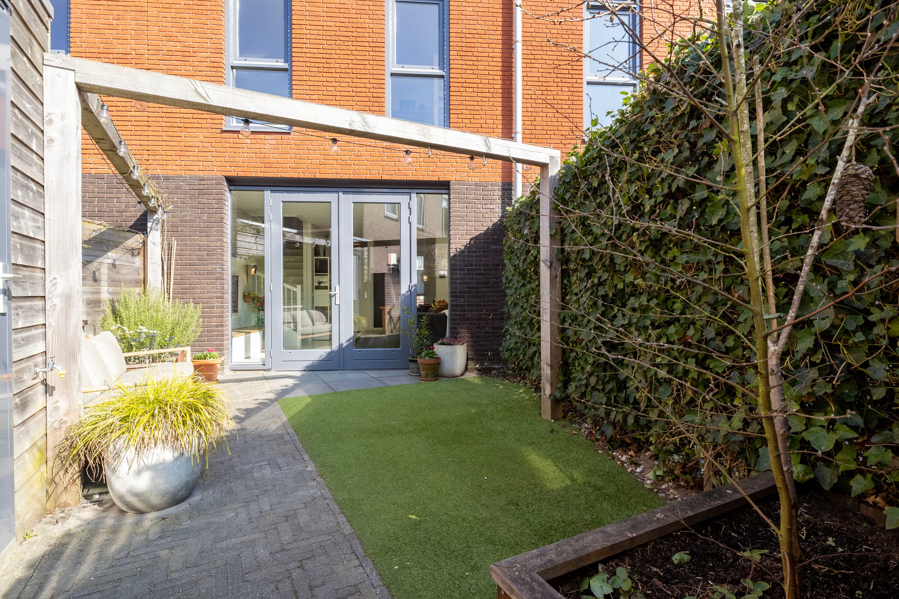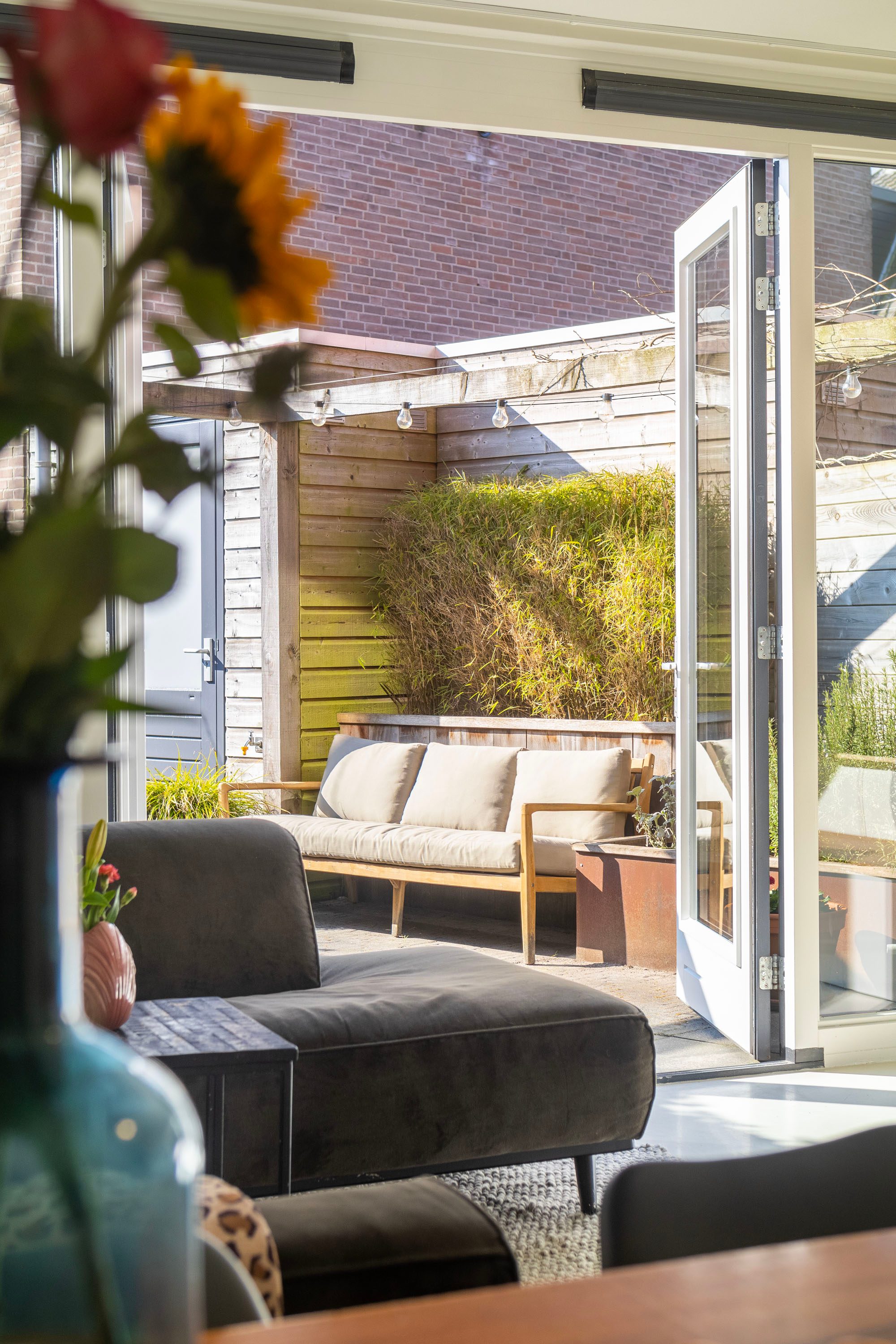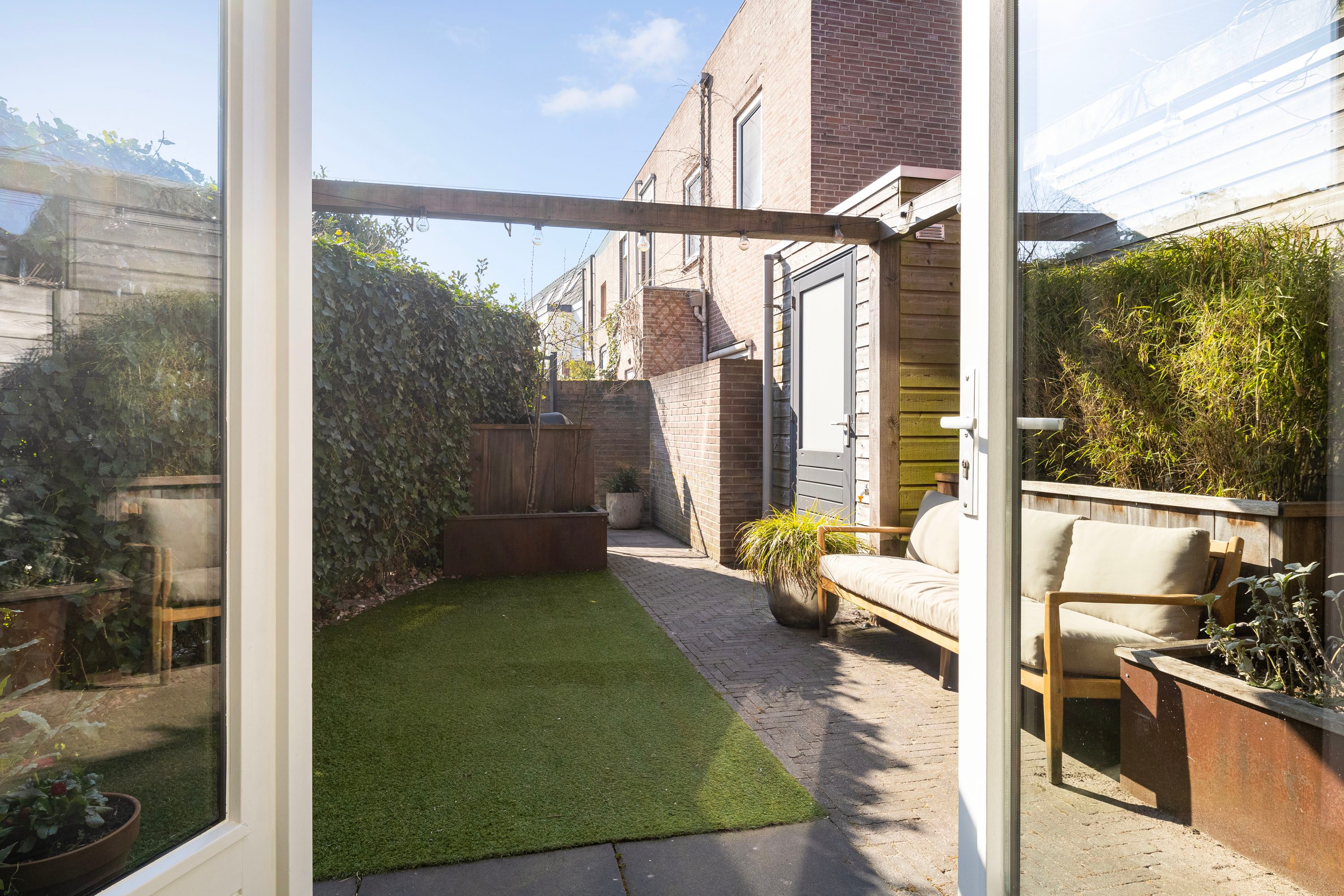 Via de openslaande deuren stap je vanuit de woonkamer zo de onderhoudsvriendelijke achtertuin in. Deze tuin is gelegen op het zuidwesten. Via de eigen achterom kom je uit op een parkeerterrein met een eigen parkeerplaats. Er is plek voor één auto op het eigen perceel en daaraan grenzend een berging.