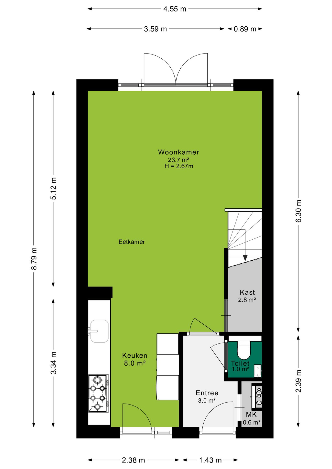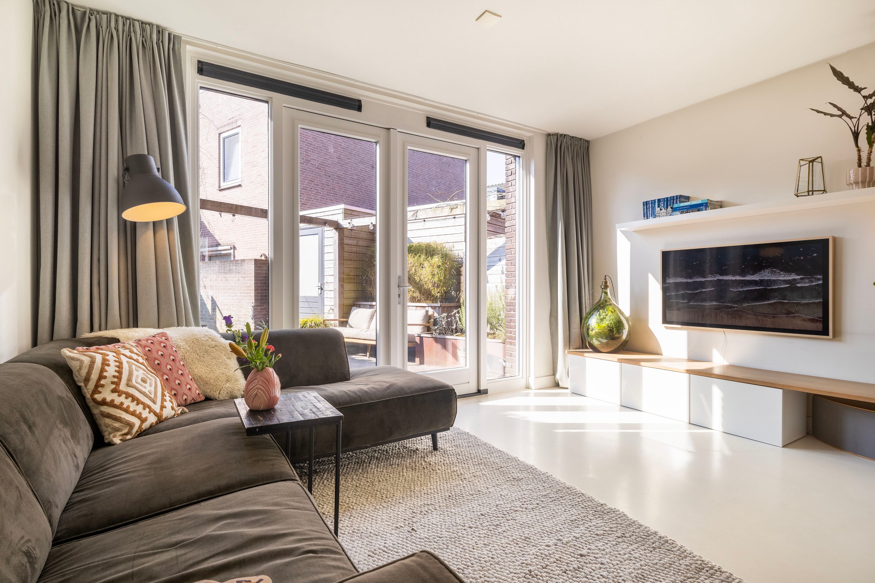 Entree, hal, meterkast, toiletruimte met zwevend toilet en fonteintje en toegang tot de woonkamer. De woonkamer is aan de achterzijde gelegen. Door de grote pui aan de achterzijde met het vele glaswerk komt er veel lichtinval binnen. De openslaande deuren zorgen er in de zomer voor dat de woonkamer wordt verlengd naar de tuin.