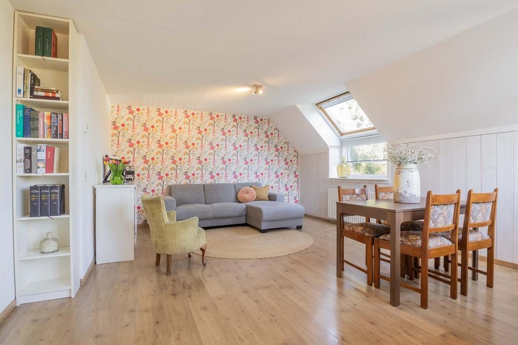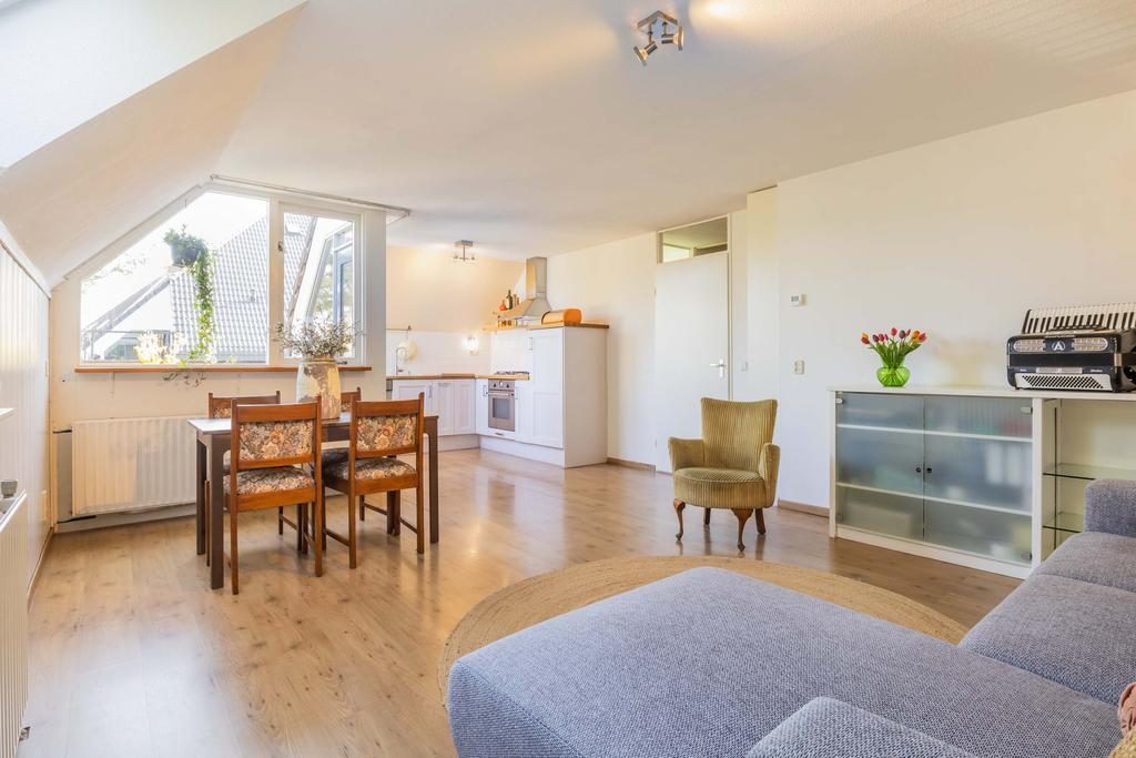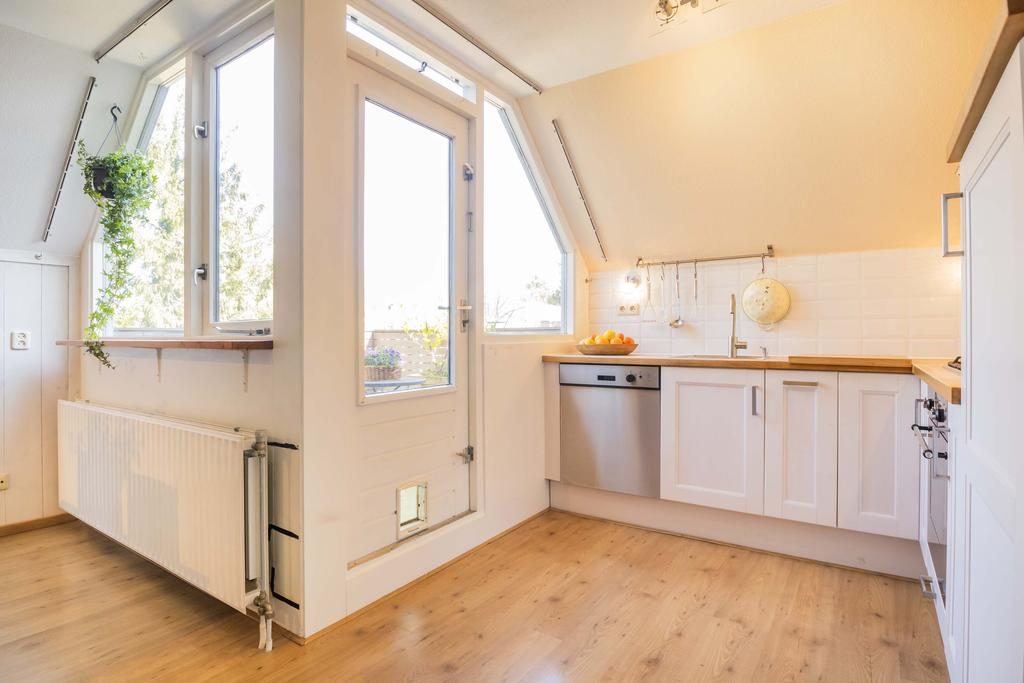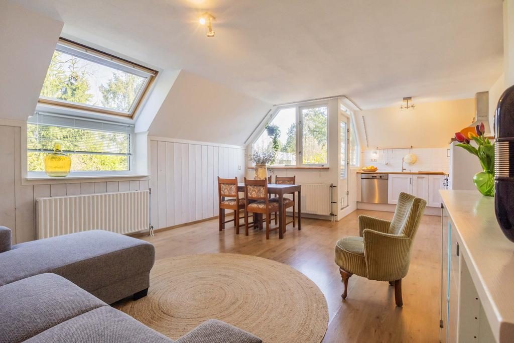 De warme kleur van de laminaatvloer en het grote dakraam, dat overvloedig natuurlijk licht binnenlaat, geven de woonkamer een gezellige uitstraling. Naast de woonkamer is de keuken, uitgevoerd in een hoekopstelling, die is voorzien van diverse inbouwapparatuur, waaronder begrepen: