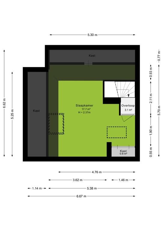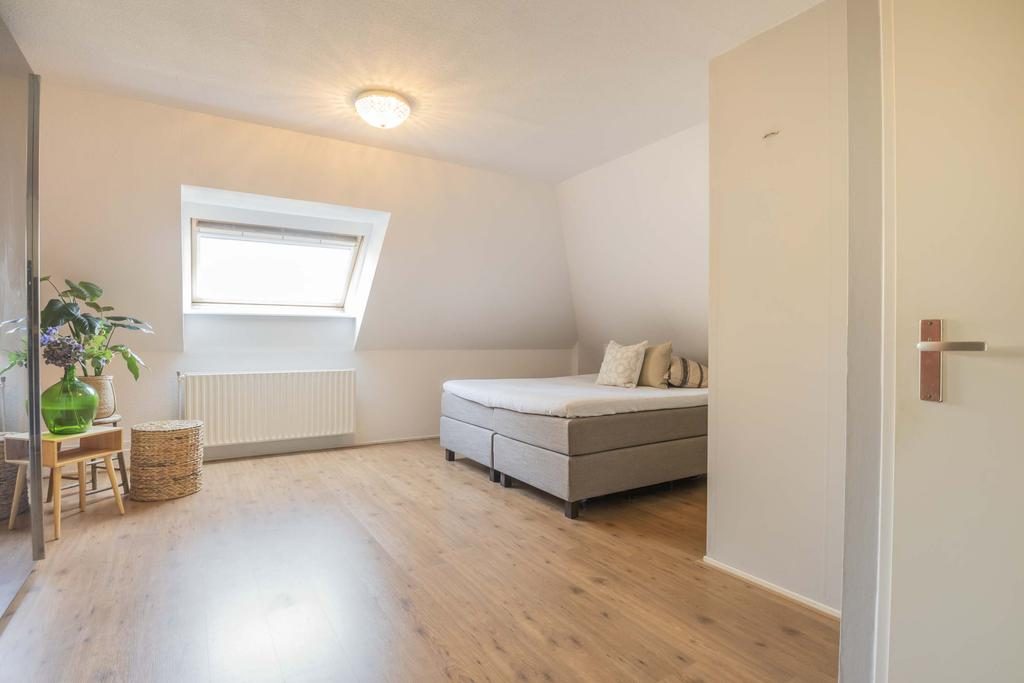 Via een vaste trap bereik je de grote tweede slaapkamer. Deze slaapkamer is keurig afgewerkt en heeft een vaste kast. Het dakraam zorgt voor voldoende daglicht. Tevens is hier een vlizo trap aanwezig naar de vliering die extra opslagruimte biedt.
