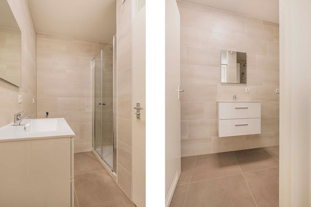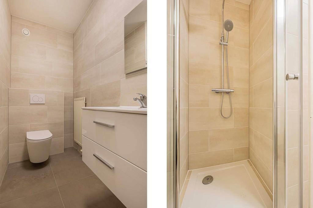 De volledig betegelde badkamer is vernieuwd in 2025 en is bereikbaar vanuit de hal van het appartement. De badkamer is voorzien van: