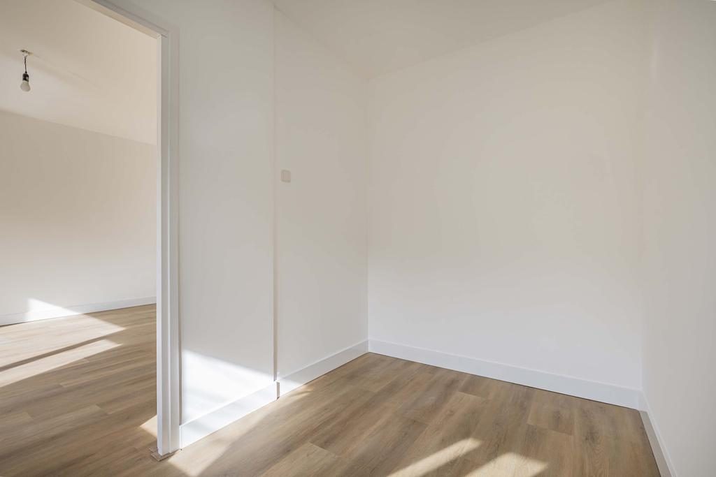 De gehele begane grond is, met uitzondering van de badkamer, voorzien van een PVC-vloer met hoge plinten en glad gestucte wanden.