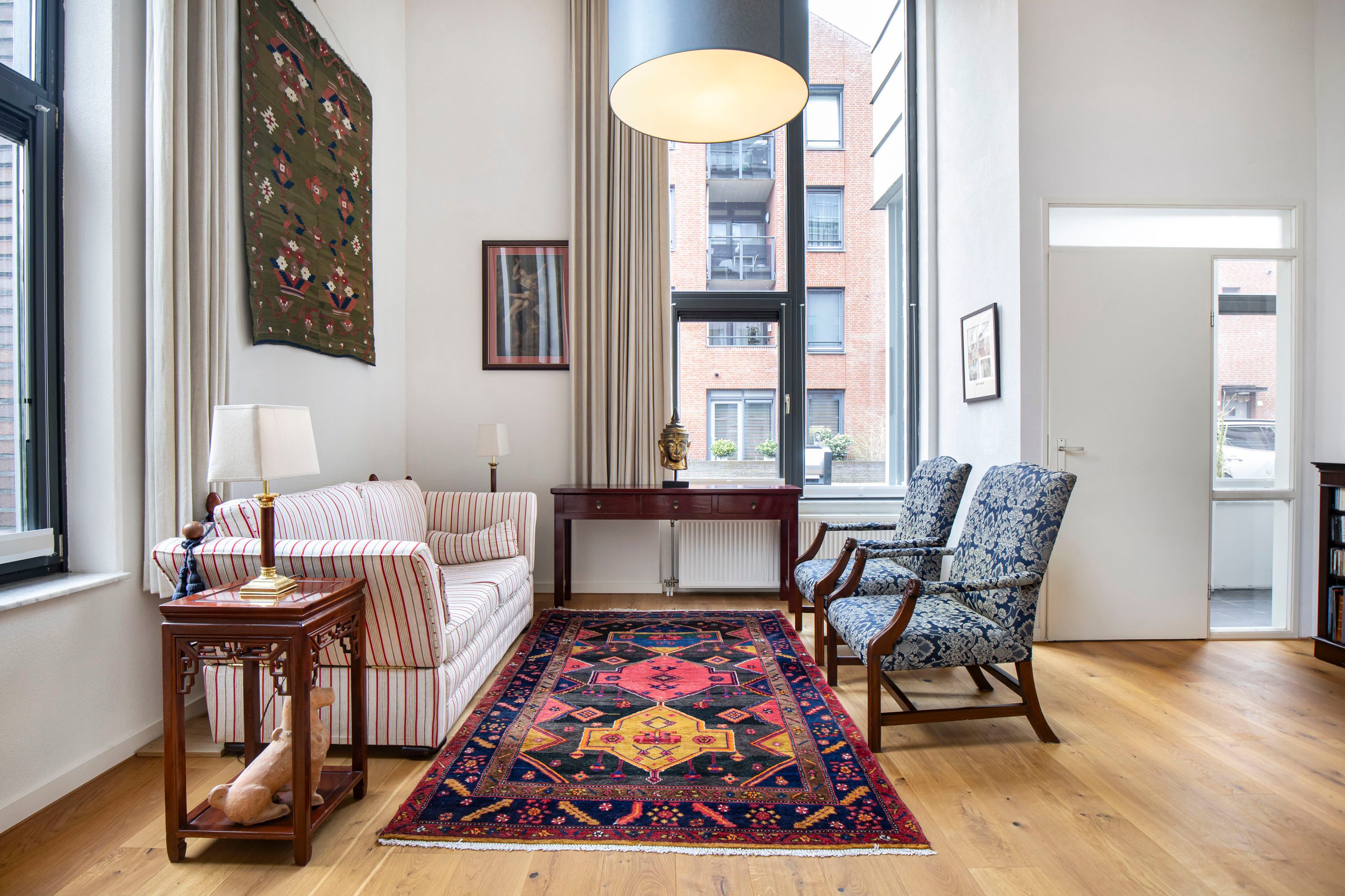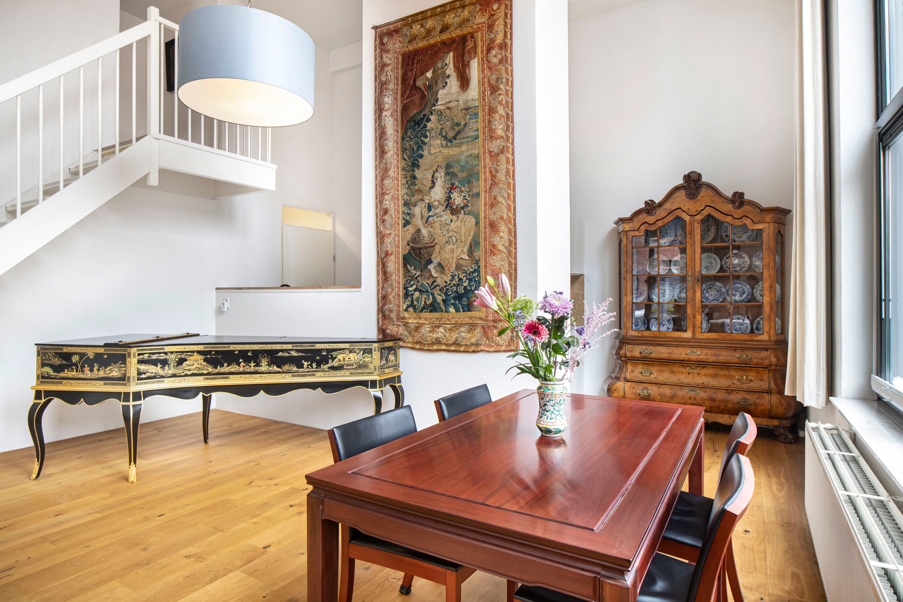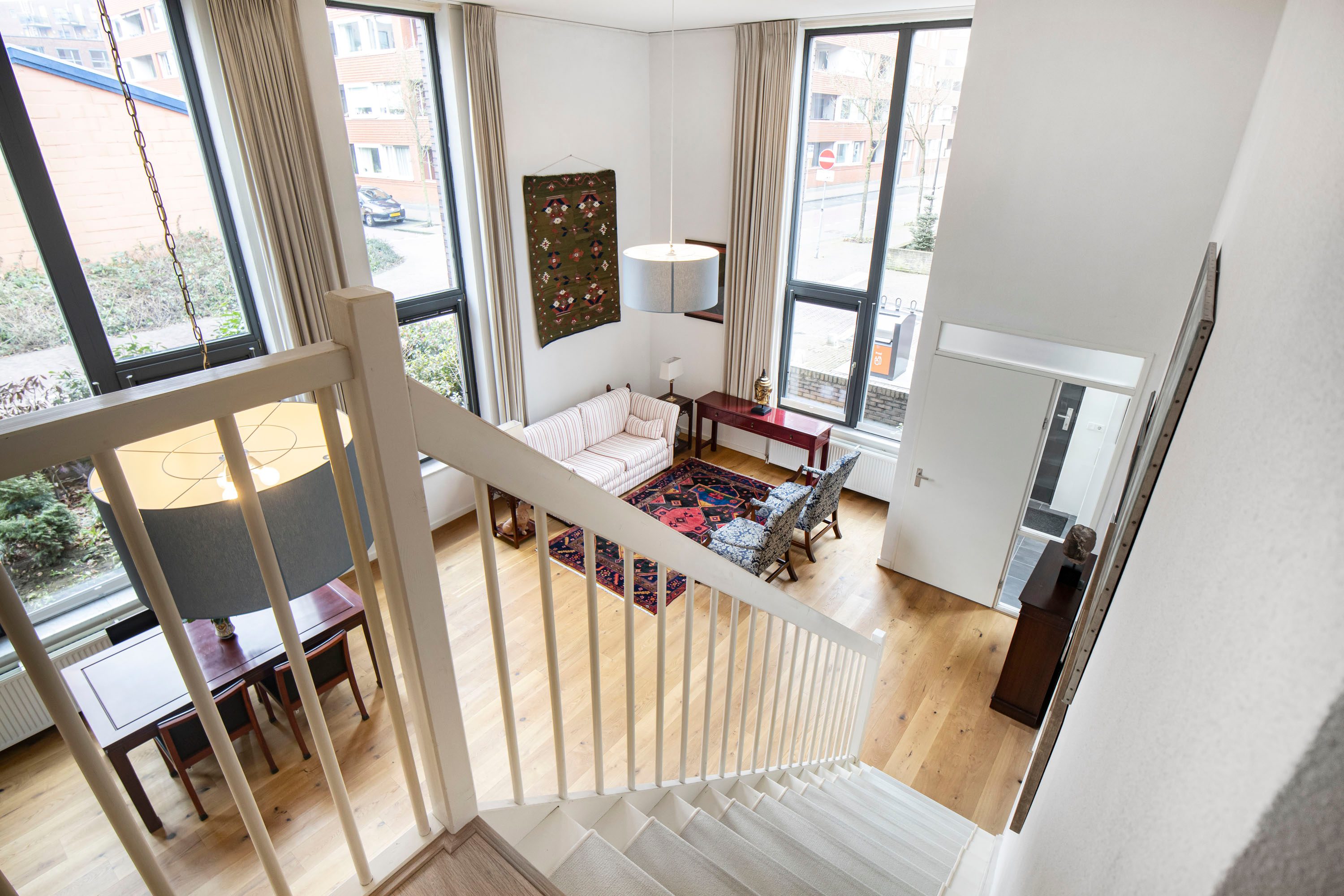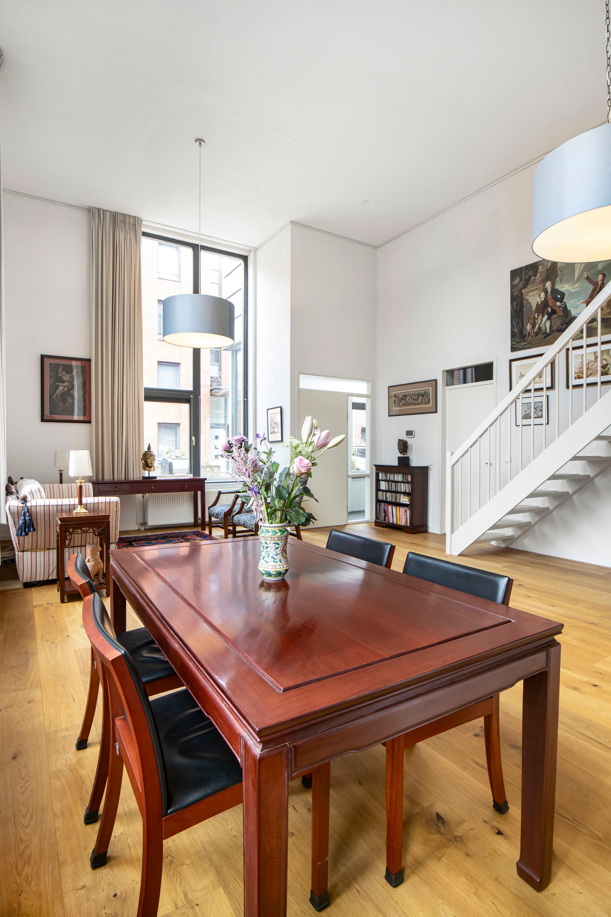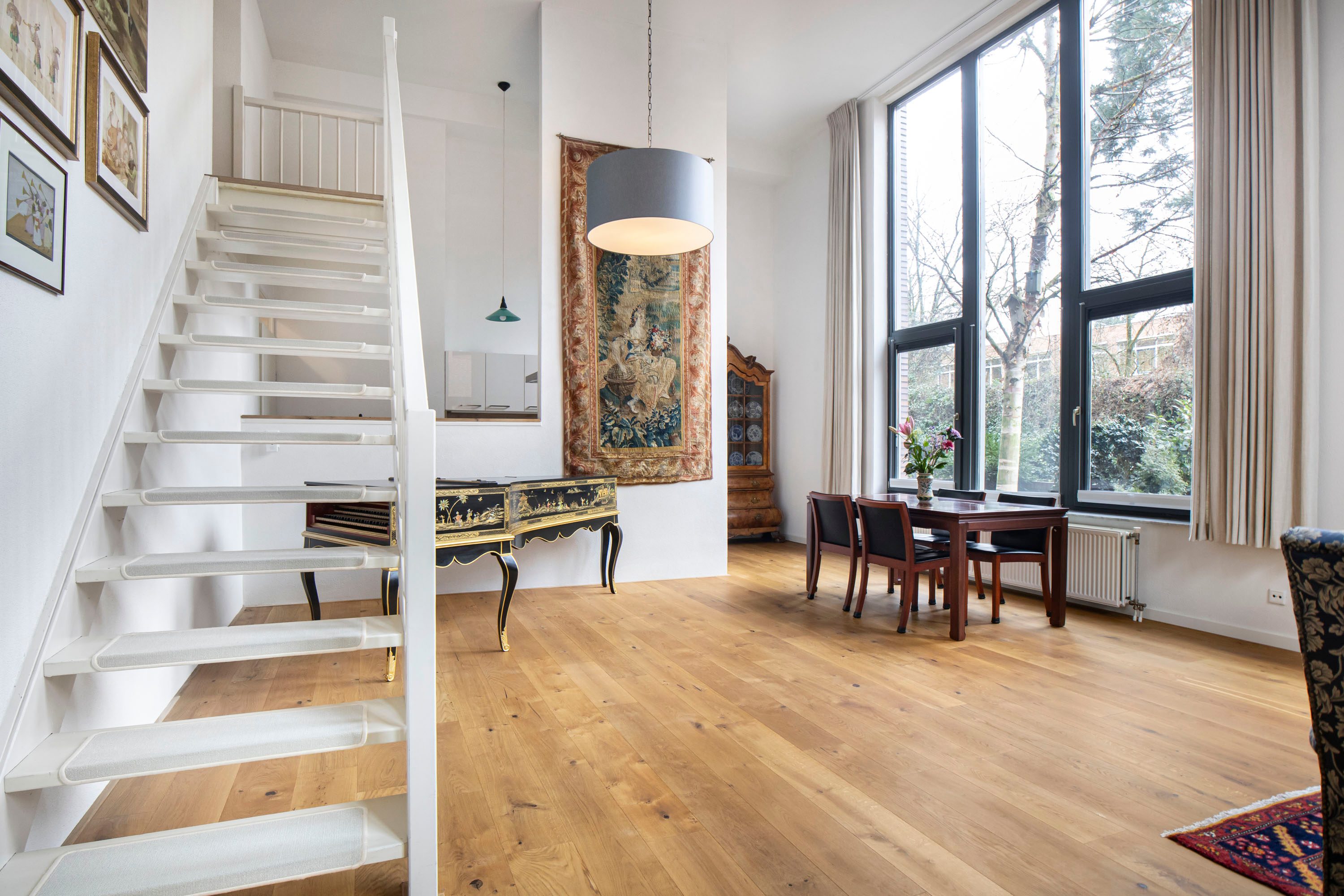 De woonkamer is direct indrukwekkend door het hoge plafond, wat zorgt voor een ruimtelijk gevoel en veel daglicht. De open indeling en vide geven de woning een speels en modern karakter.