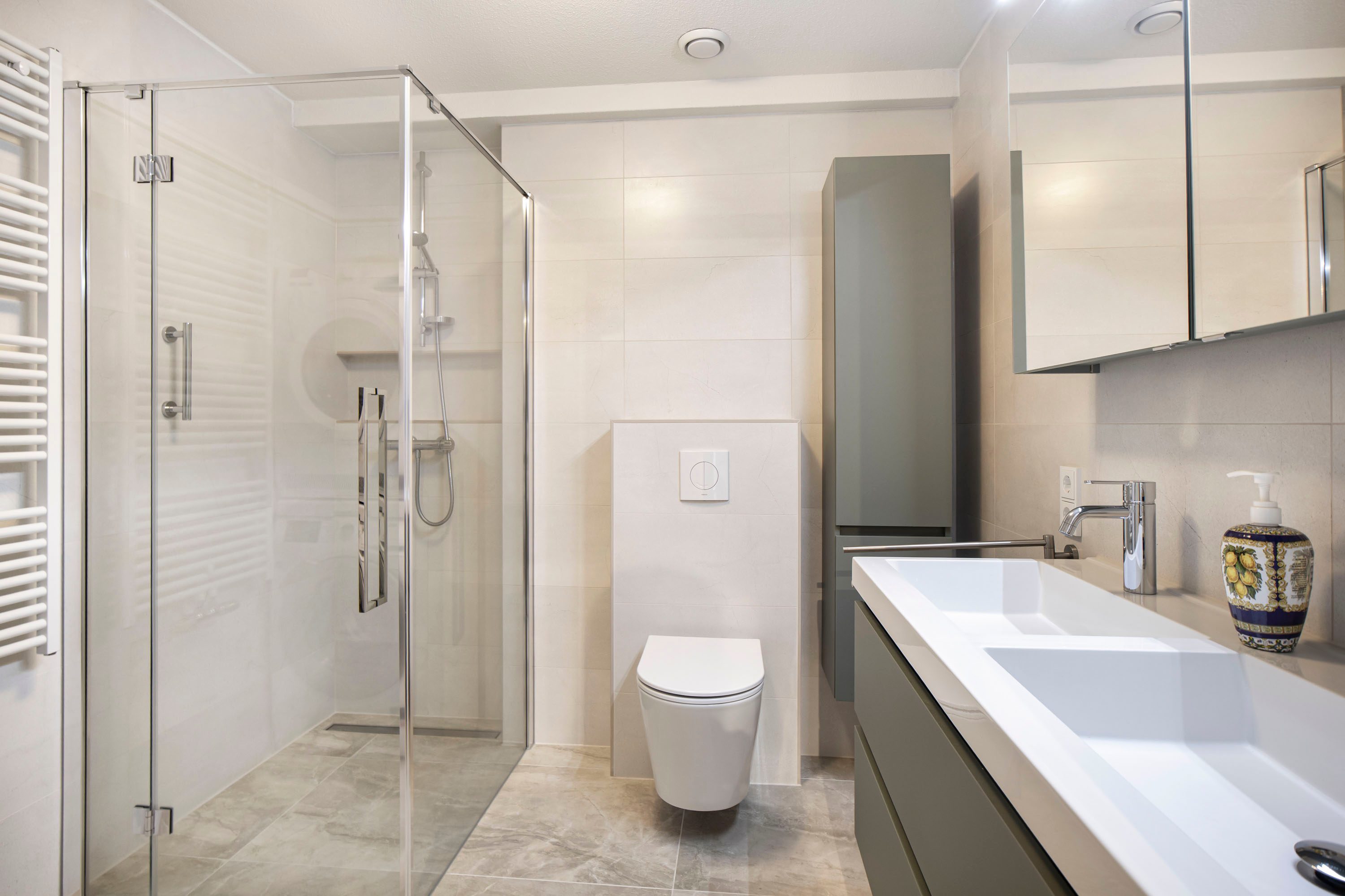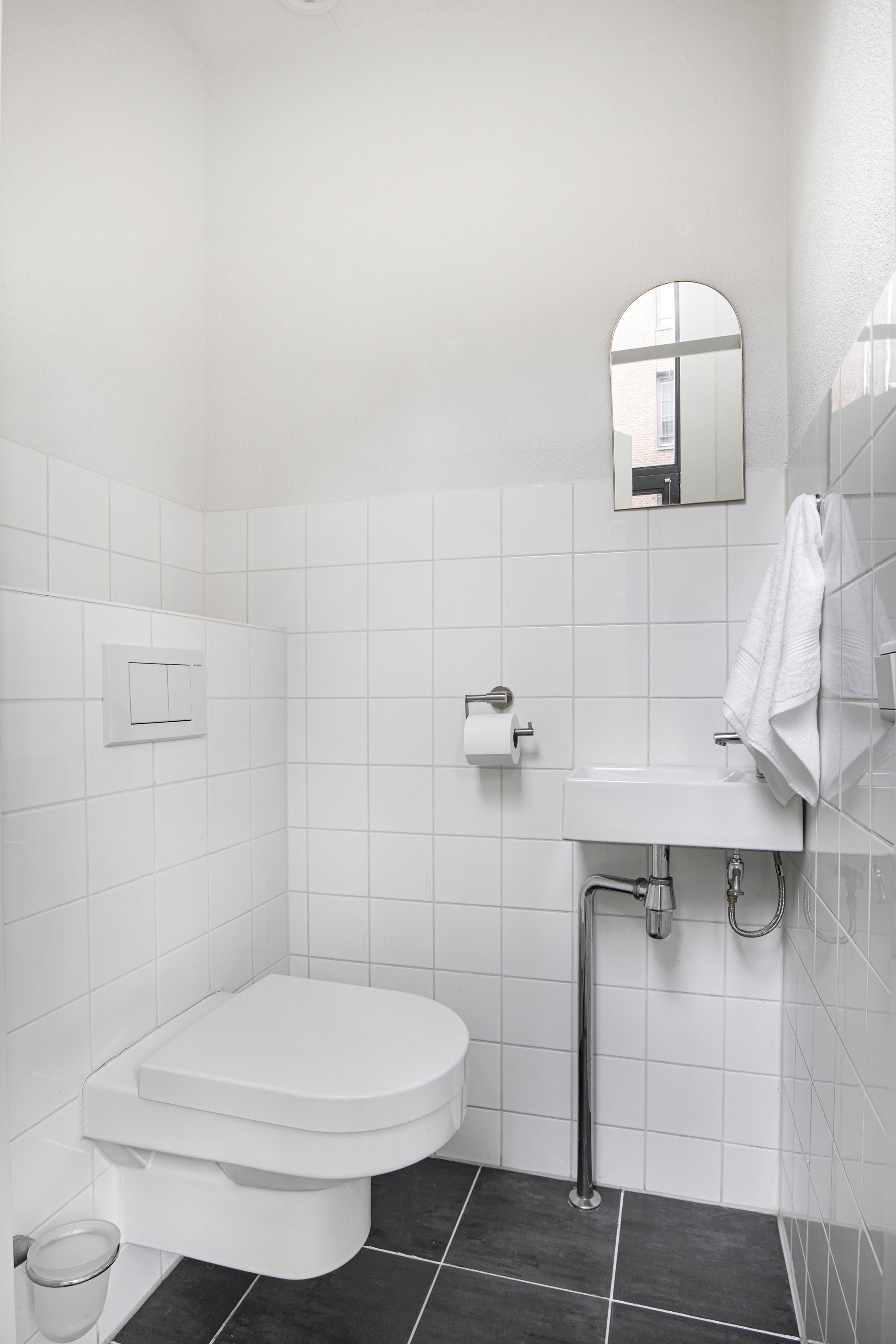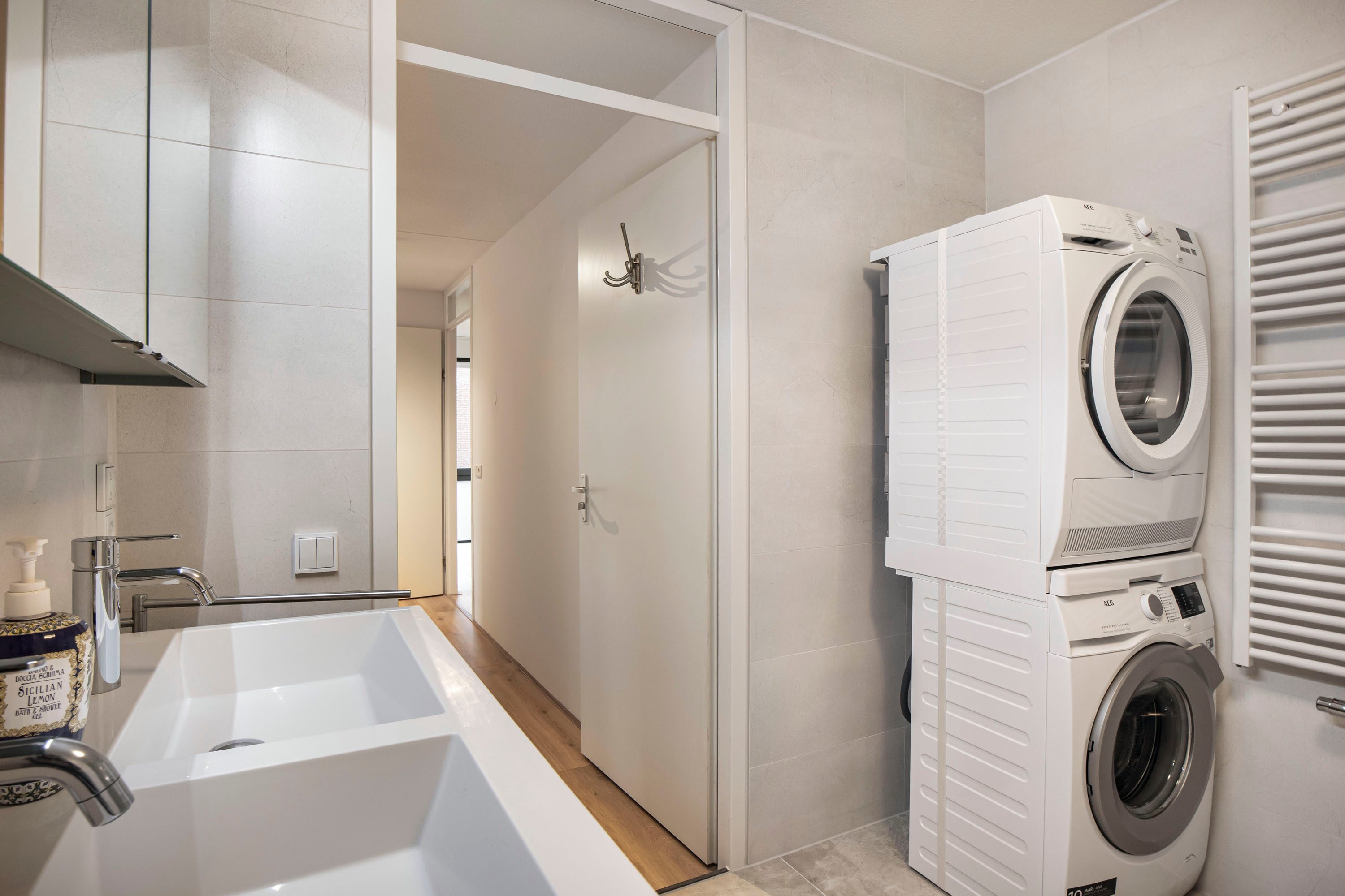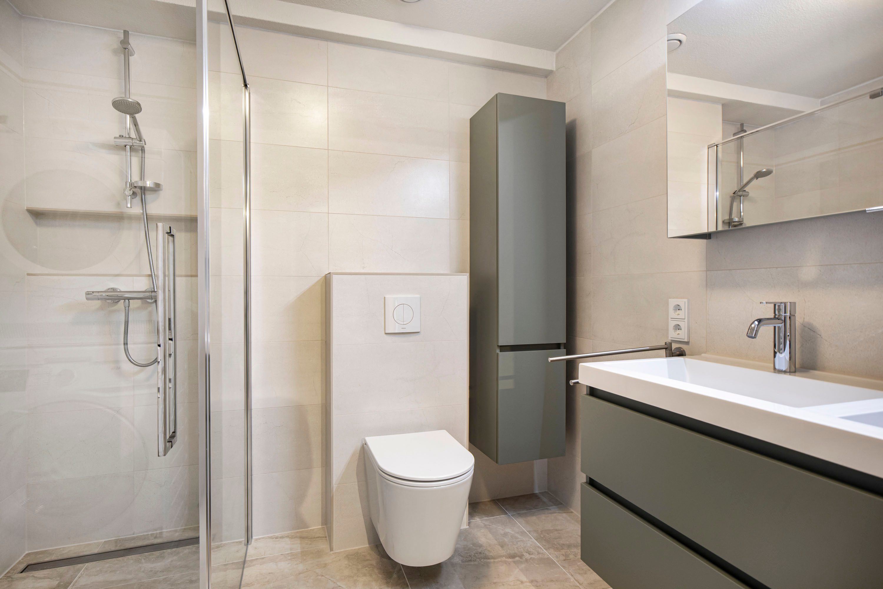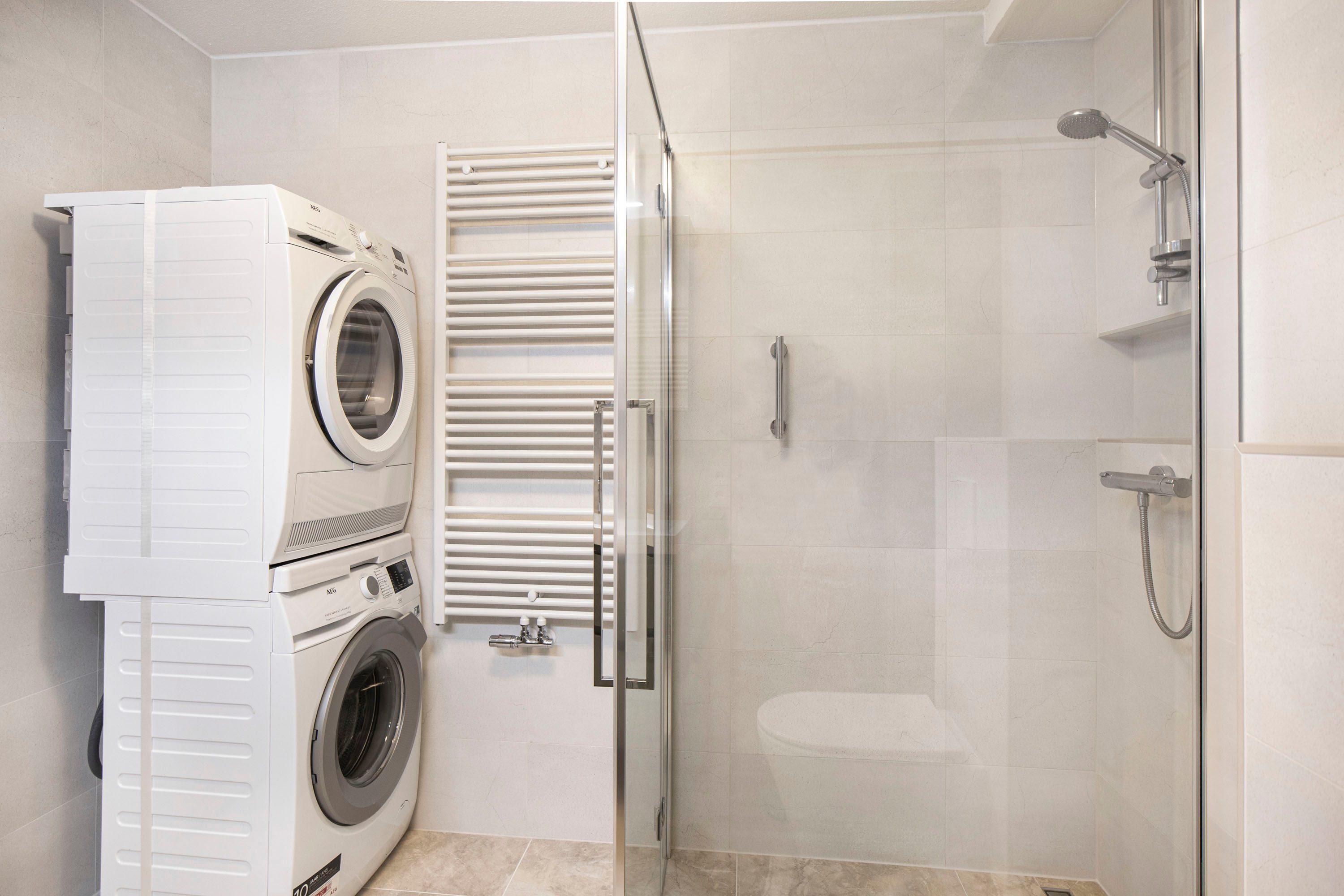 De nieuwe badkamer is compleet uitgevoerd en beschikt over een douche, toilet wastafel en aansluitingen voor wasmachine en droger.