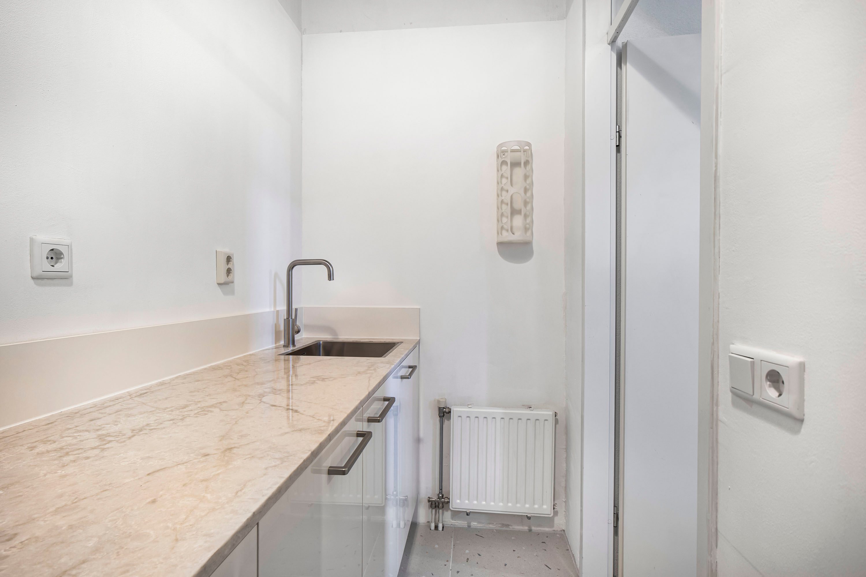 Aan de woonkamer grenst de nieuwe half open keuken (Nolte), die in verbinding staat met een praktische bijkeuken waar de C.V.-ketel is opgesteld. Daarnaast bevindt zich in de woonkamer bij de trapopgang nog een extra provisie-/bergruimte, ideaal voor voorraad of huishoudelijke spullen.
