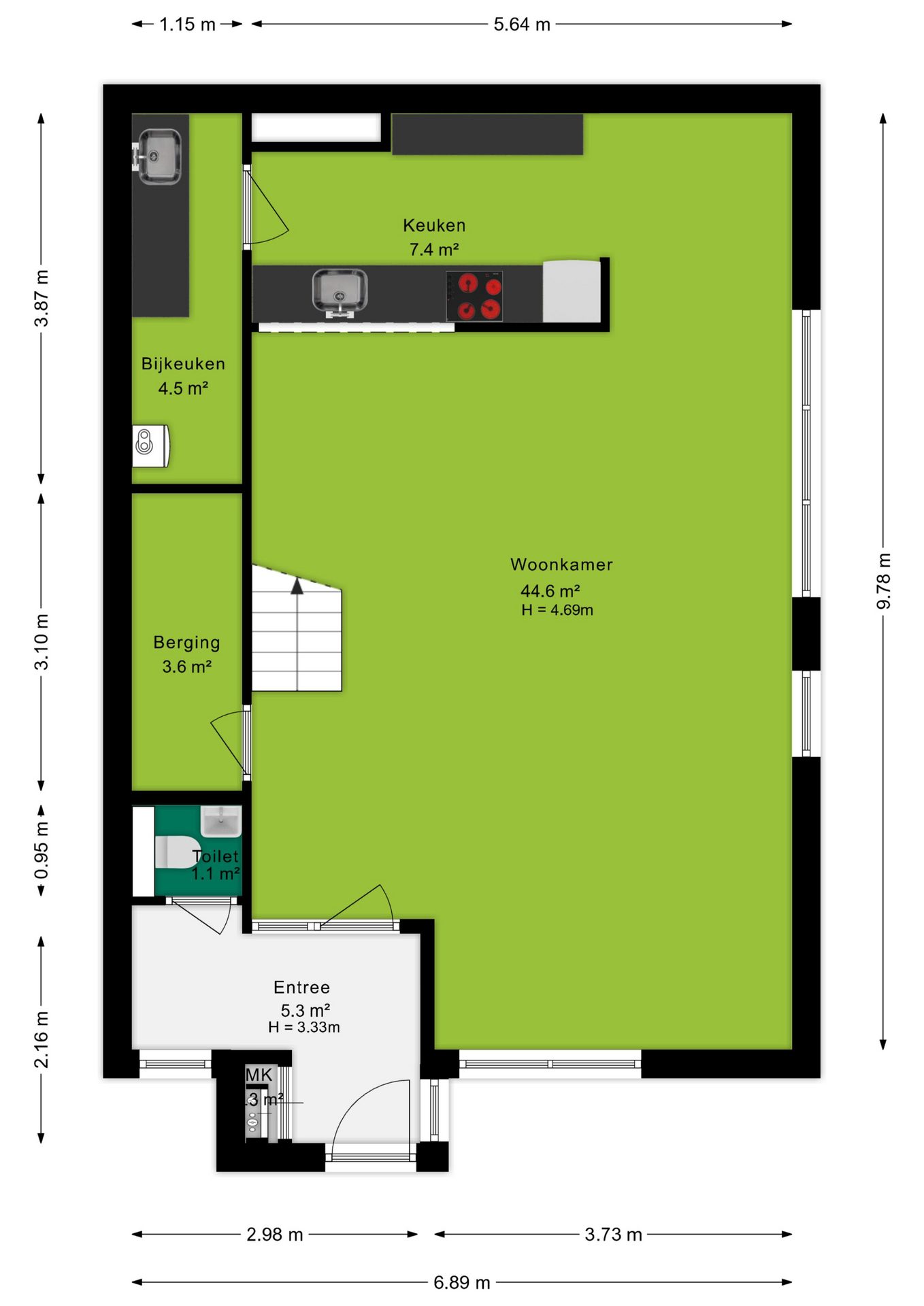 Via de entree op de begane grond kom je in de hal met toilet, meterkast en toegang tot de woonkamer.