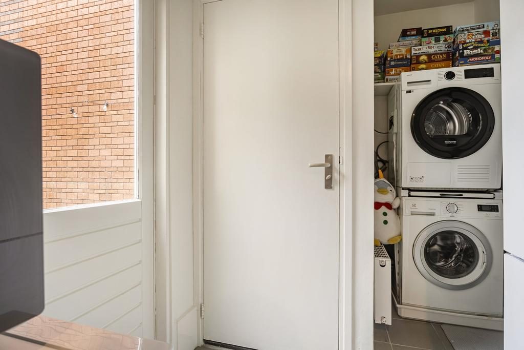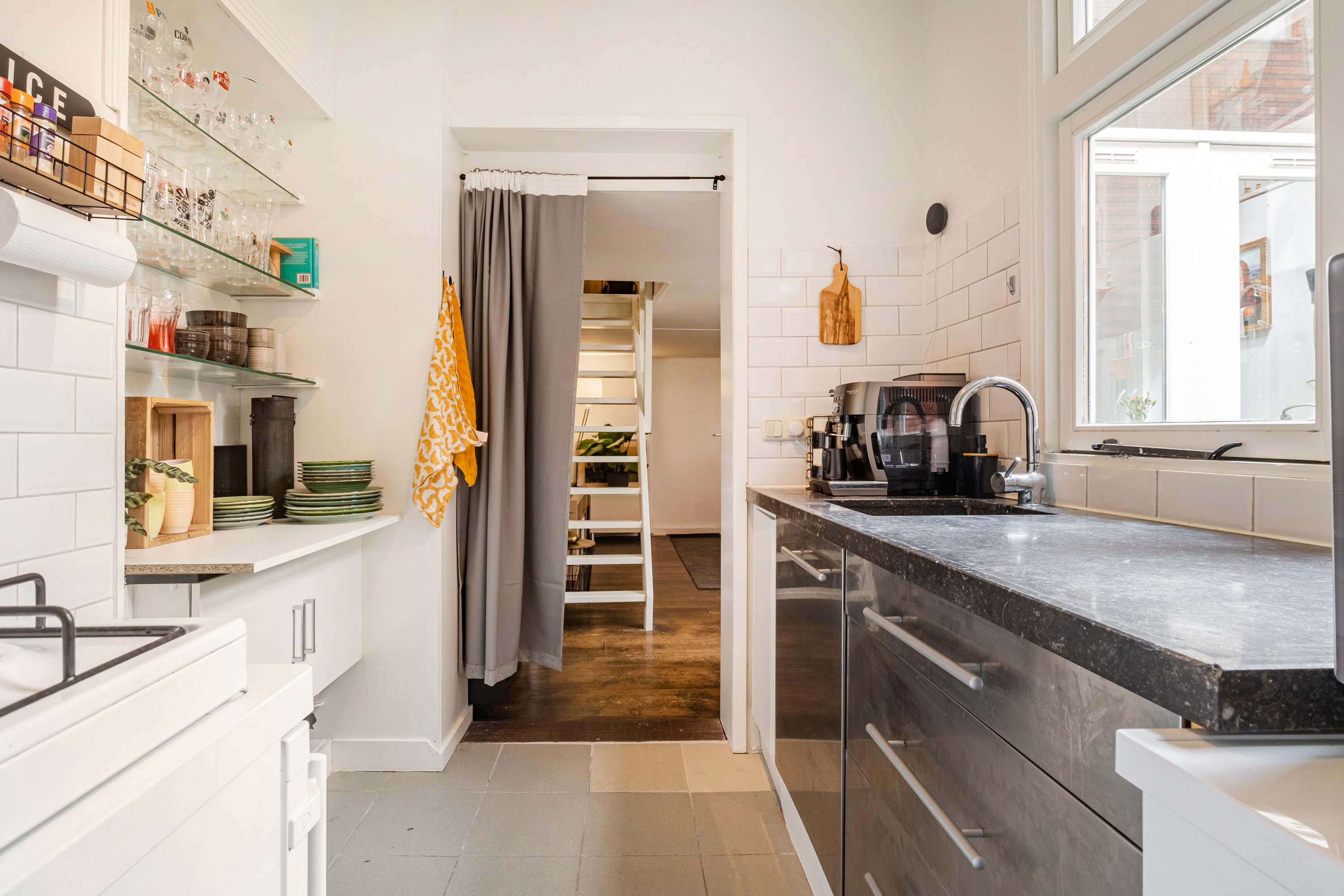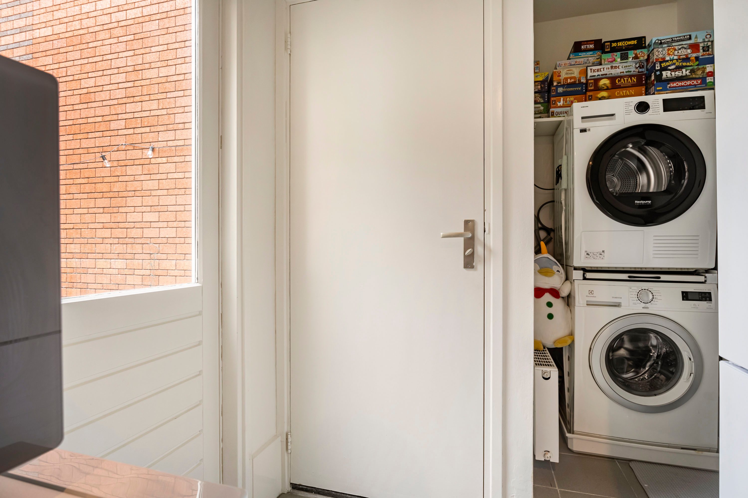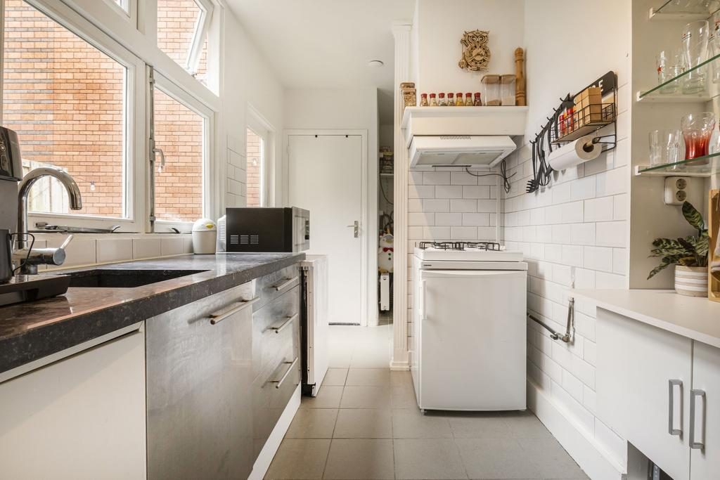 Bij binnenkomst loop je de lichte woonkamer binnen met een open vide en dubbele tuindeuren die uitkomen in je eigen tuin. Dankzij de hoge ramen geniet je hier de hele dag van prettig daglicht. Aan de achterzijde bevindt zich de keuken, met daarnaast een aparte ruimte voor was apparatuur en de cv-installatie. De keuken is eenvoudig van opzet maar netjes onderhouden.