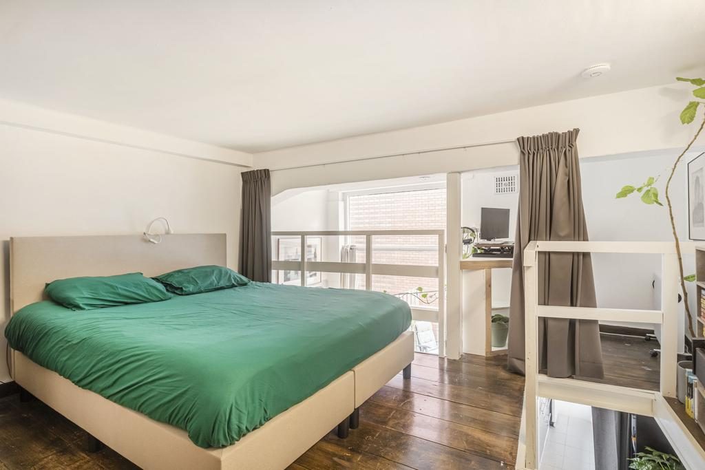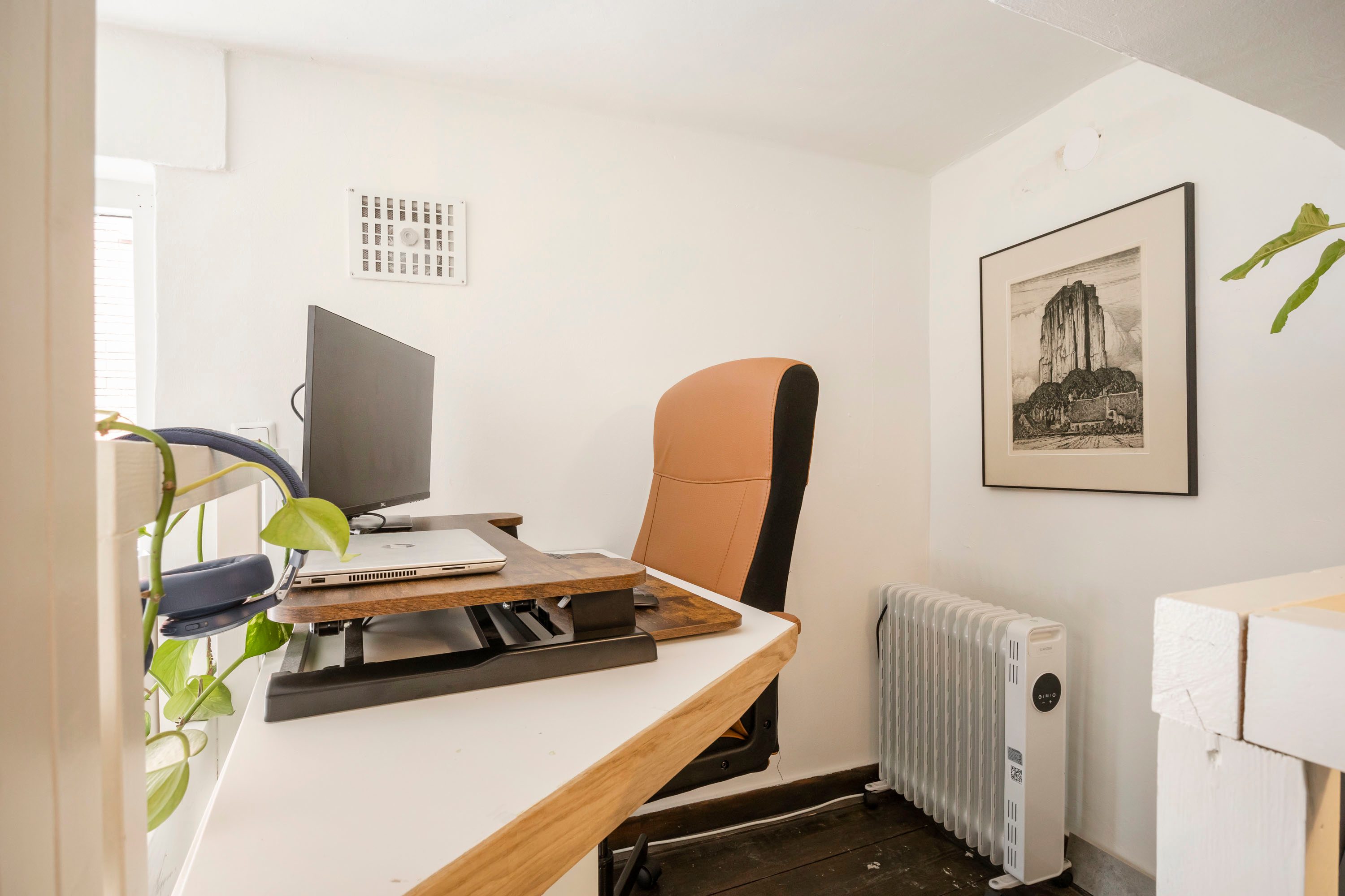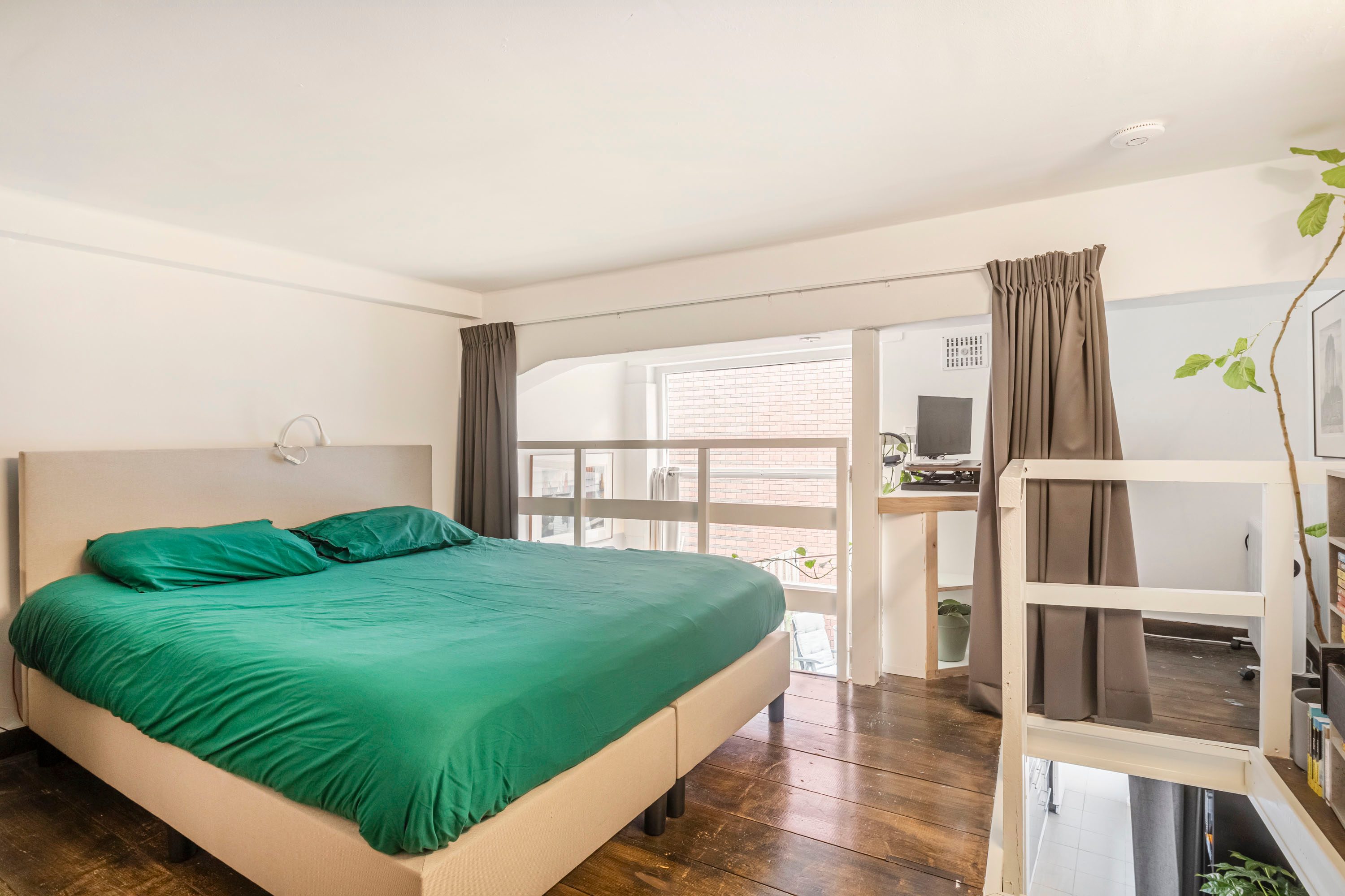 Via een vaste trap bereik je de open entresol, waar ruimte is gecreëerd voor een comfortabele werkplek en een ruim slaapvertrek met een aangrenzende badkamer.