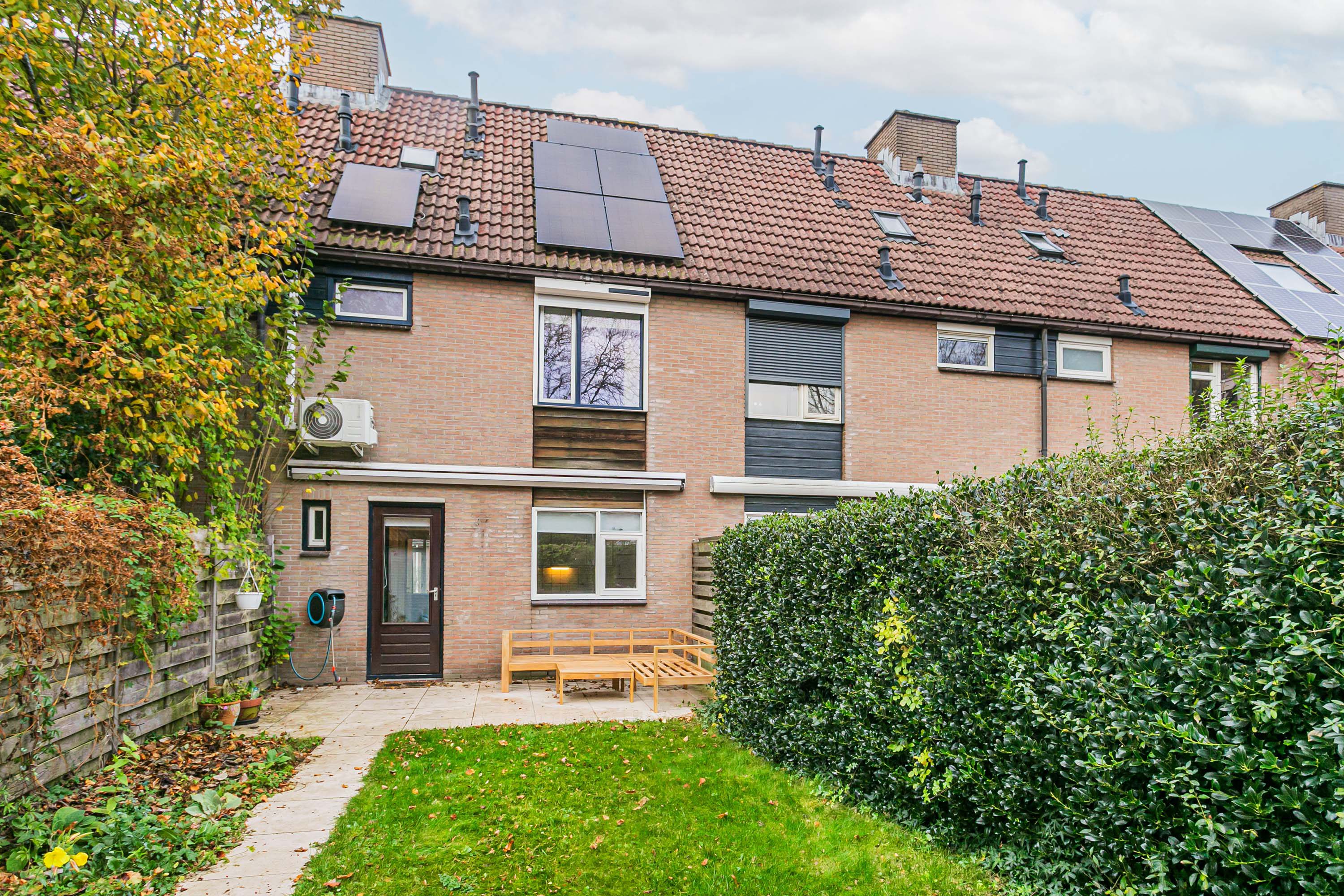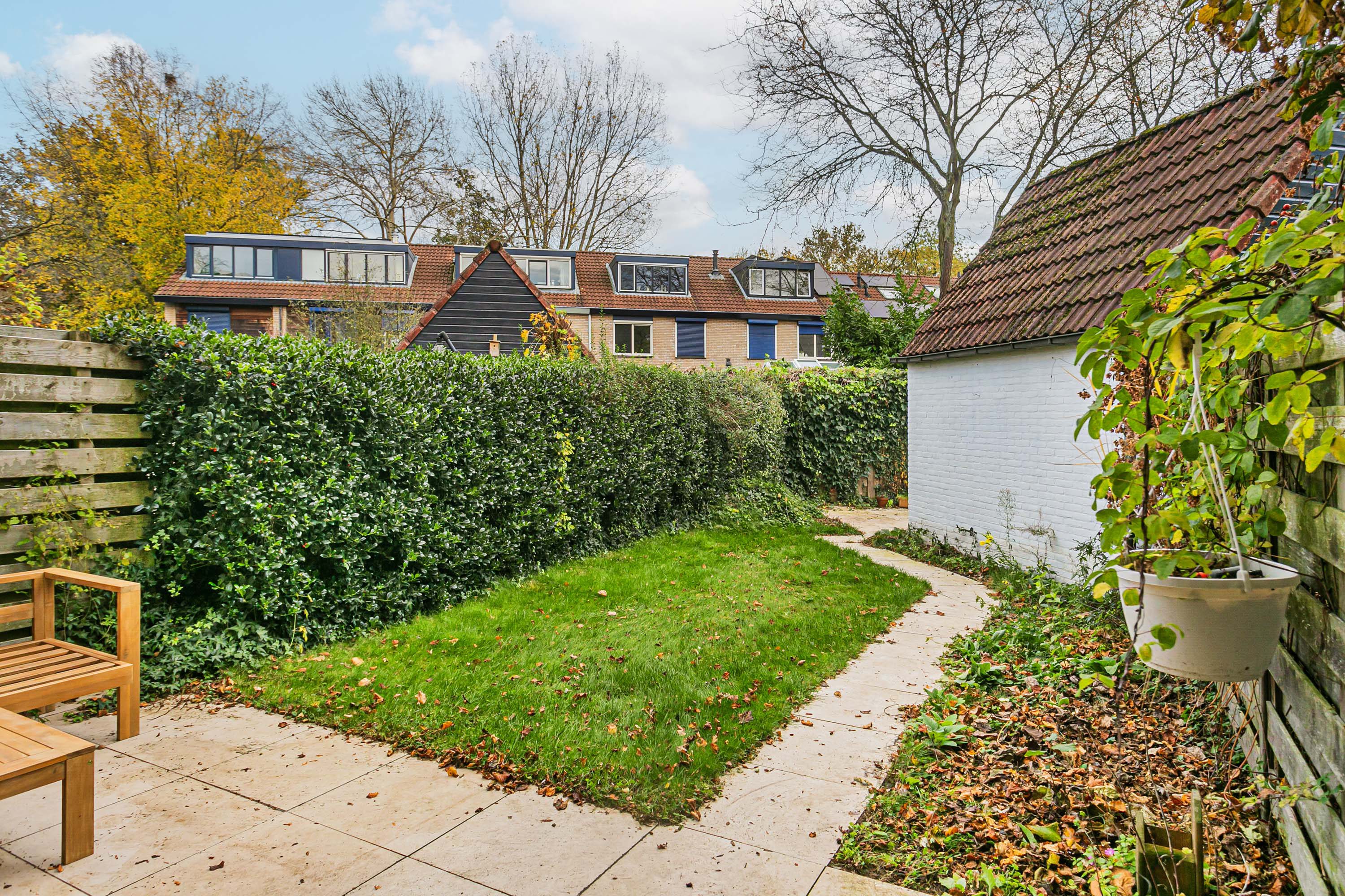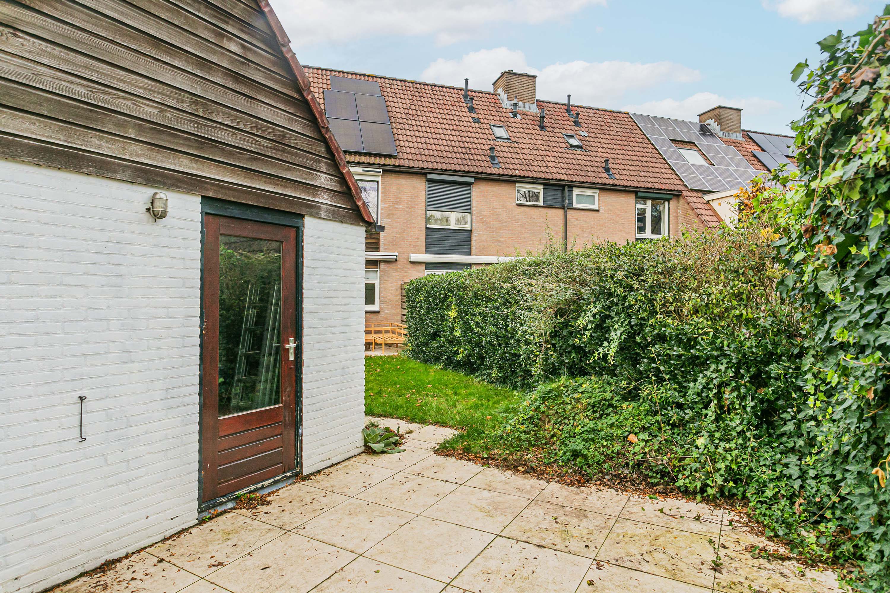 De achtertuin ligt op het zuiden en is via een achterom bereikbaar. Er is een zonnescherm aanwezig voor schaduw op warme dagen. Achterin de tuin staat een stenen berging van circa 6 m², voorzien van een kleine zolder voor extra opslag. De tuin biedt voldoende ruimte voor een terras en buitenleven.
