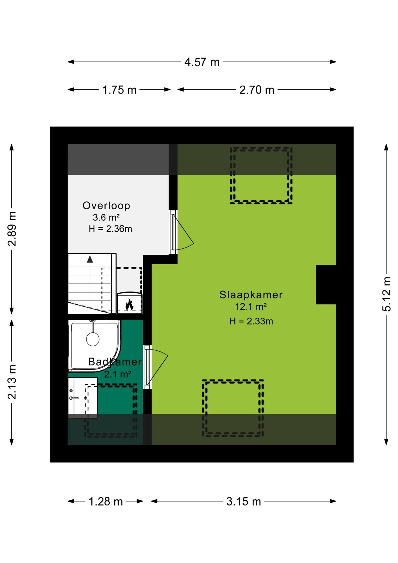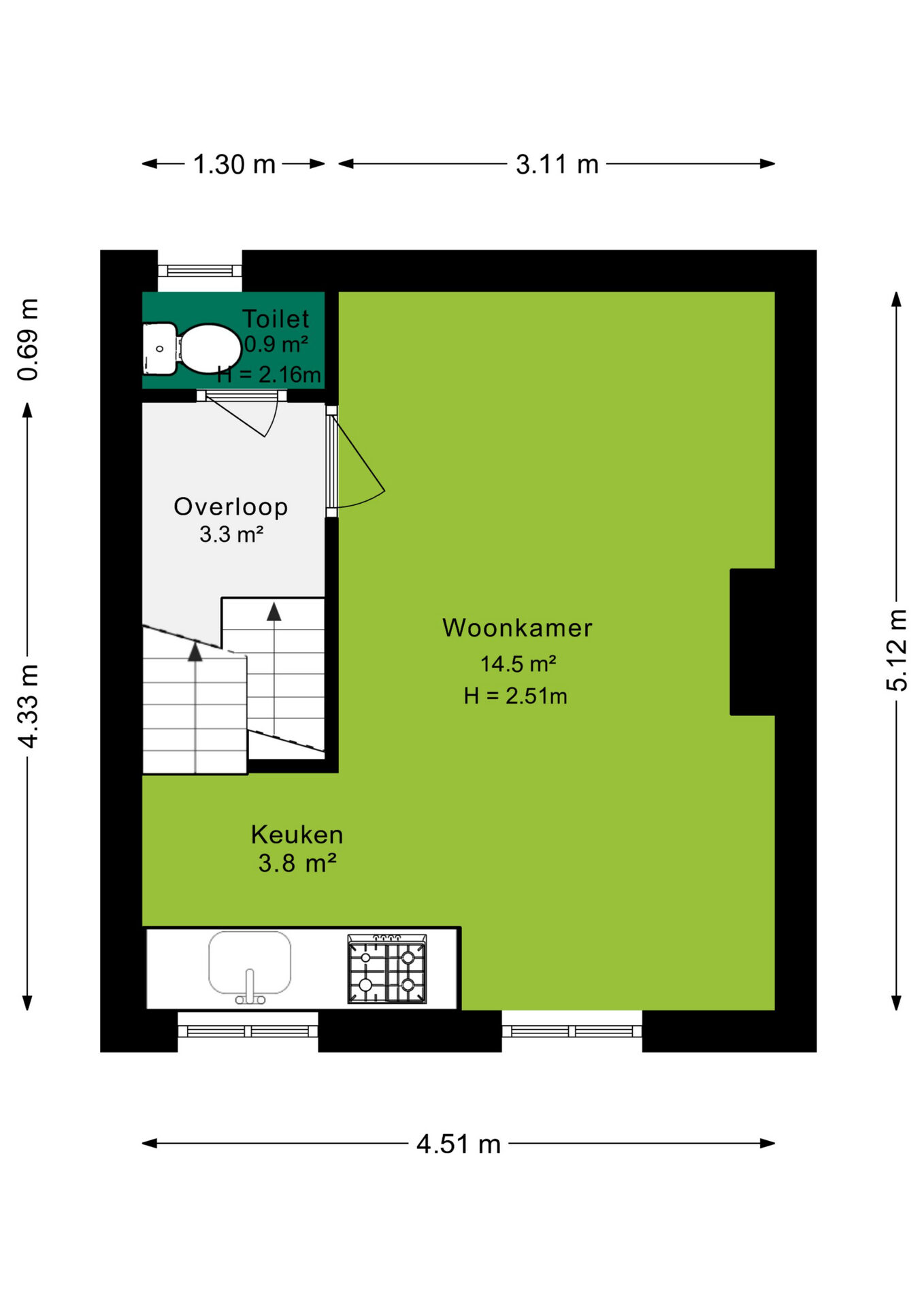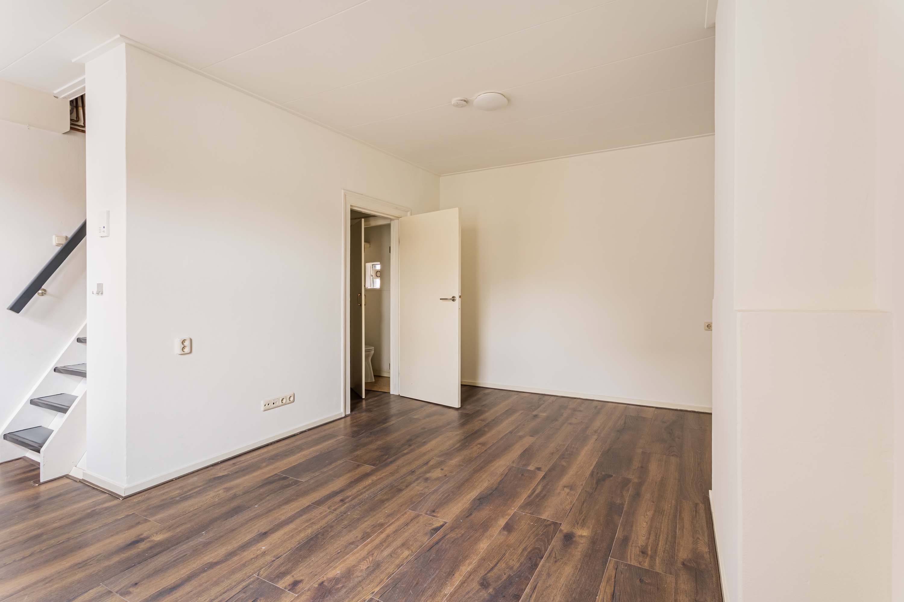 Middels de entree, met toegang naar de kelder, is via de trapopgang de eerste verdieping te bereiken. Op de eerste verdieping beschik je over een kleine overloop, met toegang naar de toiletruimte en de woonkamer. De woonkamer beschikt over een warme houtlook laminaatvloer met een open keuken. Door de raampartijen in de keuken ervaar je hier een prettig daglicht. Vanuit de keuken is de trapopgang naar de tweede verdieping te bereiken. Op de overloop tref je de C.V. opstelling, is via een losse trap de bergvliering te bereiken en is er toegang naar de slaapkamer. De ruime slaapkamer van circa 12m² en aansluitend de badkamer douche en wastafel. Zowel de slaapkamer als de badkamer beschikken over een Velux dakraam.