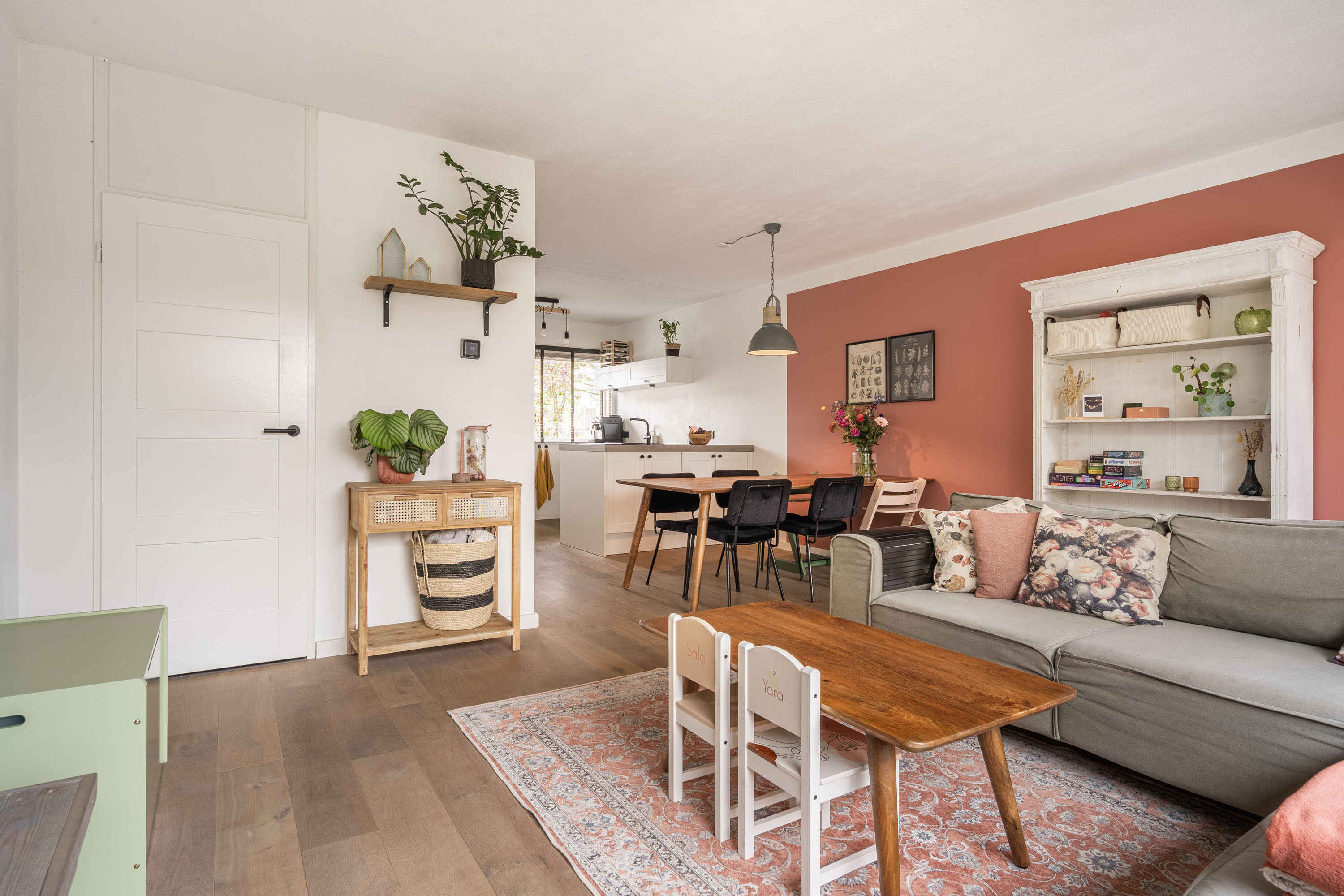Bij binnenkomst in de ruime hal voel je direct de fijne afwerking. De hal is voorzien van een toiletruimte, trapopgang naar de verdieping en biedt toegang naar de woonkamer met open keuken. De tuingerichte woonkamer is sfeervol ingericht met een houten vloer en voldoende ruimte voor een gezellige zithoek, speelhoek voor de kinderen en het plaatsen van een 6-persoons eettafel. Vanuit de woonkamer is er toegang naar de achtertuin. Daarnaast is de praktische trapkast is ideaal voor extra voorraad en opbergruimte. De keuken, geplaatst in 2021, is opgesteld in een lichte kleuropstelling met een kastenwand en keukenblok met geïntegreerde kookplaat met afzuiging en diverse inbouwapparatuur zoals o.a. een koel-/vriescombinatie, combi-oven, vaatwasser en een kokend waterkraan. Door deze opstelling heb je tijdens het koken een open verbinding met de woonkamer, ideaal voor als er visite is om gezellig te tafelen, of om een oogje in het zeil te houden naar de kinderen. De kasten bieden voldoende opslagruimte voor het kookgerei.