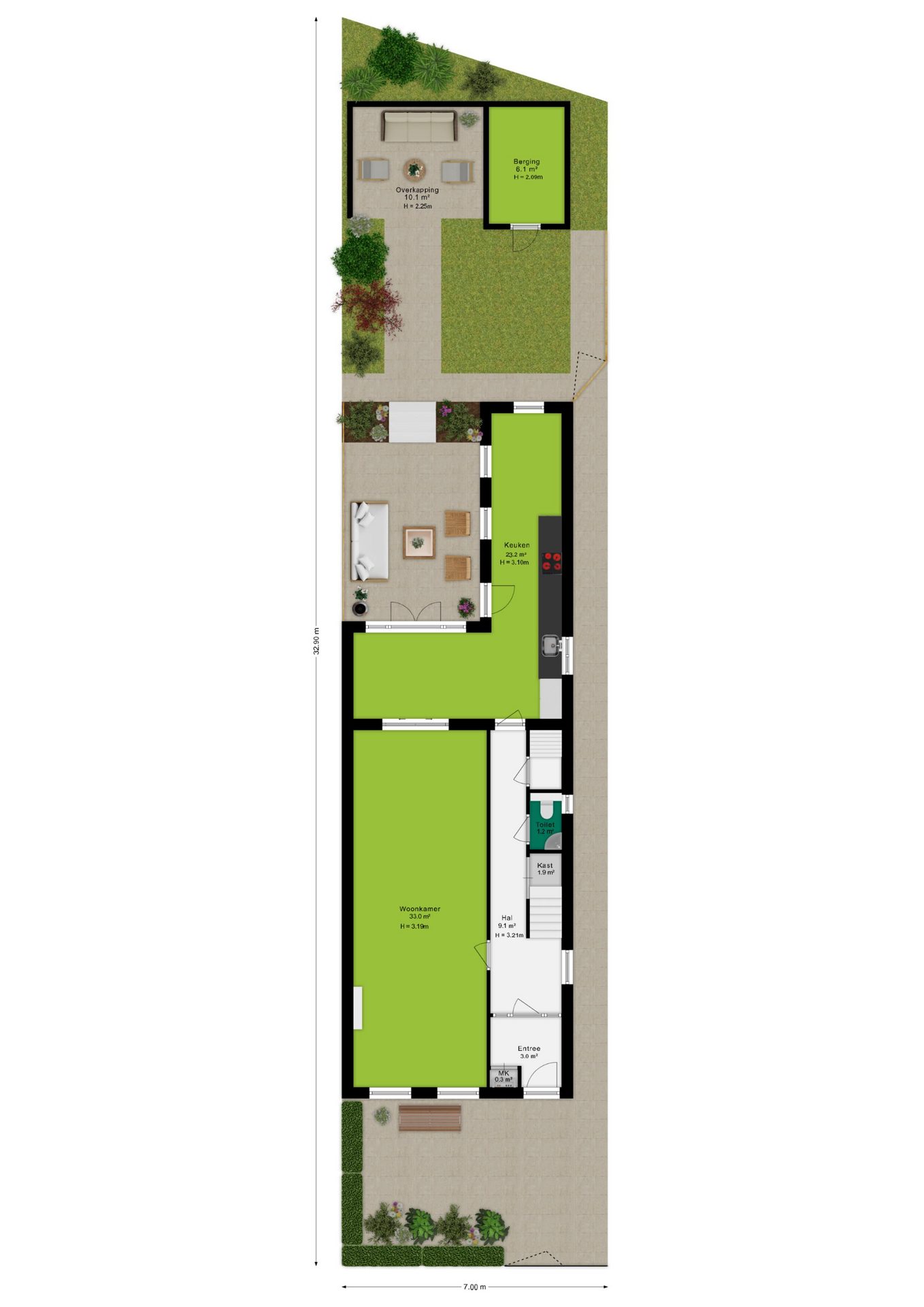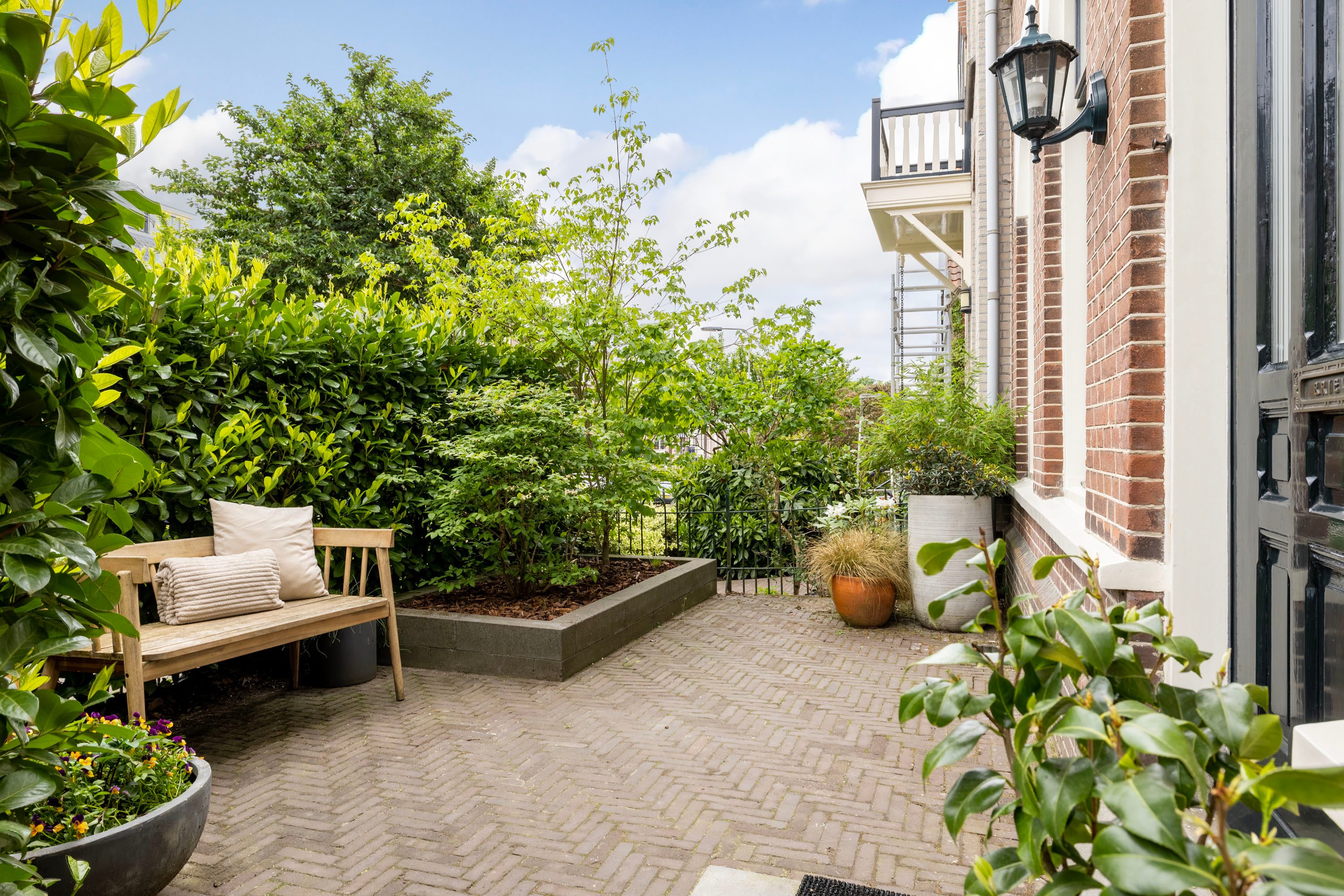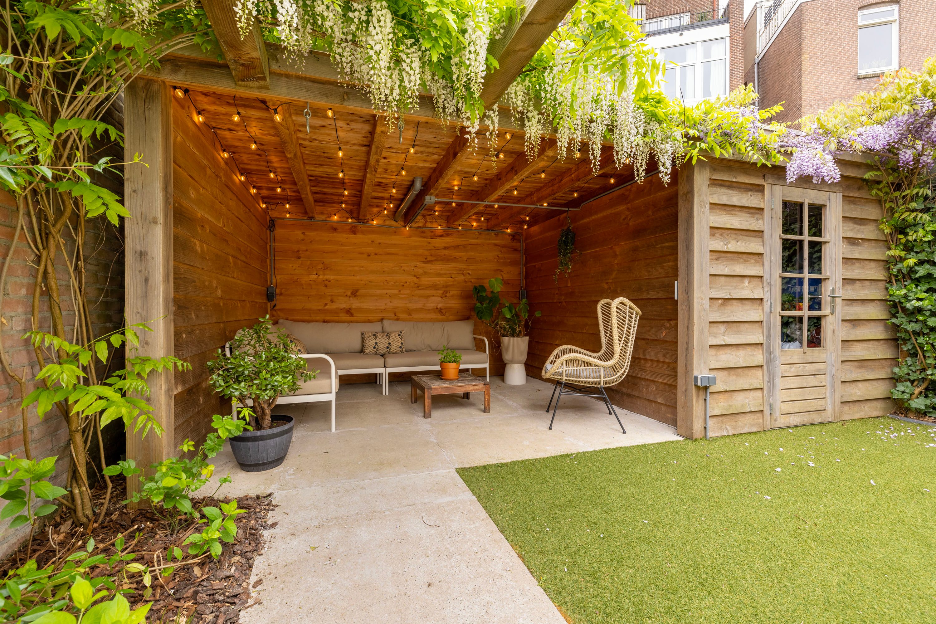 De fraai aangelegde tuin is in 2023 volledig vernieuwd en ligt perfect op het zuiden. Je vindt er een ruim terras, groene borders en achterin een sfeervolle veranda met een zitplek en een praktische berging. De tuin is ook bereikbaar via een handige achterom, met voldoende ruimte voor het stallen van fietsen en afvalcontainers. Aan de voorzijde beschikt de woning over een knusse, groene voortuin die zorgt voor een prettige buffer met de straat en extra sfeer.