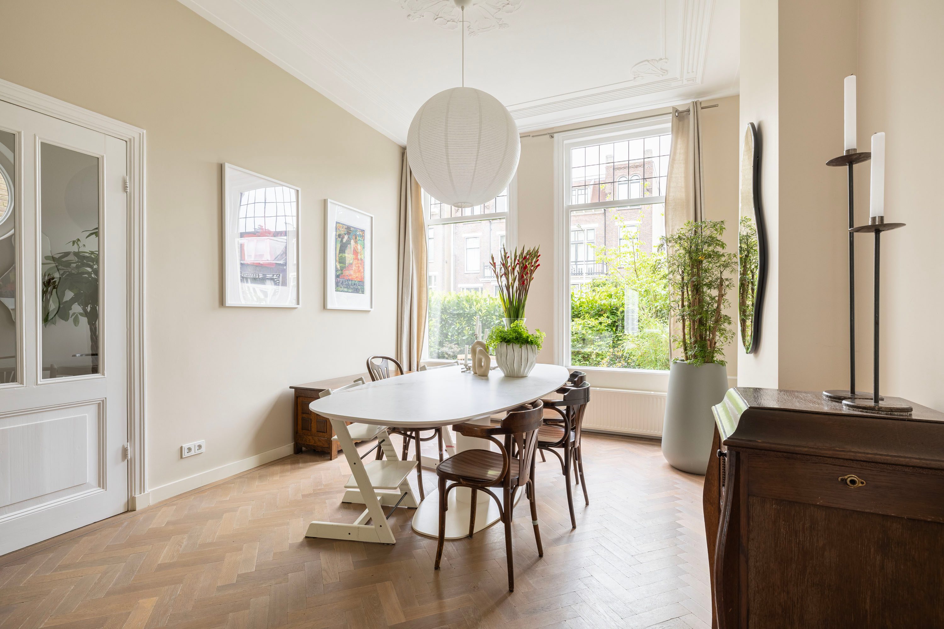 Entree via een vestibule met originele details en dubbele paneeldeuren naar de ruime hal met garderobe, trapopgang, modern toilet en toegang tot de kelder. De lichte en ruime woonkamer heeft een eiken visgraatvloer met vloerverwarming, hoge ornamentenplafonds en en-suite deuren naar de serre. Deze serre, met openslaande deuren naar de tuin, is ideaal als leeshoek of speelruimte. De open keuken (2021) is strak en modern en voorzien van hoogwaardige inbouwapparatuur, waaronder een Quooker, inductiekookplaat, combi-ovens, vaatwasser en dubbele koel-vriescombinatie – naadloos geïntegreerd in het ontwerp.