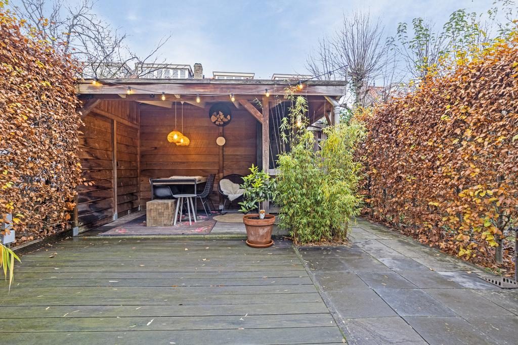De heerlijke achtertuin is gelegen op het noorden en in de zomer is er door de diepte altijd wel een plekje in de zon of schaduw te vinden. Door de fijne afmeting is het mogelijk om eventueel een speelplekje te creëren. Achter in de tuin staat een gezellige veranda voorzien van elektra en een gootsteen met kraan. Ook is er een stenen schuurtje om bijvoorbeeld fietsen in te plaatsen. Een tuindeur verschaft toegang achterom.