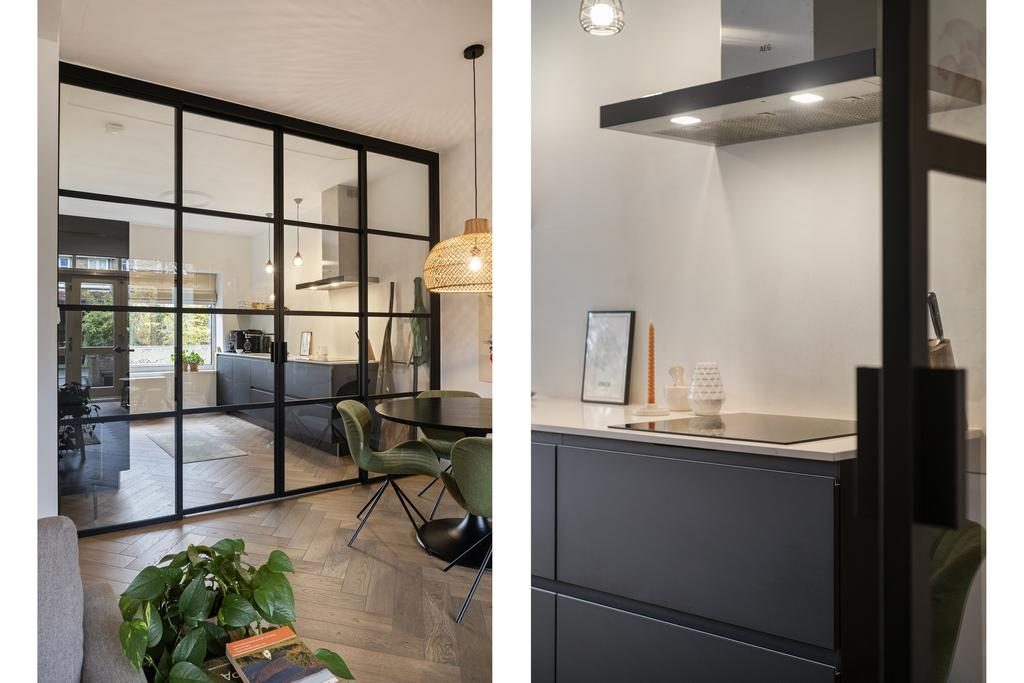 Via de entree met hal, meterkast en toilet bereik je de sfeervolle woonkamer. Deze heeft een afmeting van 29,5m², is voorzien van een visgraatvloer en heeft heerlijk veel lichtinval. Door de fijne afmeting is er ruimte genoeg voor een eettafel. De keuken kan afgesloten worden door middel van een gave stalen scheidingswand, die een chique uitstraling aan het geheel geeft. De moderne keuken is voorzien van de volgende inbouwapparatuur: een inductiekookplaat, afzuigkap, oven, combi-oven/magnetron, koel-vriescombinatie, vaatwasser en een Quooker.