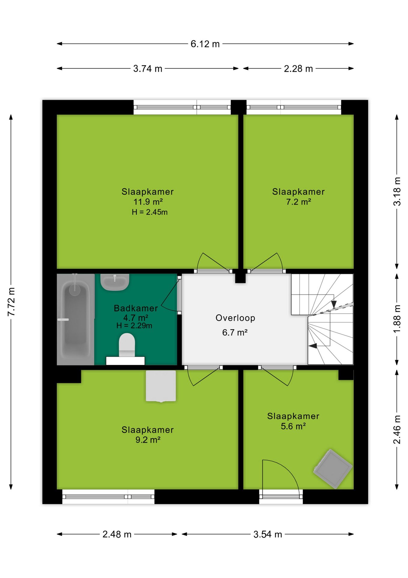 De overloop geeft toegang tot de 4 (slaap)kamers en de badkamer. De slaapkamers hebben een afmeting van ca. 12m², 9m², 7m² en 6m². De slaapkamer van circa 6m² leent zich uitstekend als werk of babykamer. De badkamer is volledig betegeld in een lichte kleurstelling en beschikt over een ligbad met douchefunctie, wastafel en toilet.