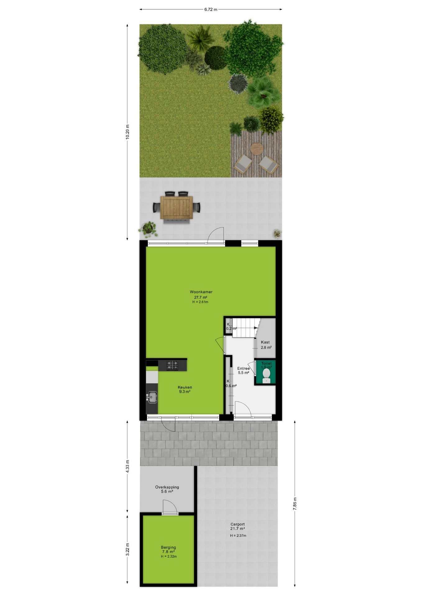 De achtertuin is gelegen op het zuidoosten en beschikt over genoeg plek voor gezellig zitplekjes, het plaatsen van een eettafel of speelplekjes voor de kinderen. Aan de voorzijde van de woning beschik je over een berging met overkapping en carport waar je de auto kan parkeren. Ook het krabben van je autoruiten is verleden tijd doordat je je auto onder de carport kan parkeren.