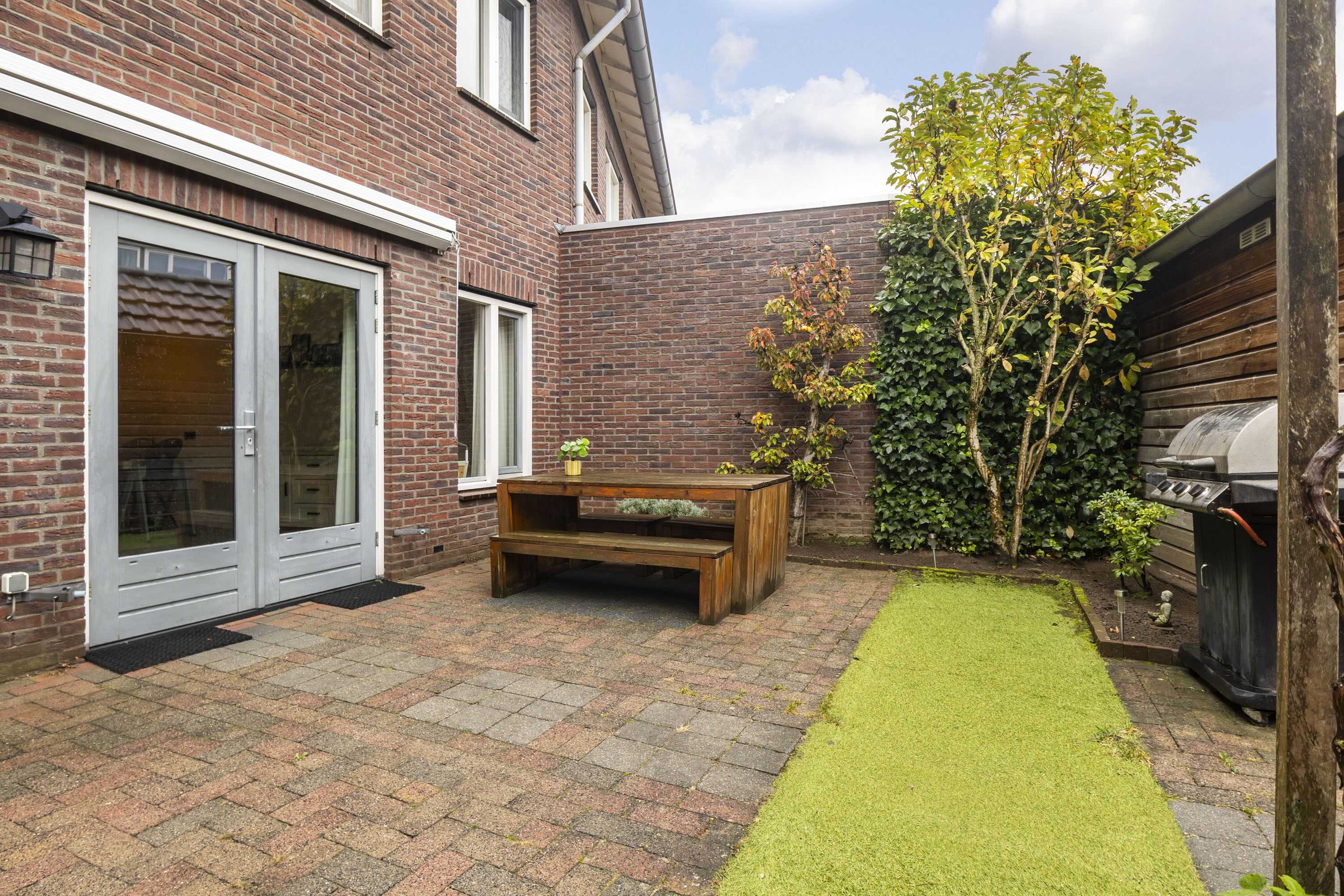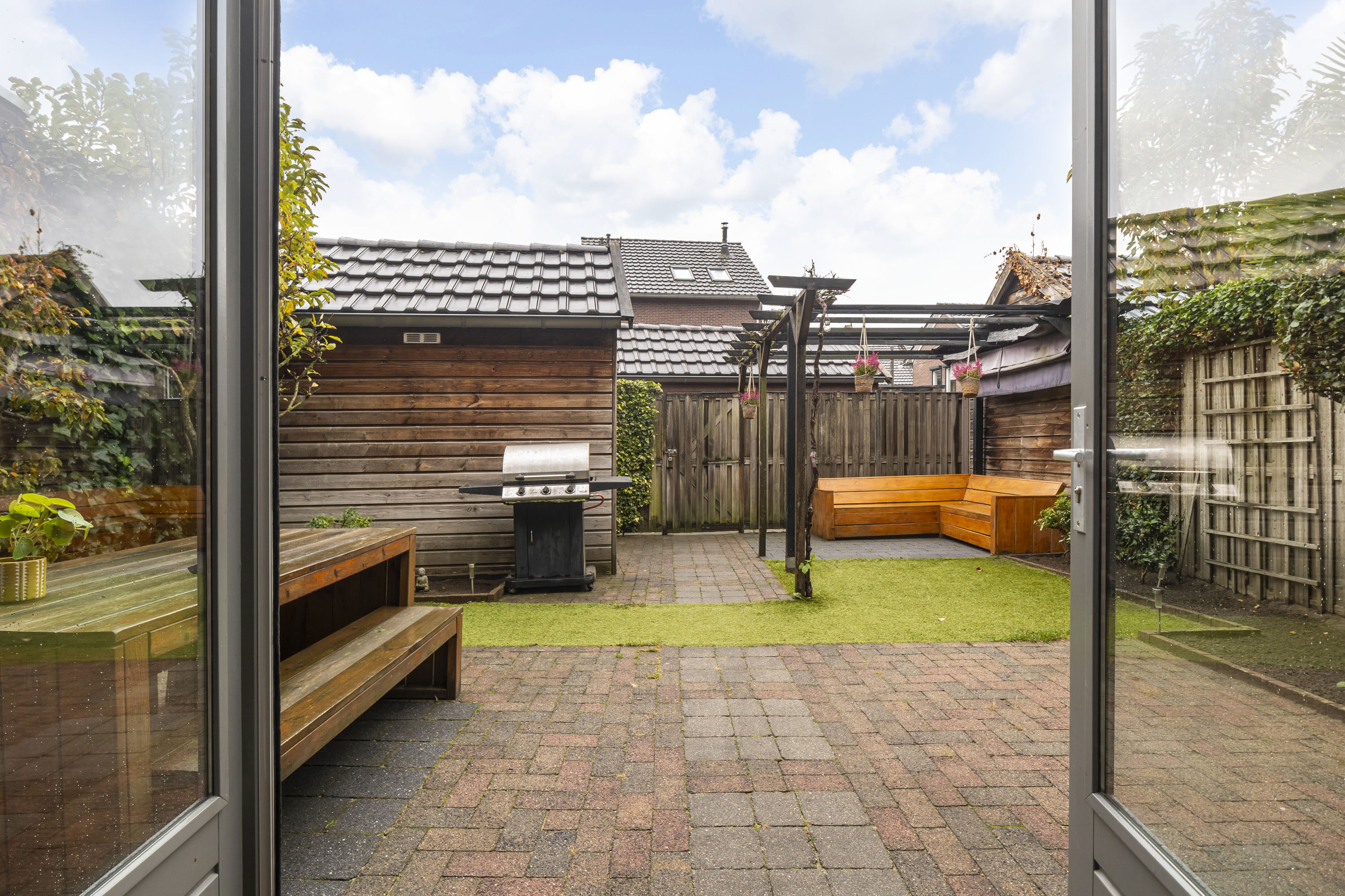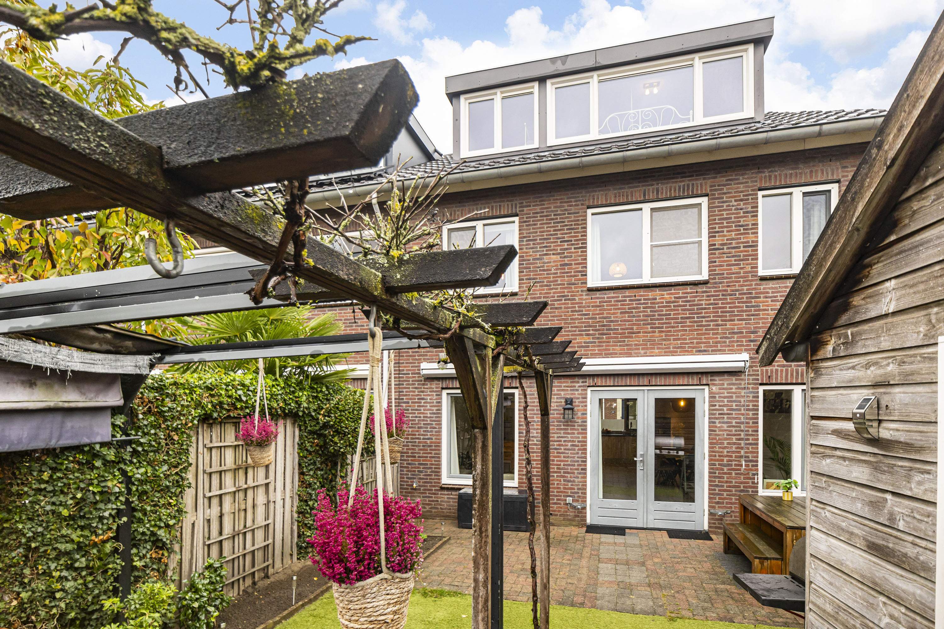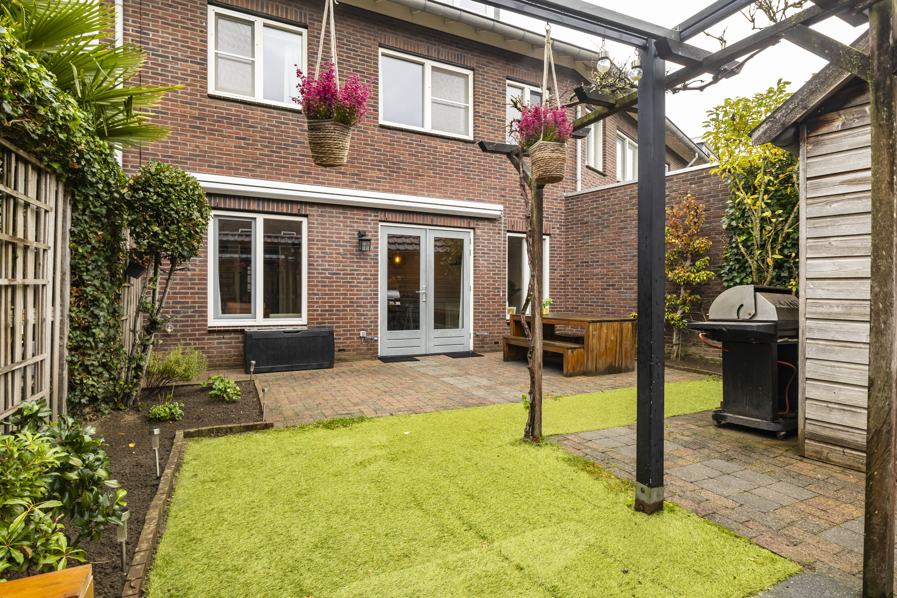 De achtertuin op het zuiden is een heerlijke plek om te ontspannen. De tuin is onderhoudsvriendelijk aangelegd met een gezellige loungehoek en groene borders. Hier geniet je volop van de zon, of het nu gaat om een lange zomeravond of een barbecue met familie en vrienden. Achterin de tuin staat een houten berging (ca. 10 m²), perfect voor fietsen, tuinspullen en kinderspeelgoed. Via de achterom is de tuin ook van buitenaf bereikbaar.