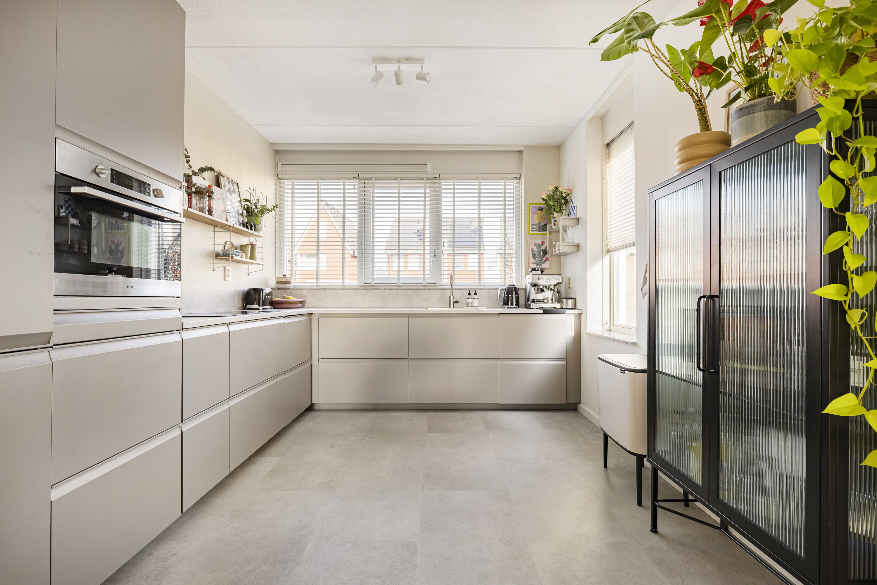 Via de hal, met meterkast en toilet, bereik je de woning. De tuingerichte woonkamer is voorzien van een sfeervolle houten vloer. De grote raampartijen zorgen voor een mooi lichtinval en de openslaande deuren creëren een effect wat de tuin een verlengstuk van de woonkamer maakt. Door de prettige afmeting is er ruimte genoeg voor een grote eettafel en ontstaat er een gezellige verbinding met de woonkeuken. De open keuken is gelegen aan de voorzijde, geplaatst in 2023 en beschikt over een moderne keuken in hoekopstelling. De keuken is luxe en stijlvol uitgevoerd in een lichte kleurstelling. Met de aanwezige raampartijen ervaar je hier een fijn lichtinval en kijk je gezellig uit over de straat. De aanwezige inbouwapparatuur betreft o.a. een kookplaat met geïntegreerde afzuiging, combi-oven/magnetron, koel-vriescombinatie en een vaatwasser.
