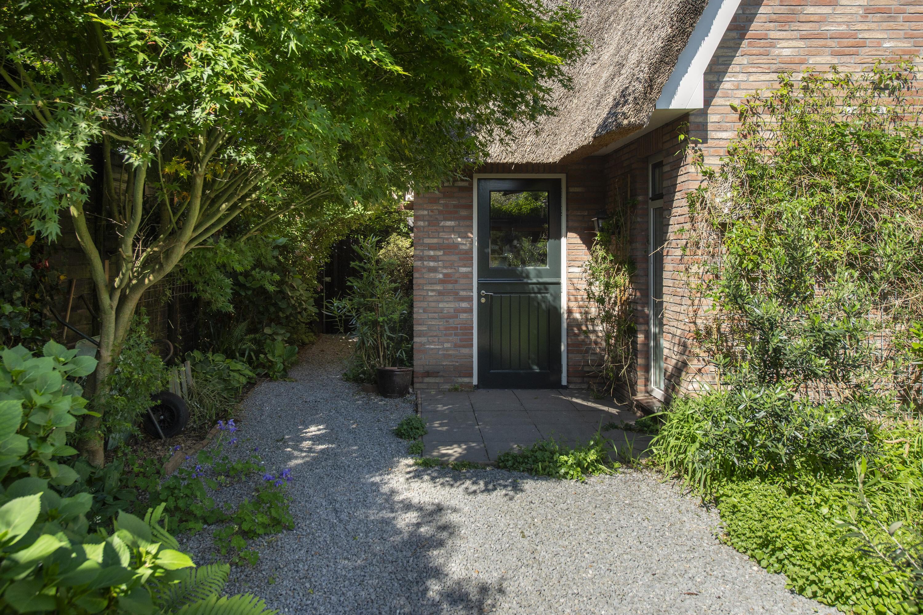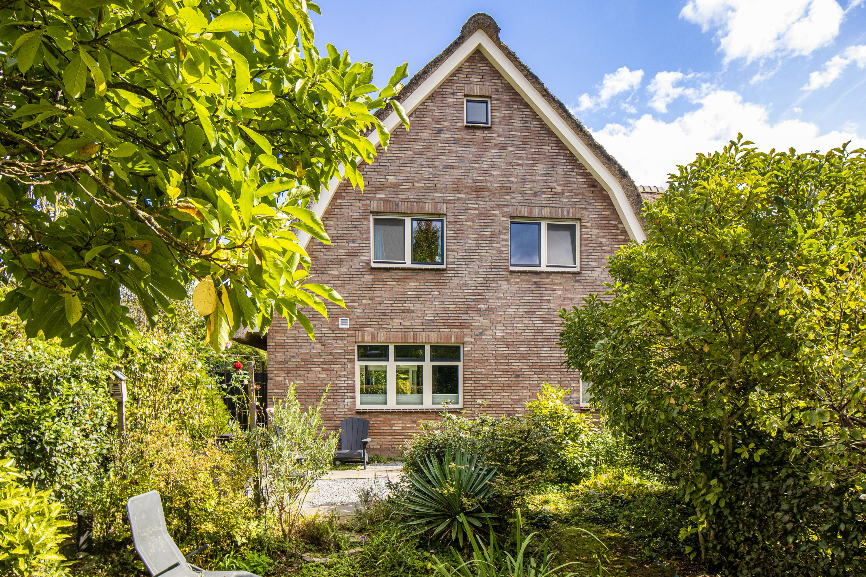 Aan de voorzijde van de woning bevindt zich de oprit, uitgerust met een laadpaal voor een elektrische auto. De oprit biedt voldoende ruimte om twee auto’s op eigen terrein te parkeren. De voortuin is omgeven door diverse beplanting, wat zorgt voor privacy, en ook hier is fijn terras waar je kunt genieten in de zon.
